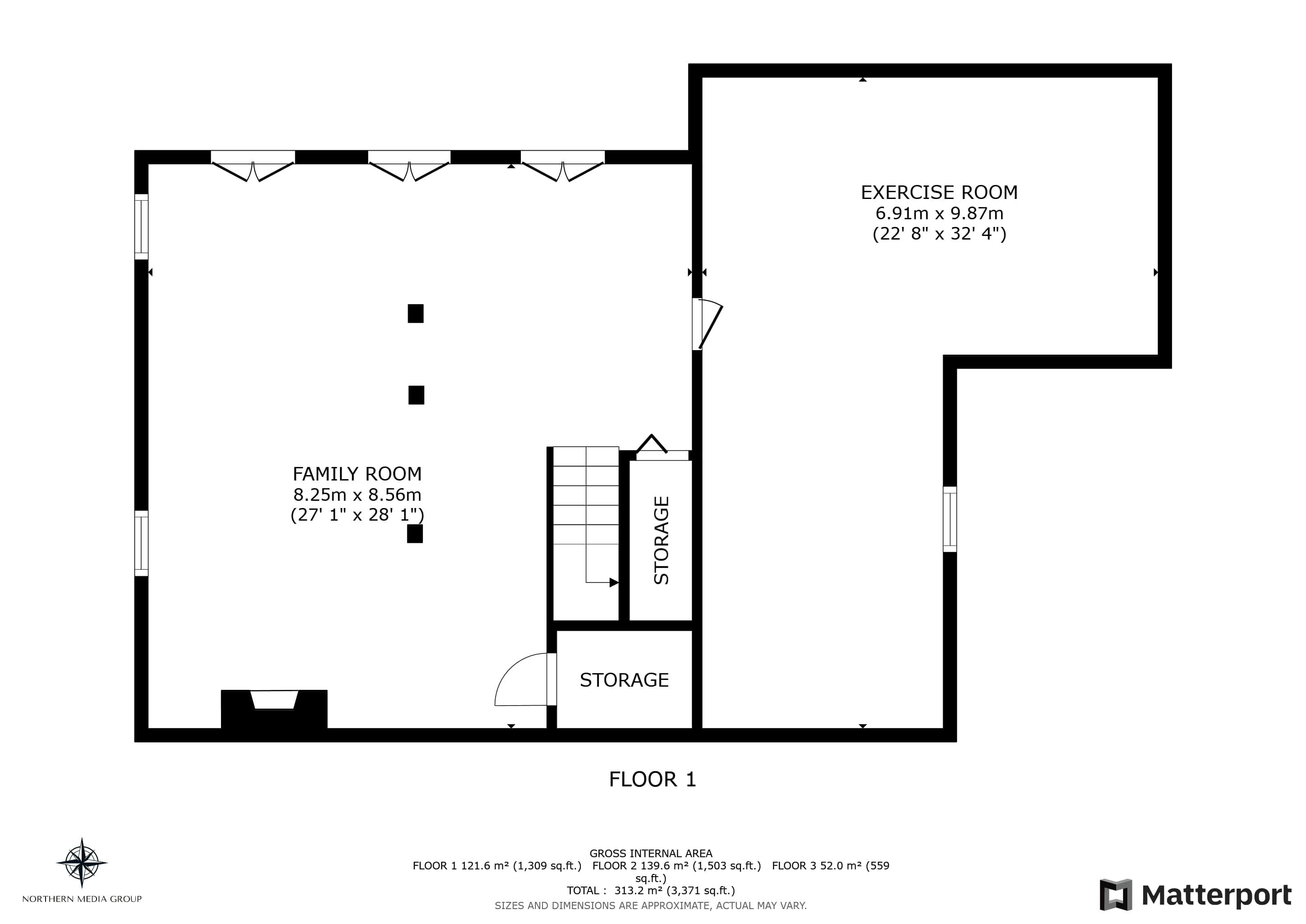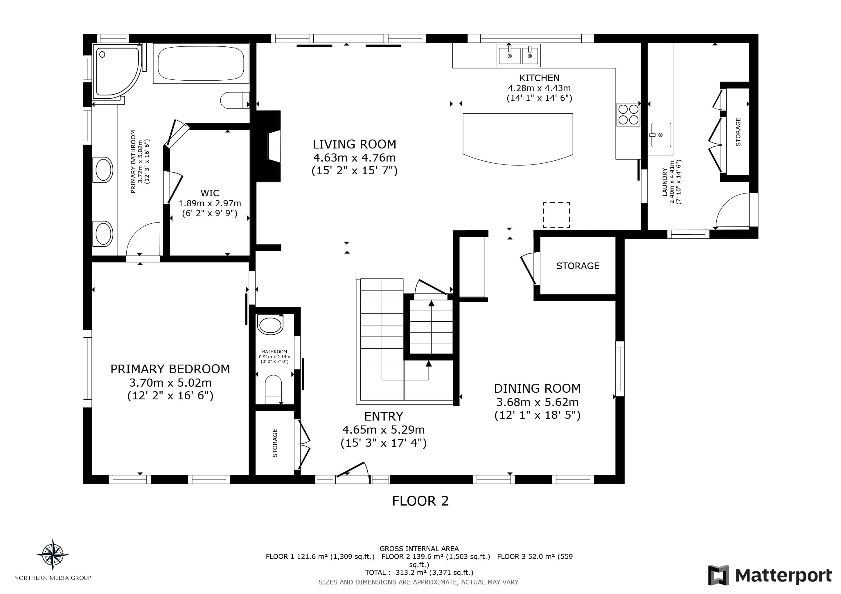 • Bright living room features a floor-to-ceiling propane fireplace.