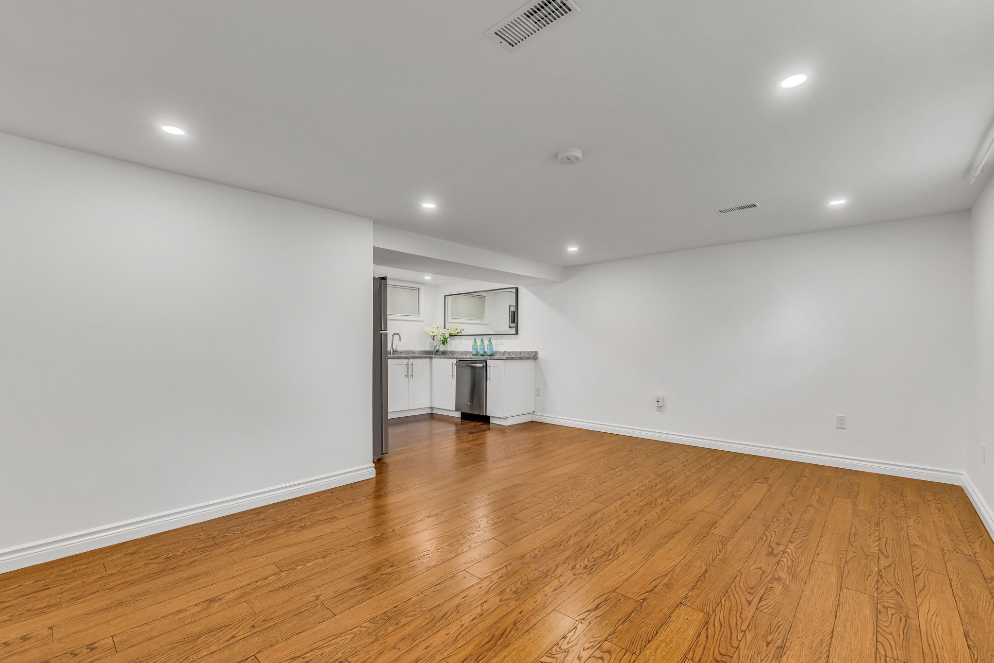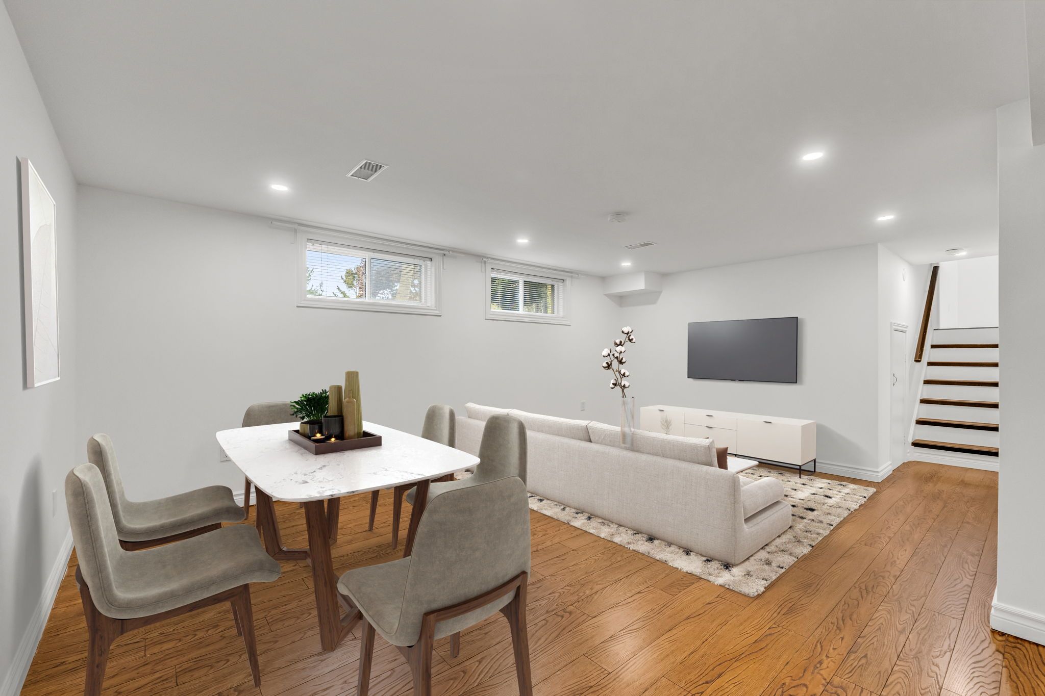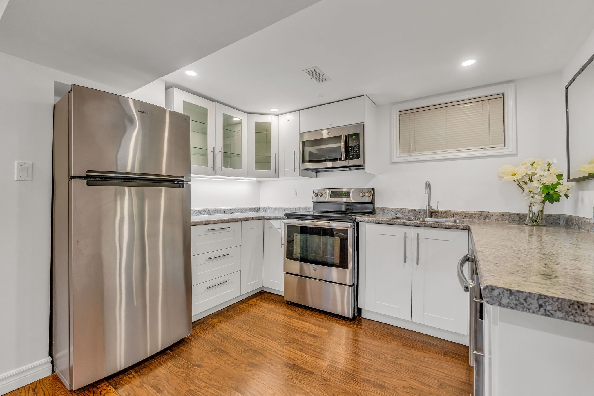 2-level legal basement apartment - ground & lower levels that don't feel like a basement. Professionally finished 1 bed + 1 bath: with private separate entrance in one of burlington's most desirable areas. The large open concept layout offers large oversized windows, modern kitchen with stainless steel appliances: fridge, stove, b/i microwave and dishwasher. A spacious living room & dining area. 3 piece bathroom with shower connected to a private in-suite laundry. Modern laminate flooring and led pot-lights throughout. 1 designated parking space included. Backyard & garage is not part of tenant use. Tenant pays for 50% of all utilities. An excellent apartment for a young professional. No smoking. Minutes away from the qew, 403 & applebygo transit. Looking for a++ tenants. Rrea is the landlord. (virtually staged)