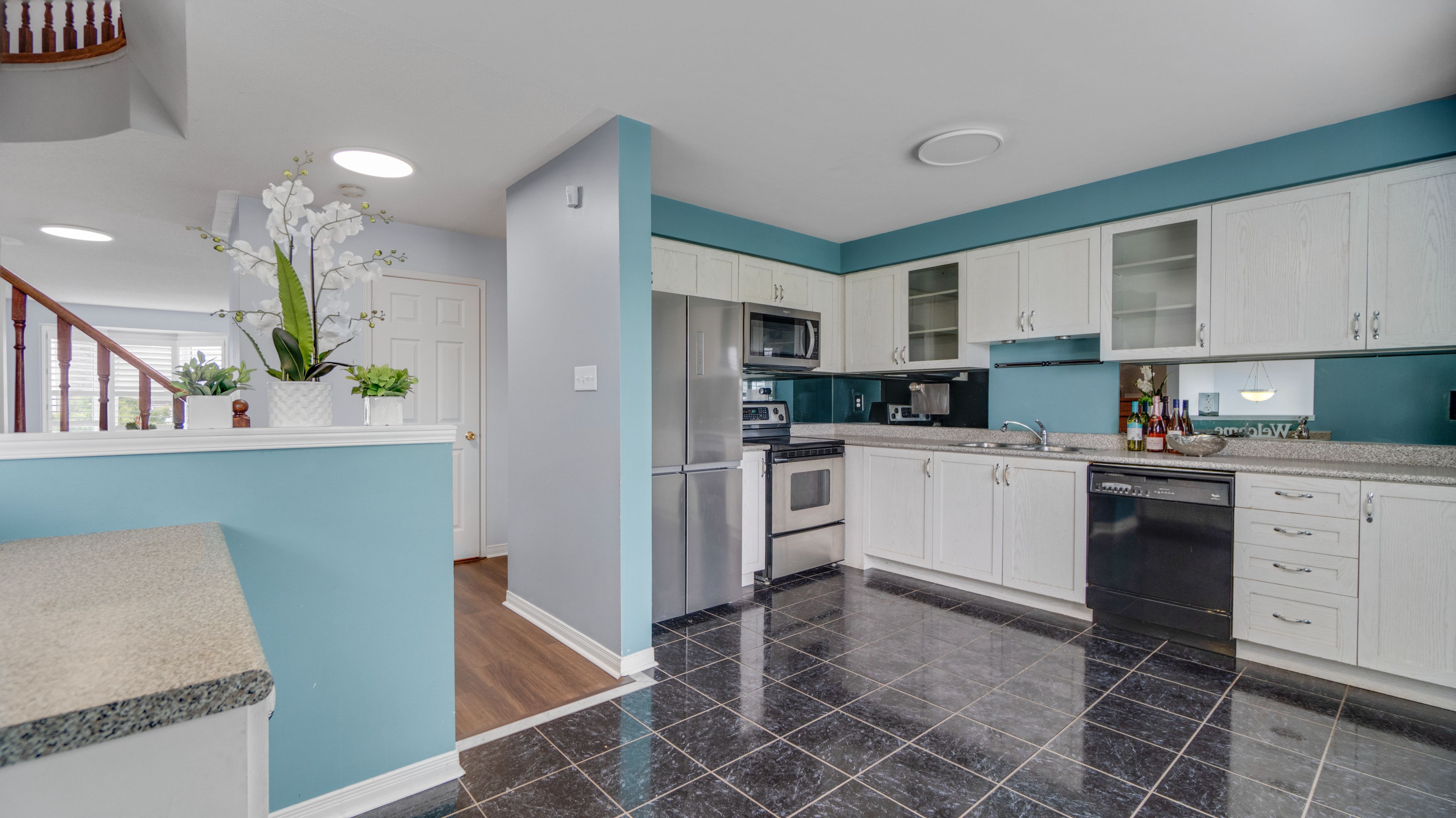 • Gourmet kitchen with quartz counters and stainless-steel appliances.