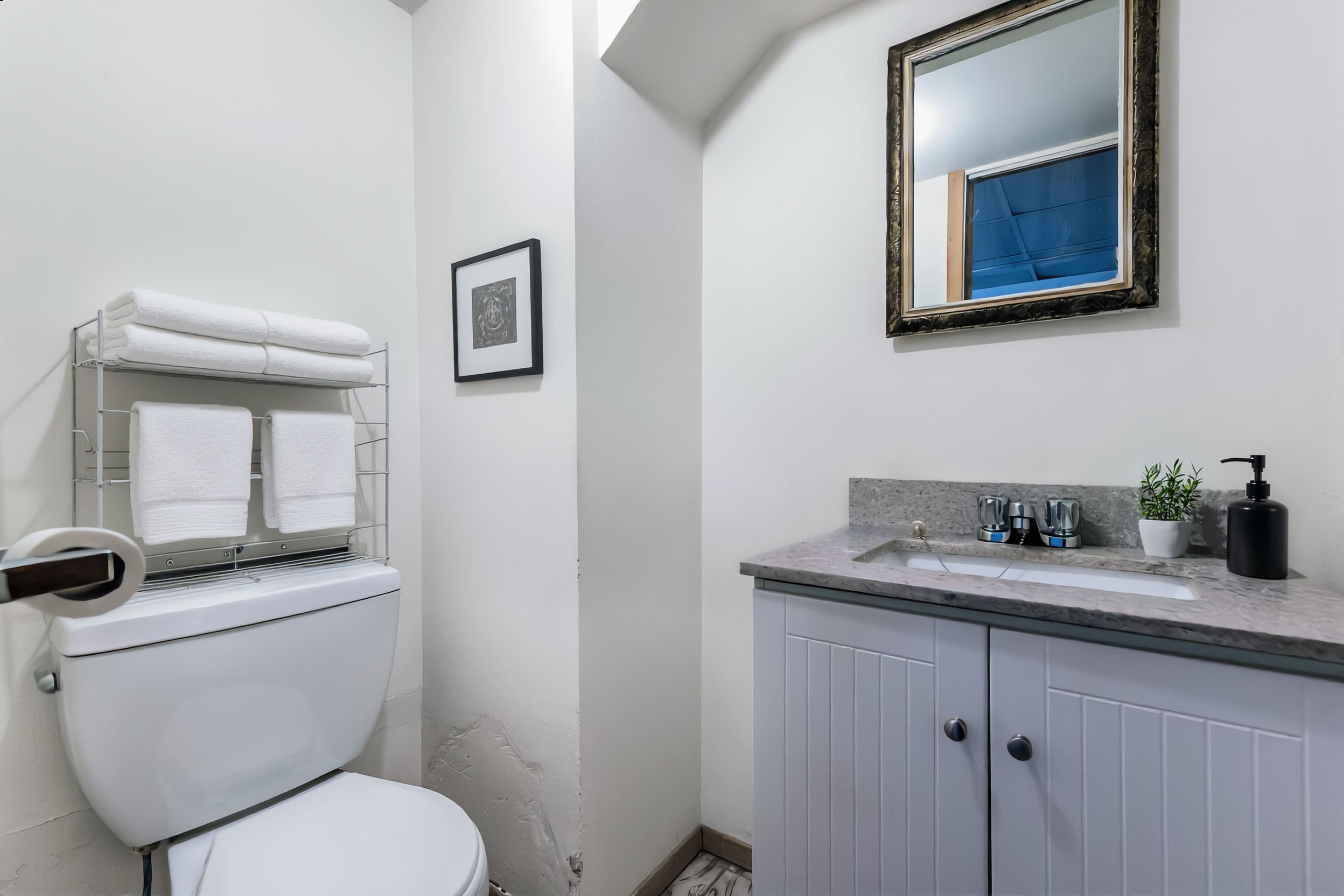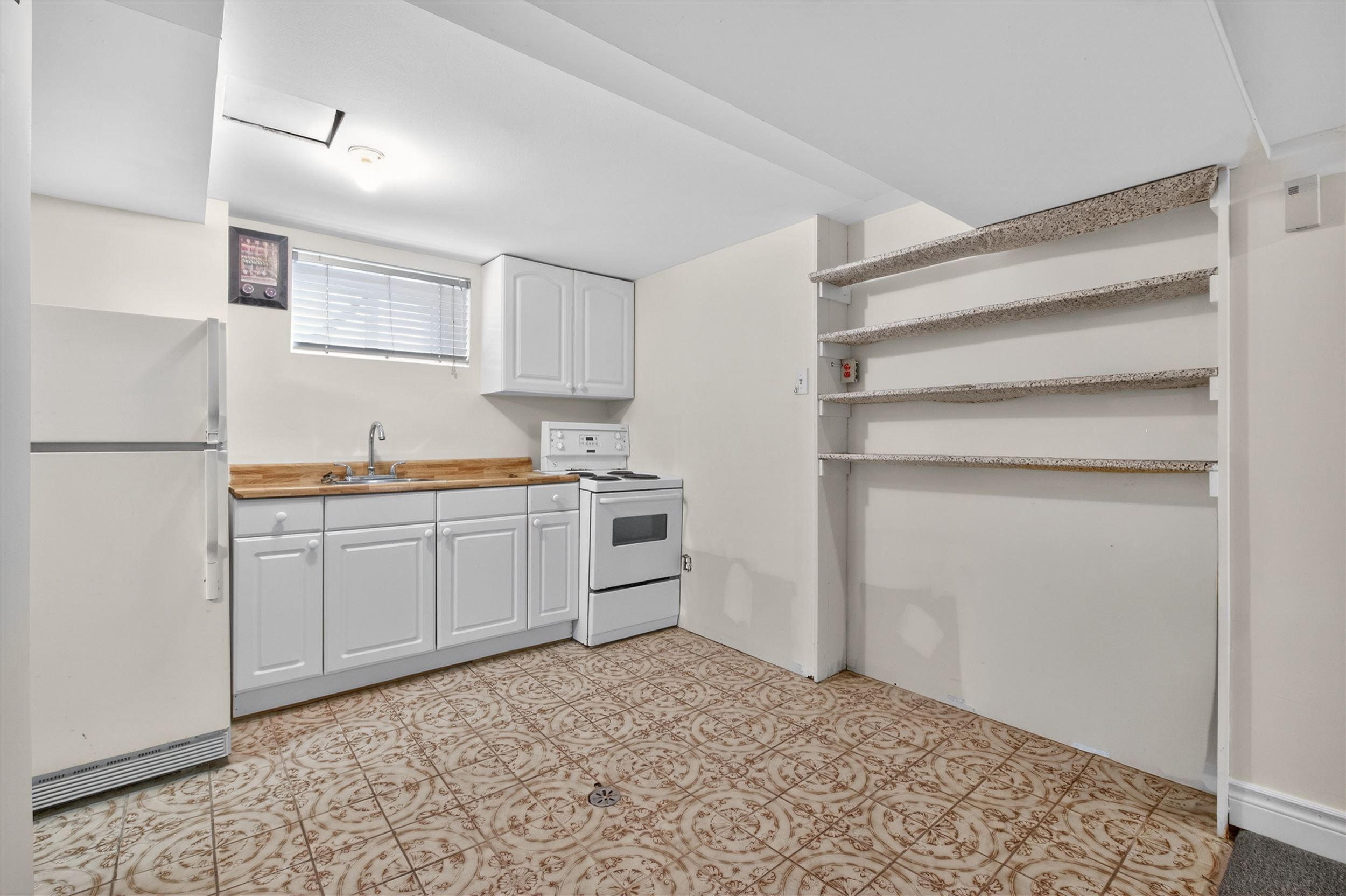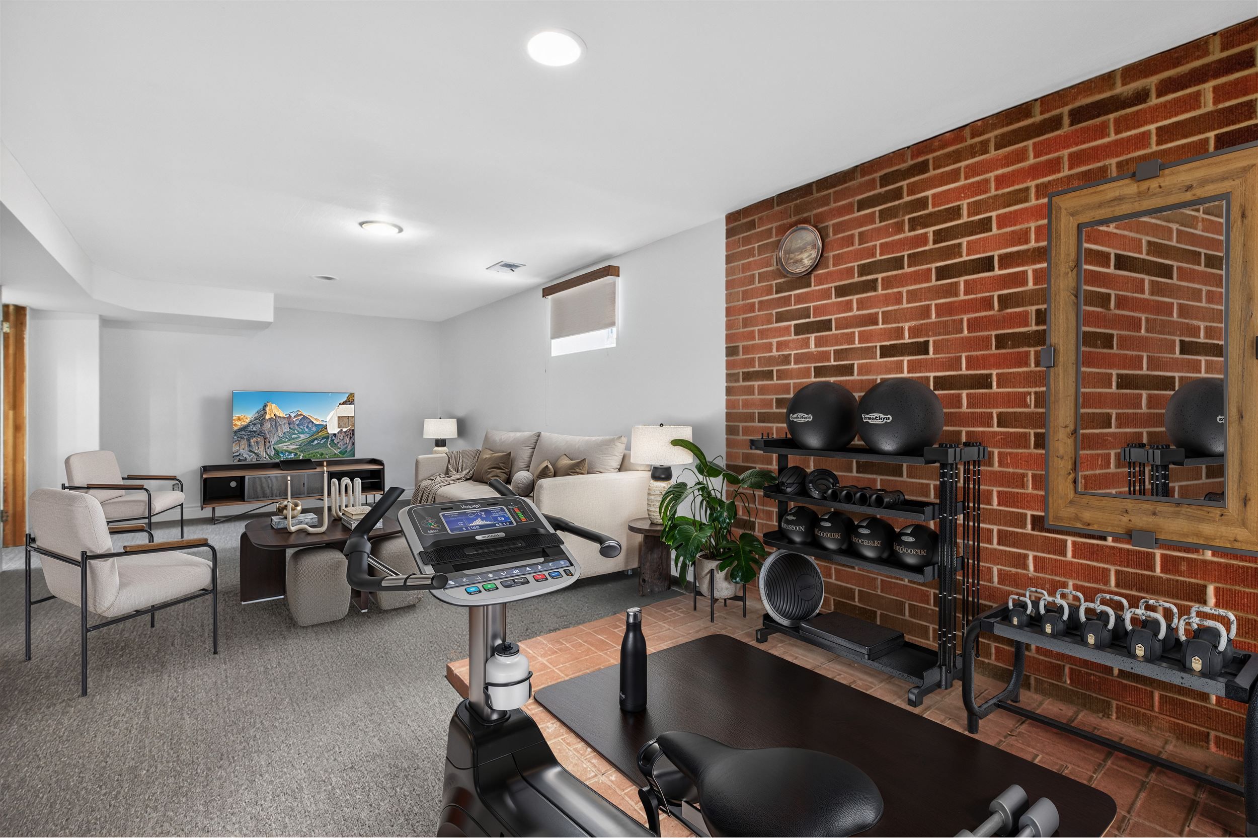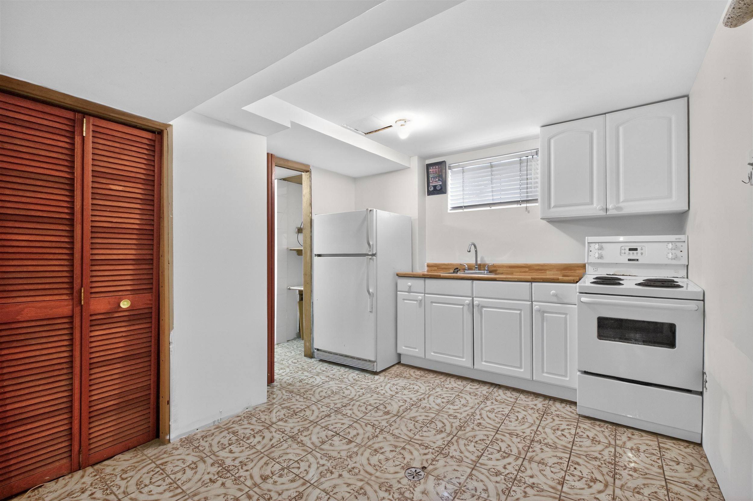 • Basement includes recreational space, bedroom, kitchenette, and bathroom.