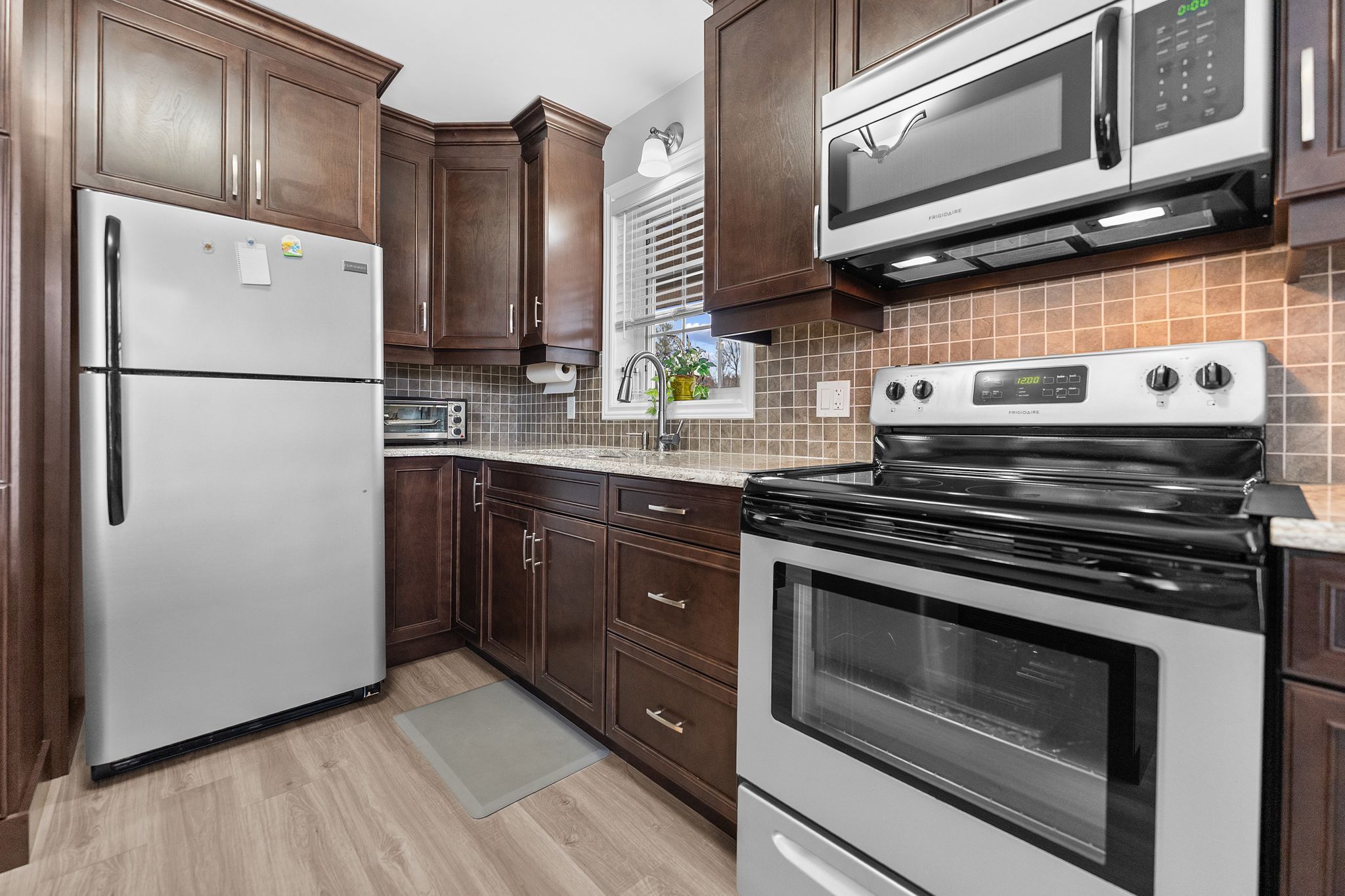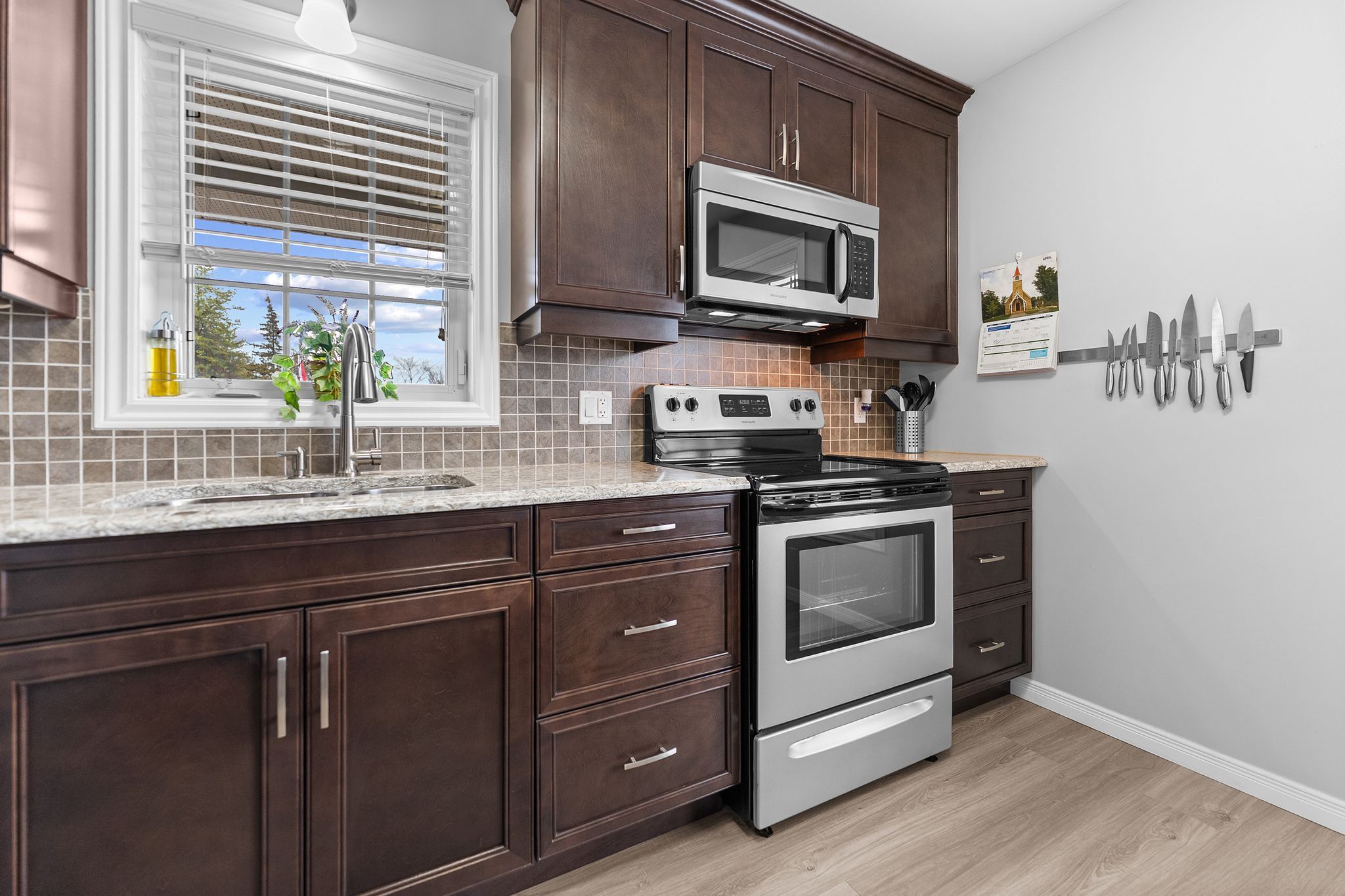 • Chef-inspired kitchen with granite countertops and high-end appliances.