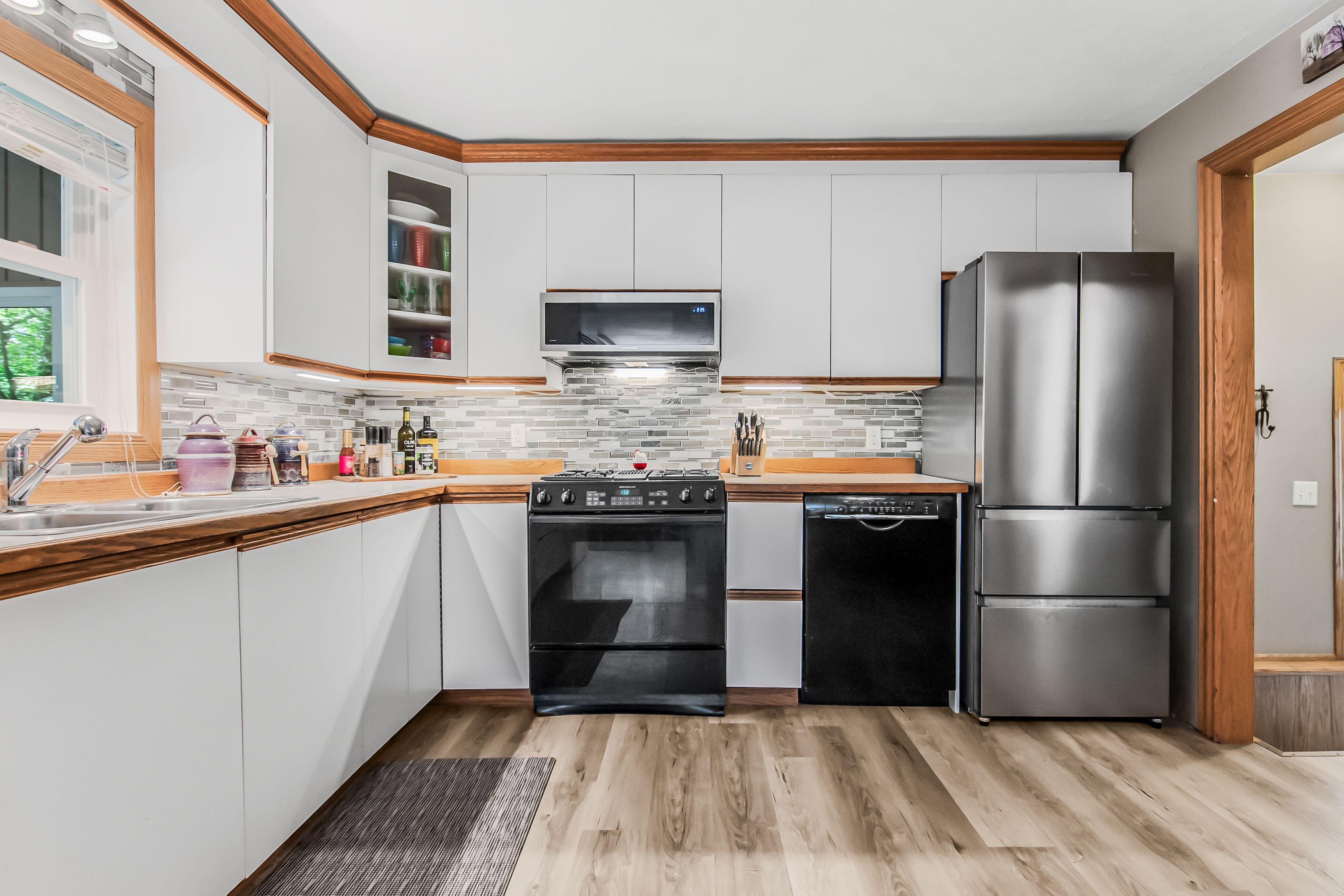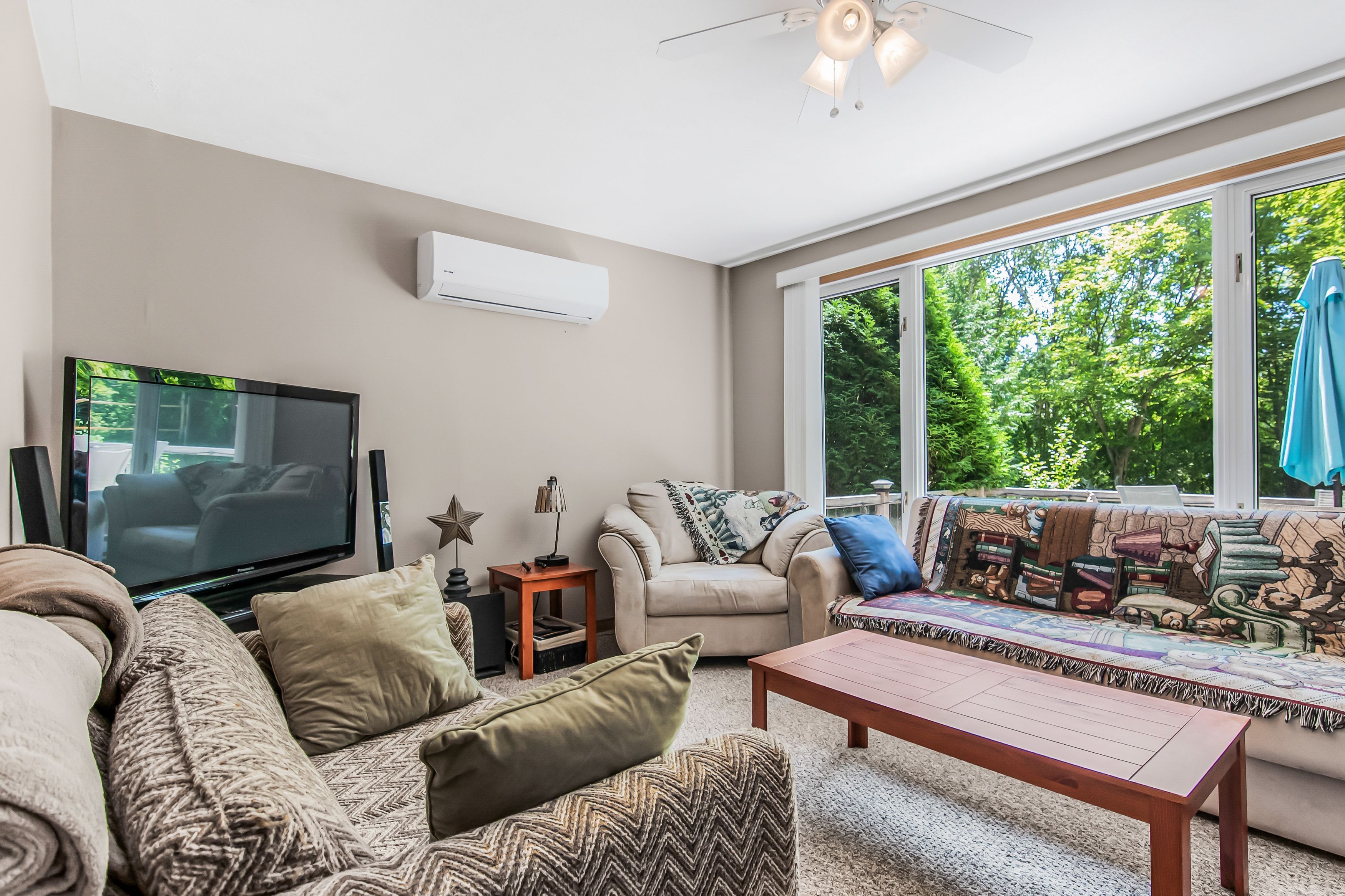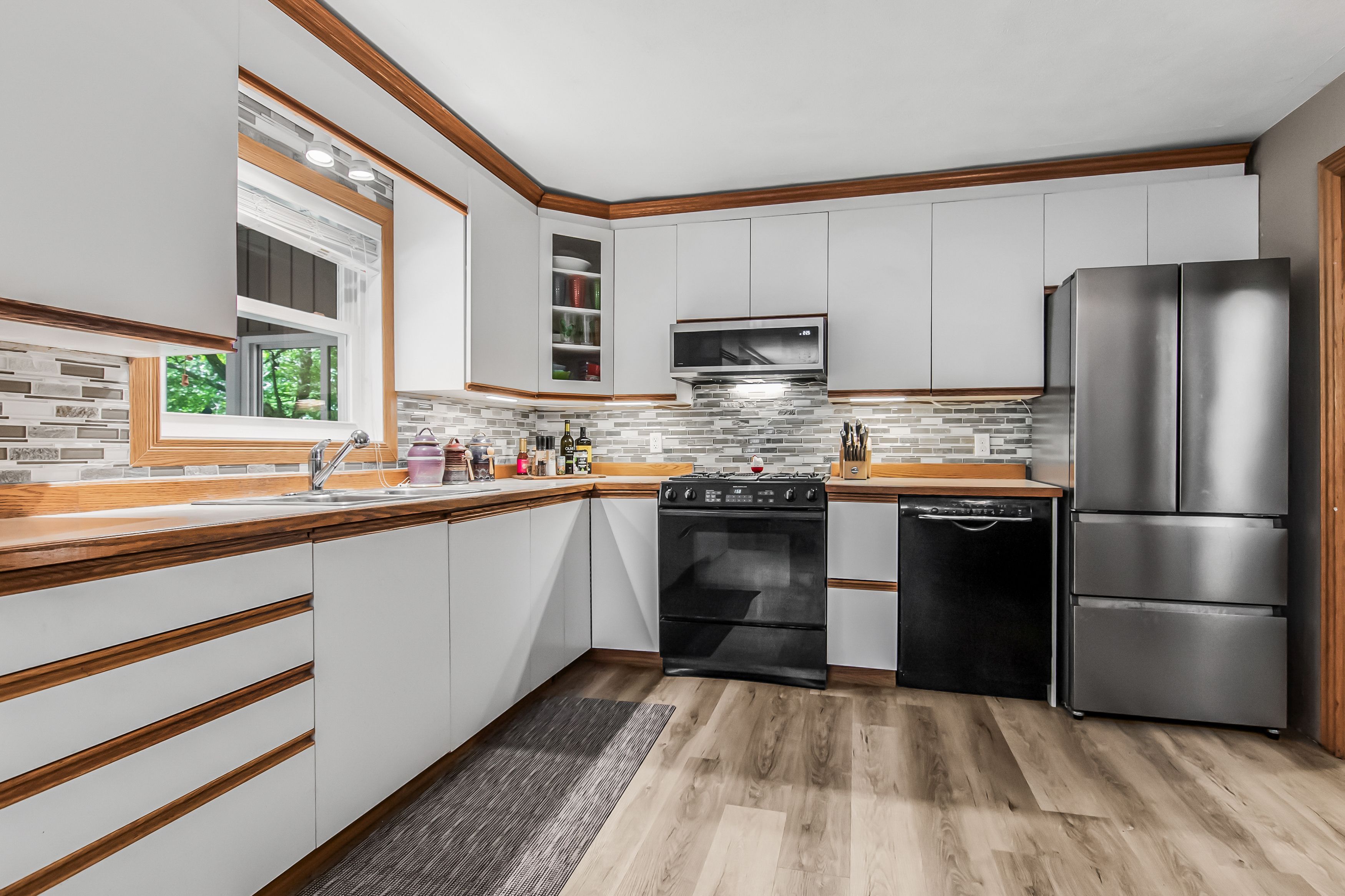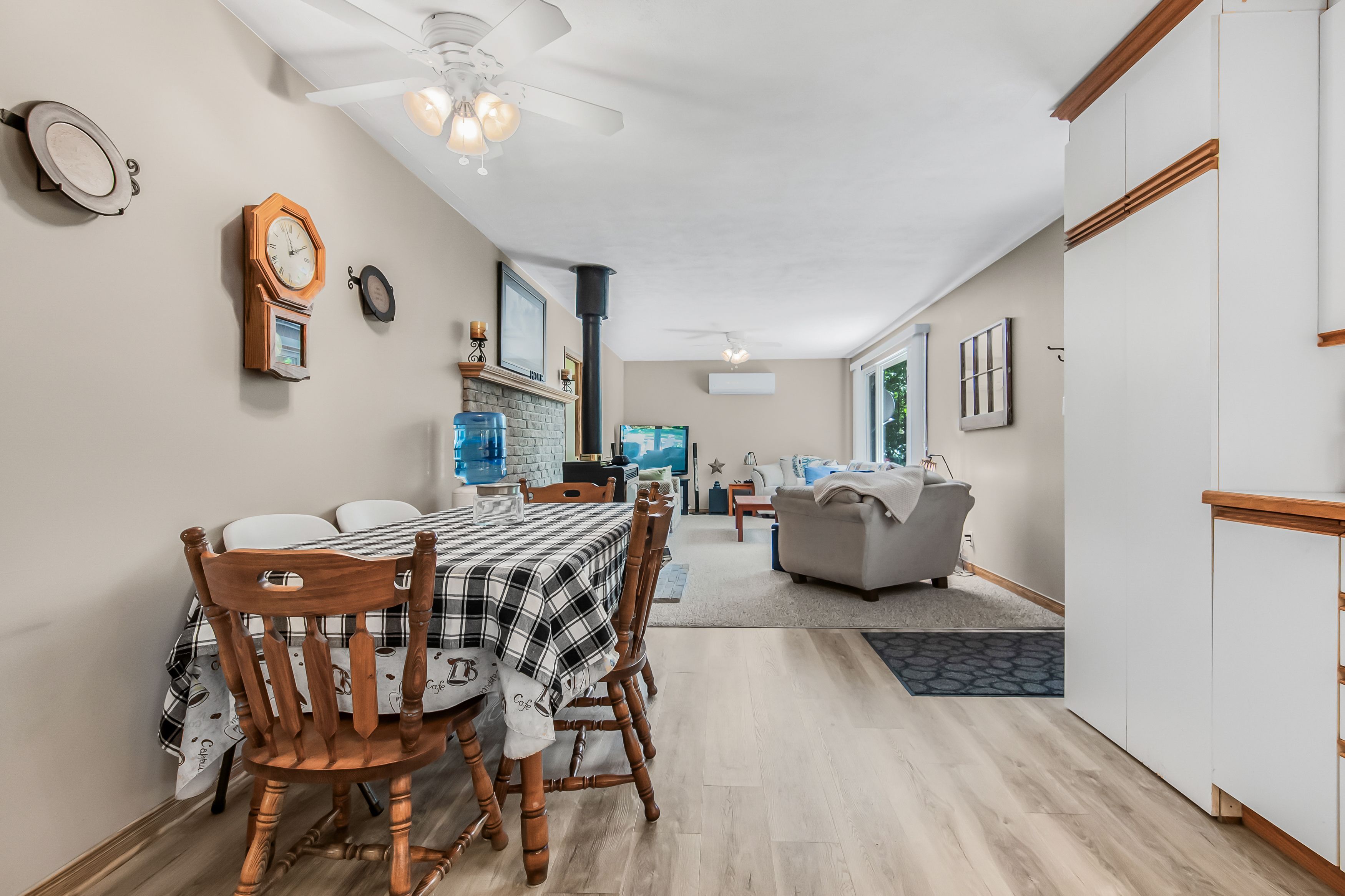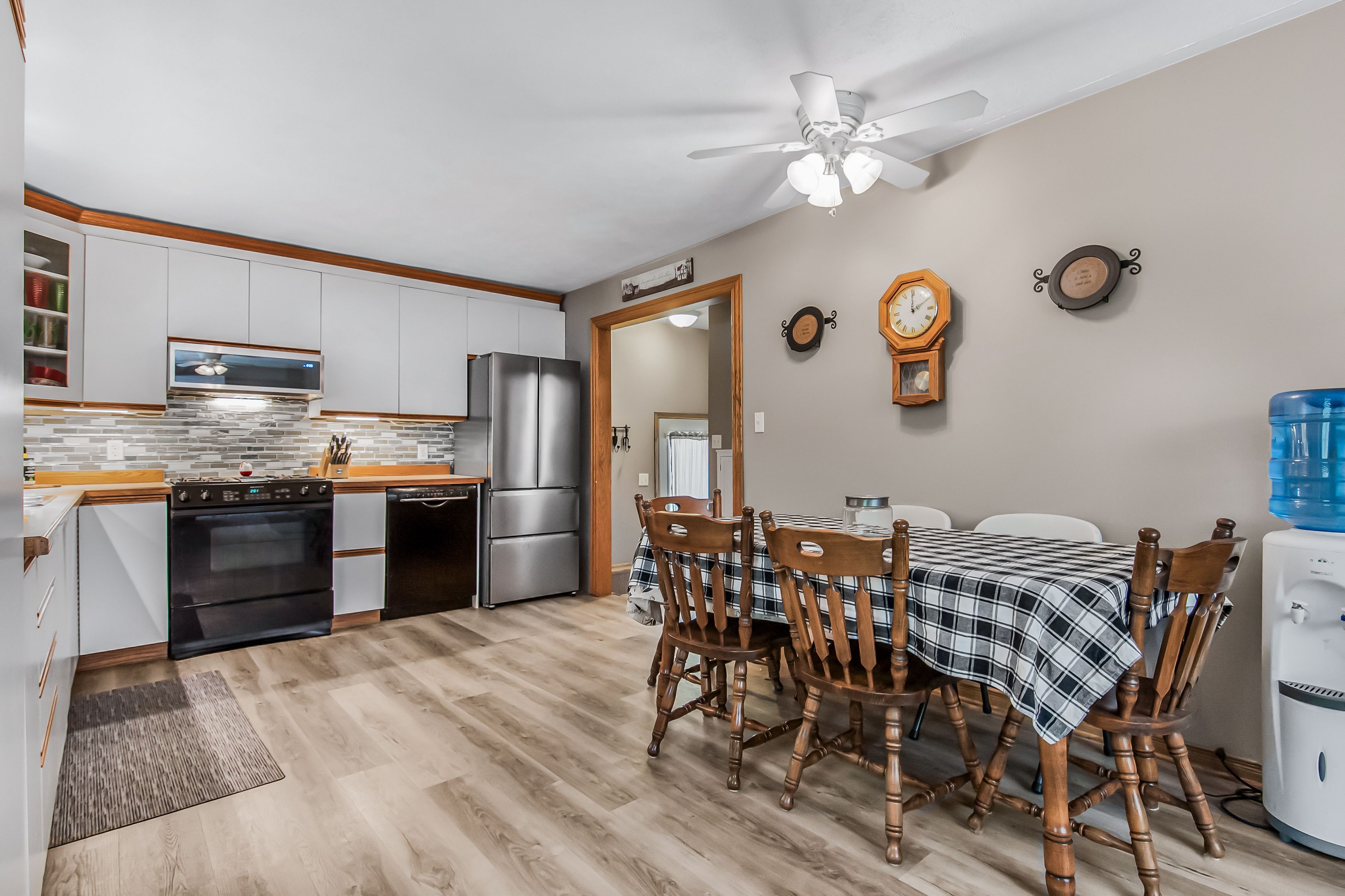 • Spacious eat-in kitchen and living room with a propane fireplace.