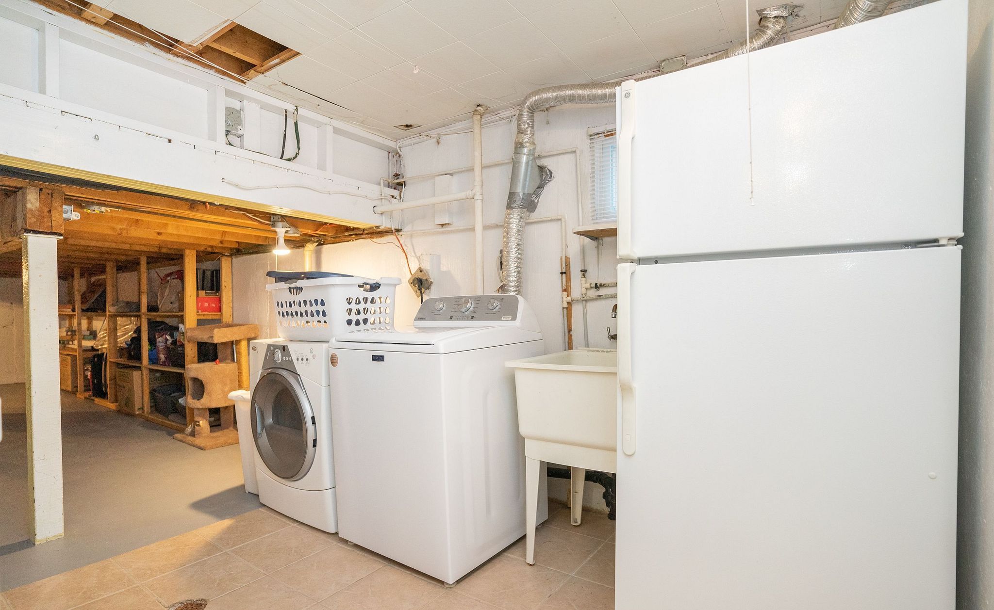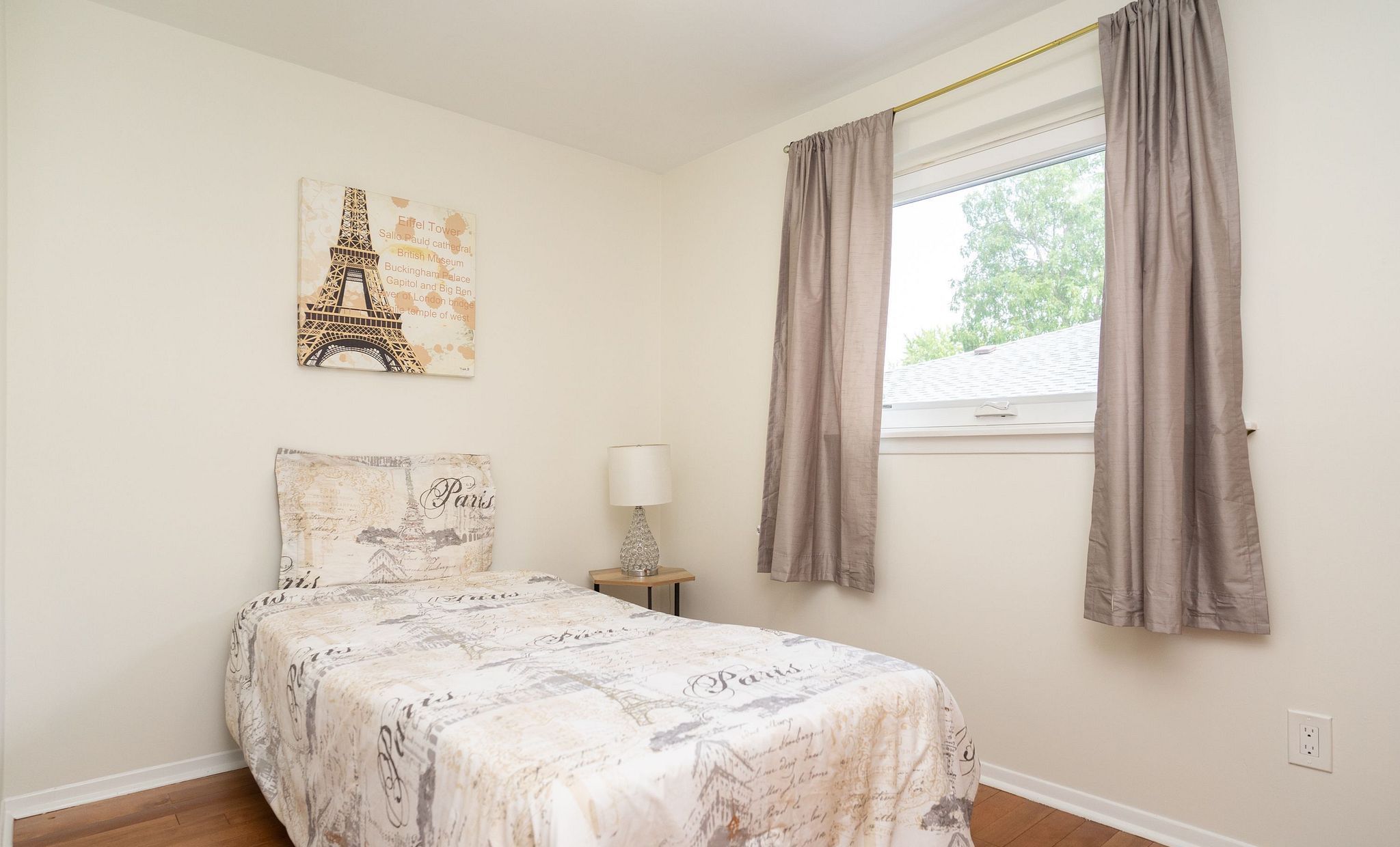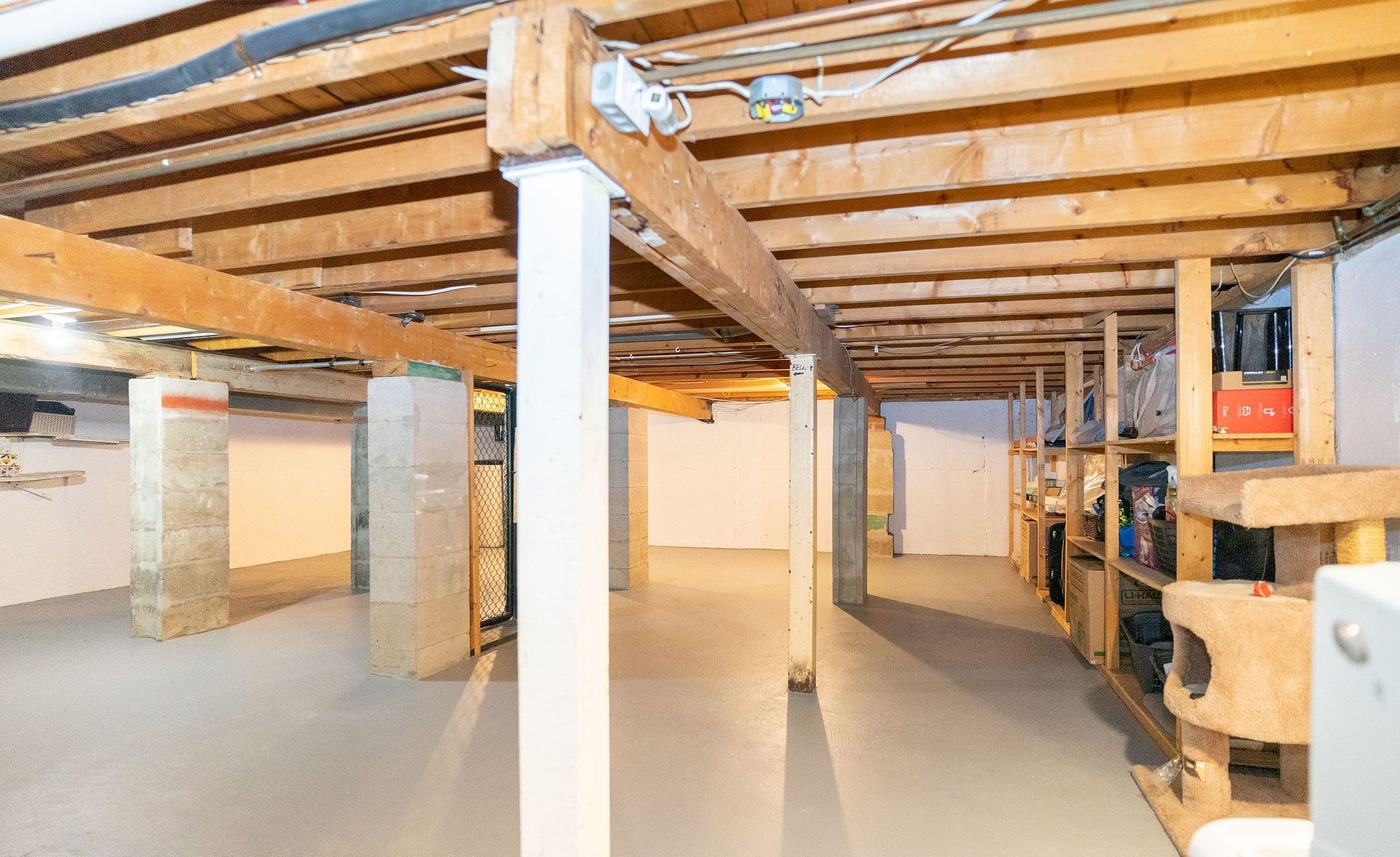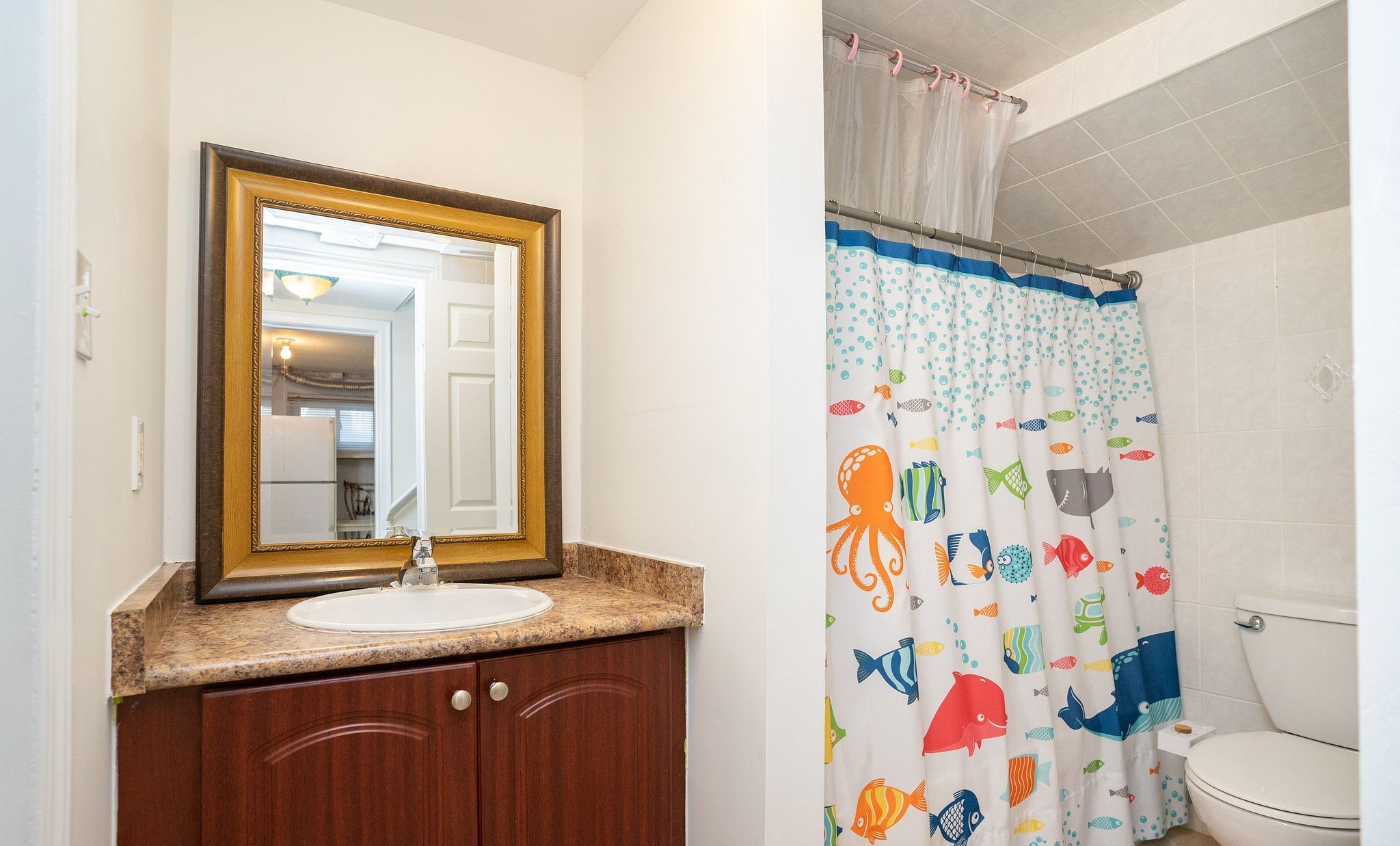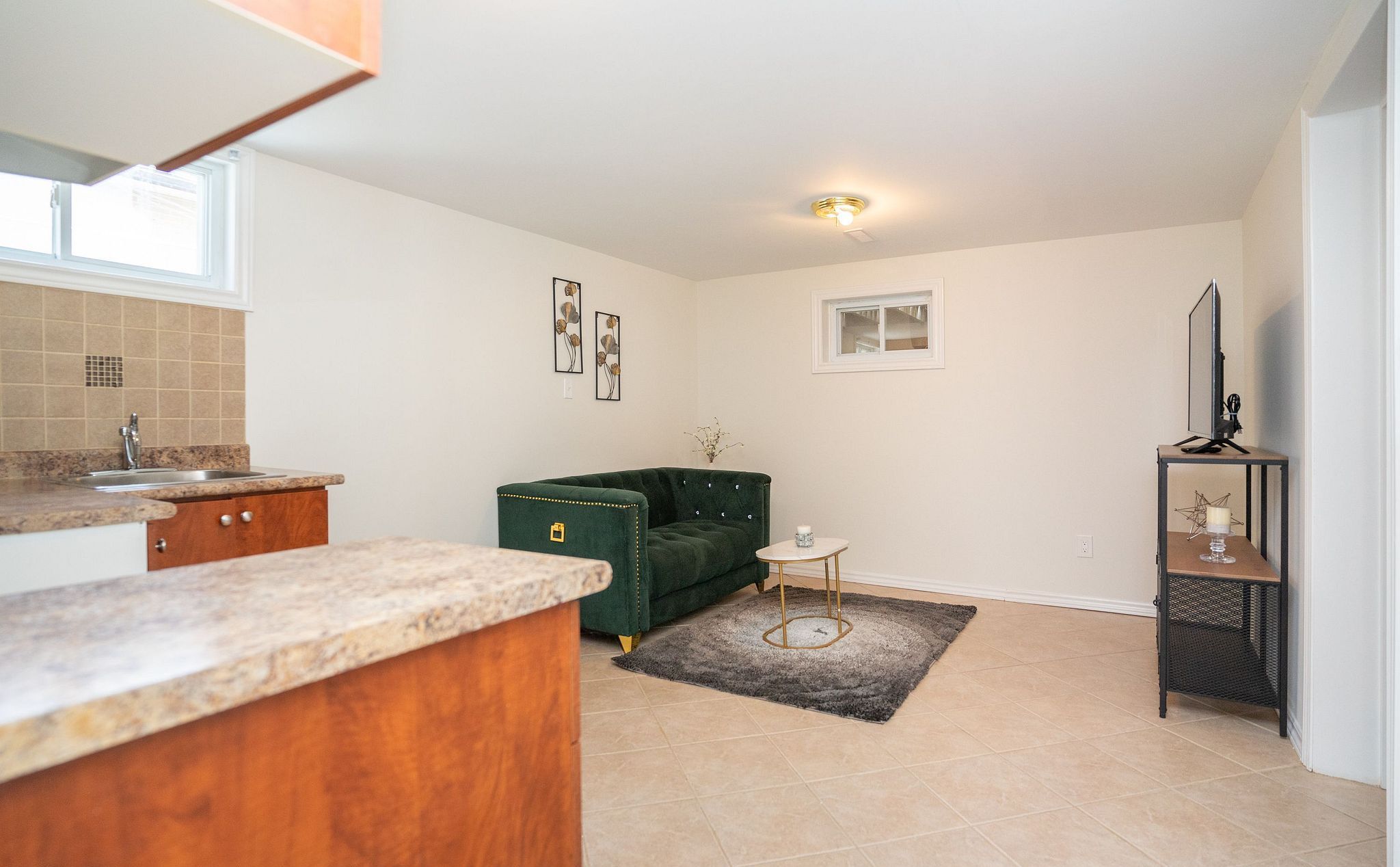 • Finished lower level includes recreation room, bedroom, and kitchenette.