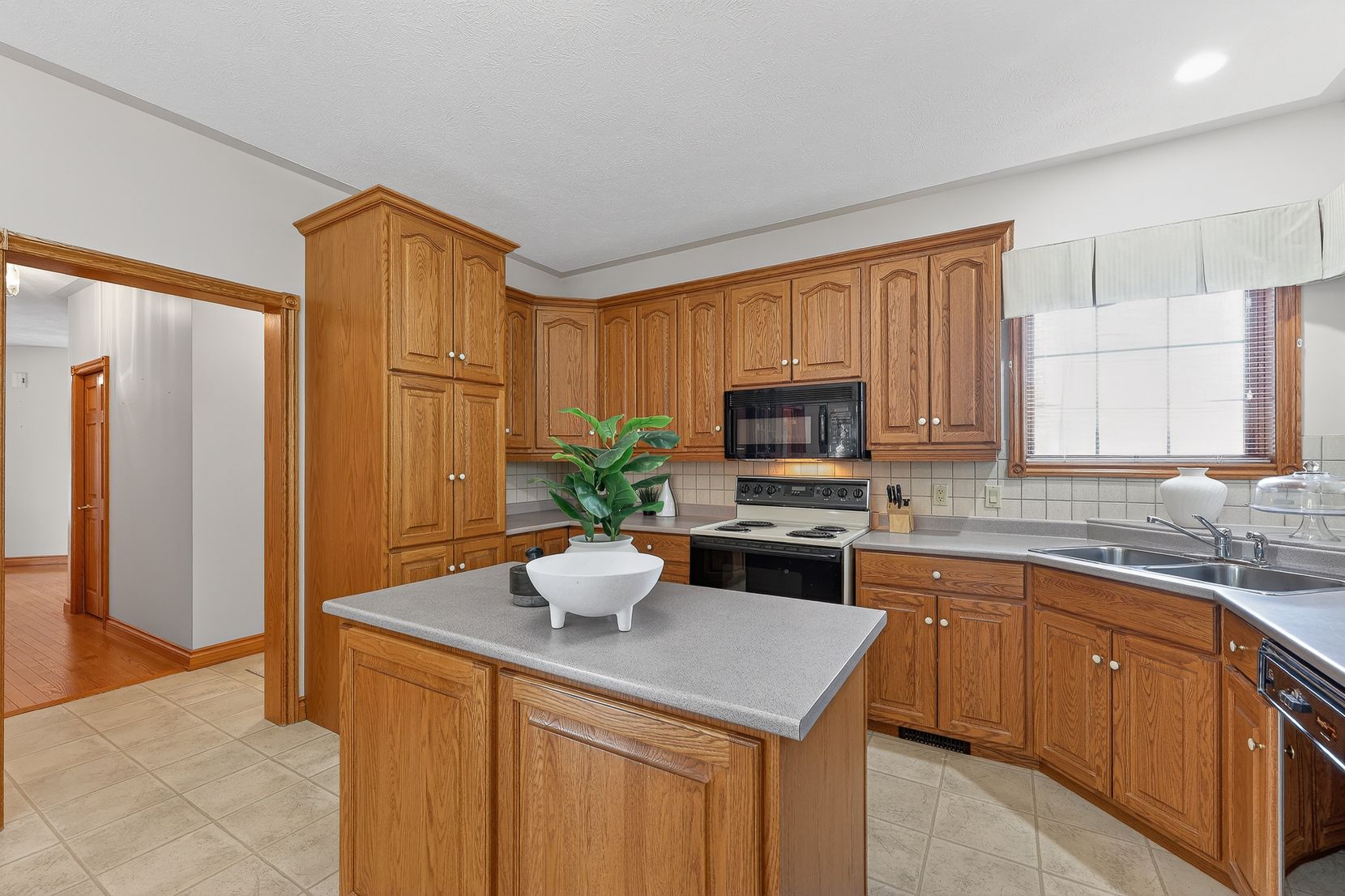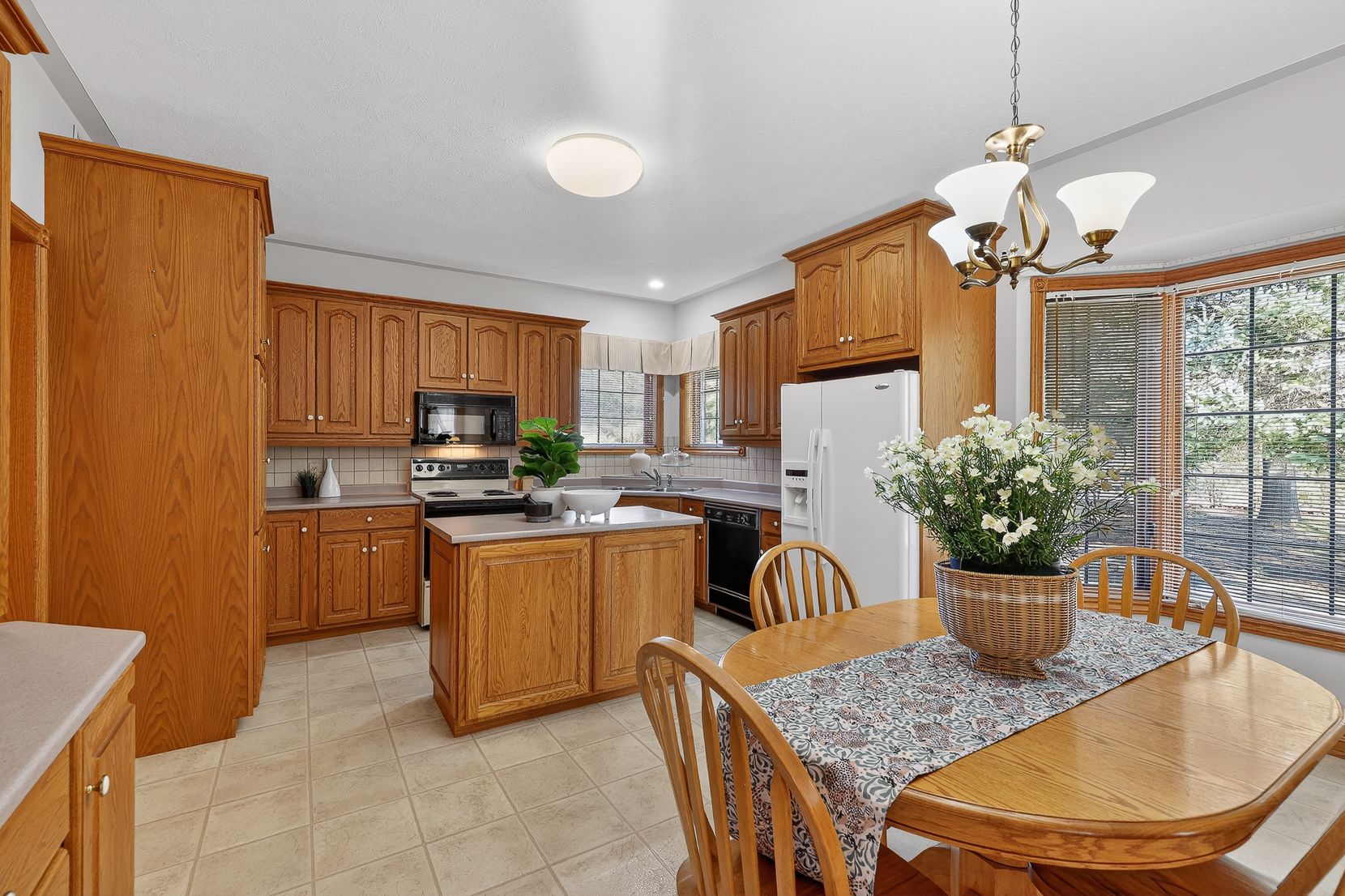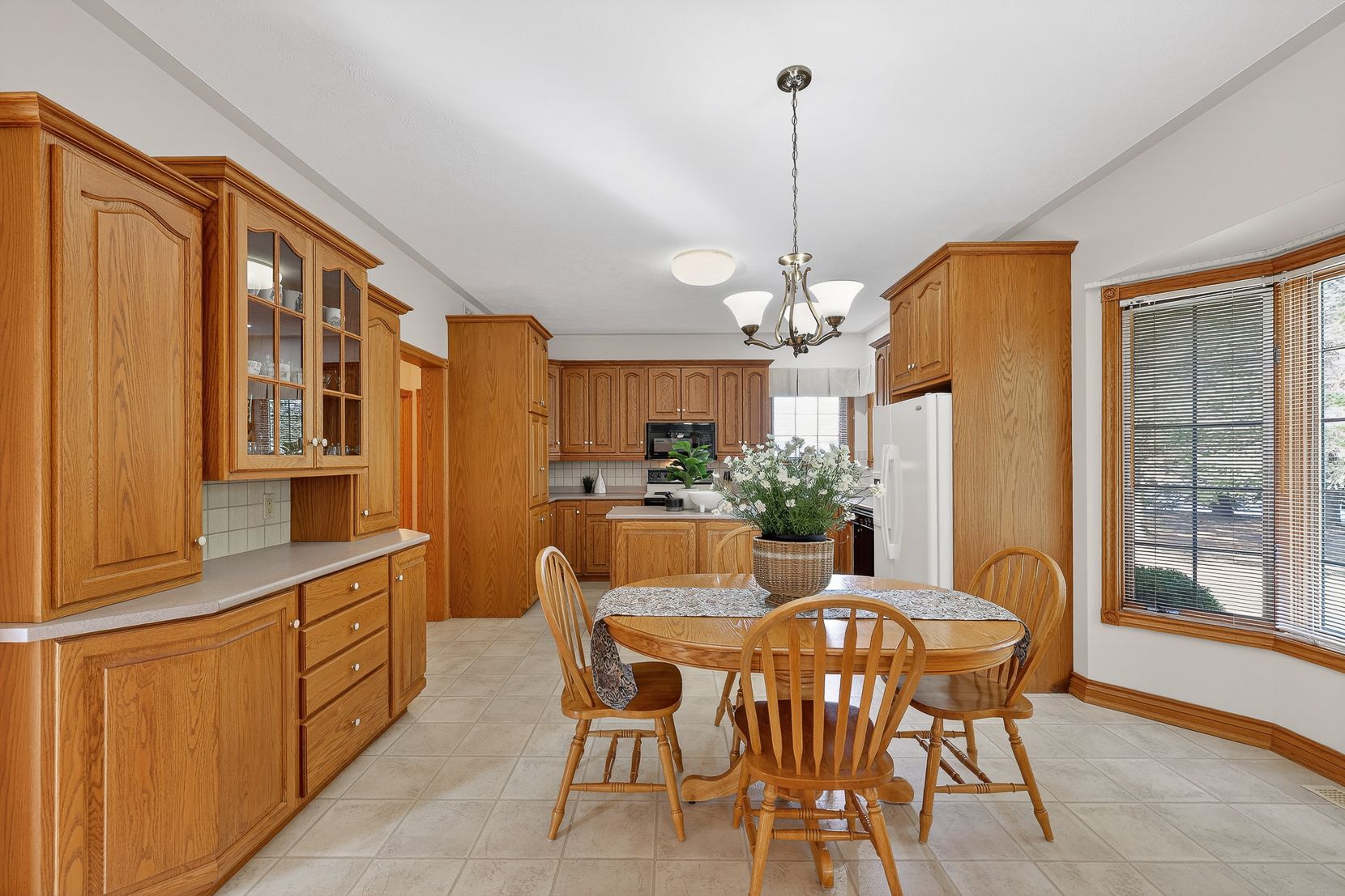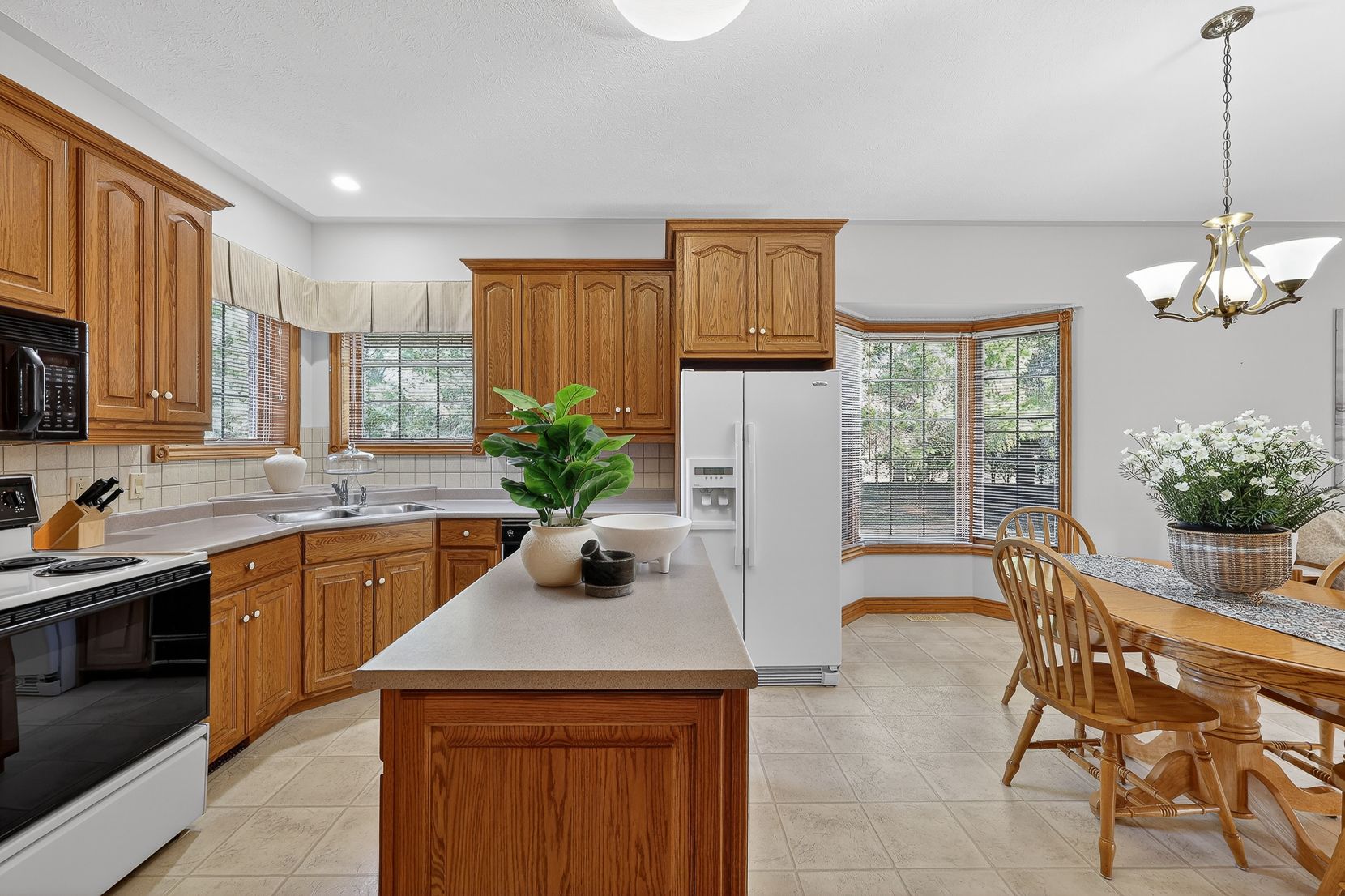 • Spacious layout with custom oak cabinetry and bright bay window in kitchen.