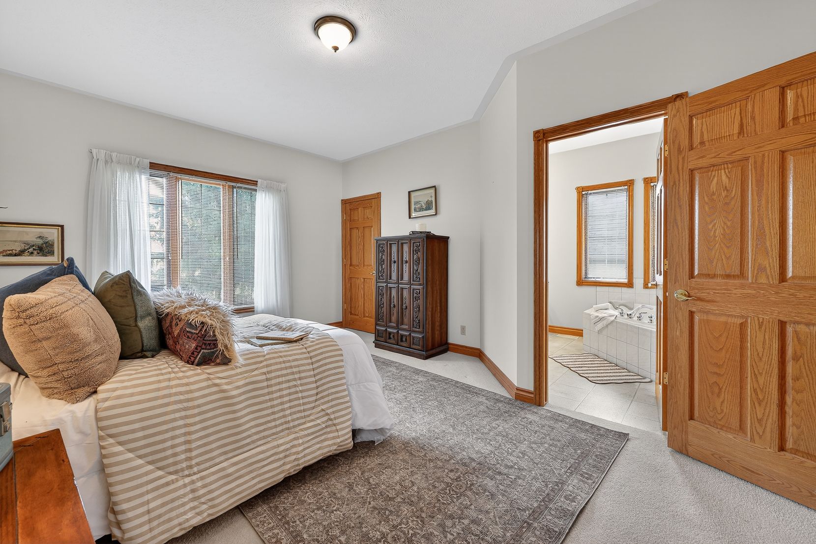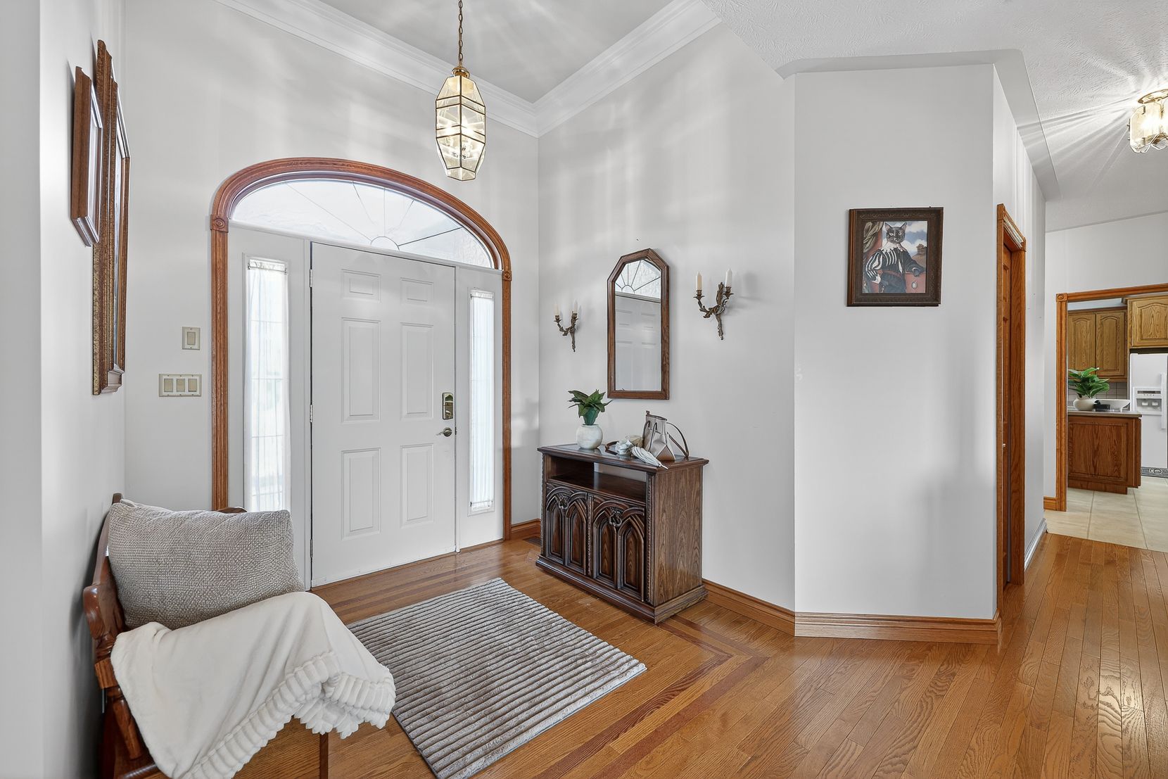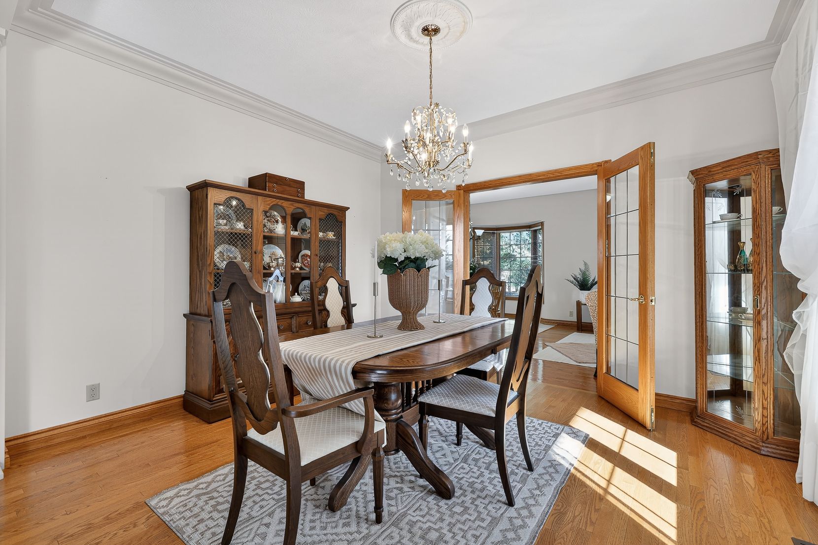 • Spacious layout with custom oak cabinetry and bright bay window in kitchen.