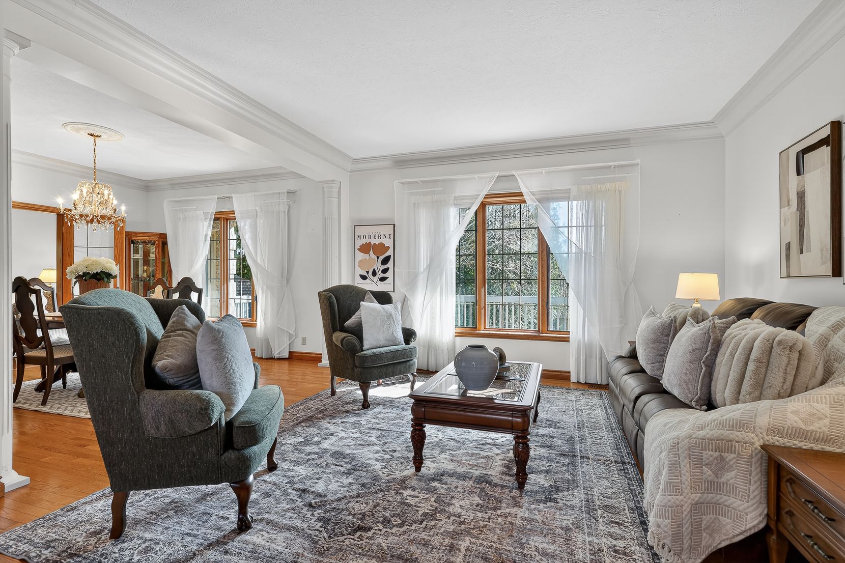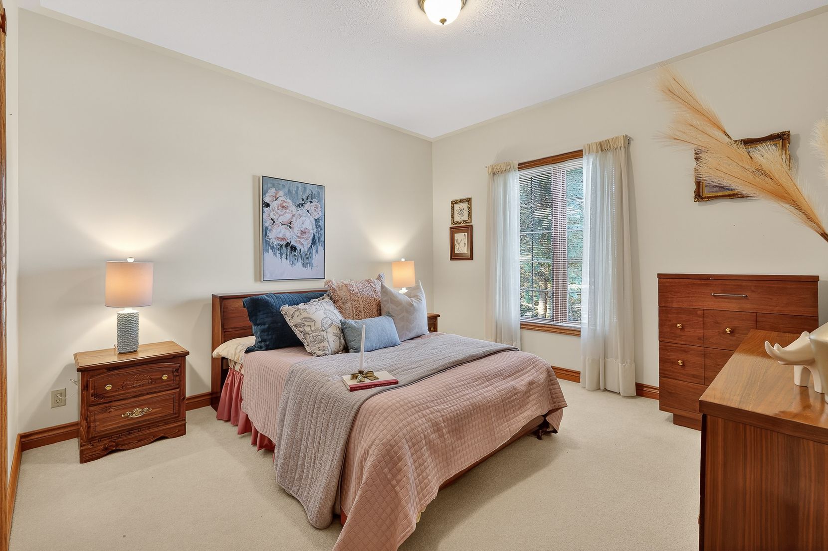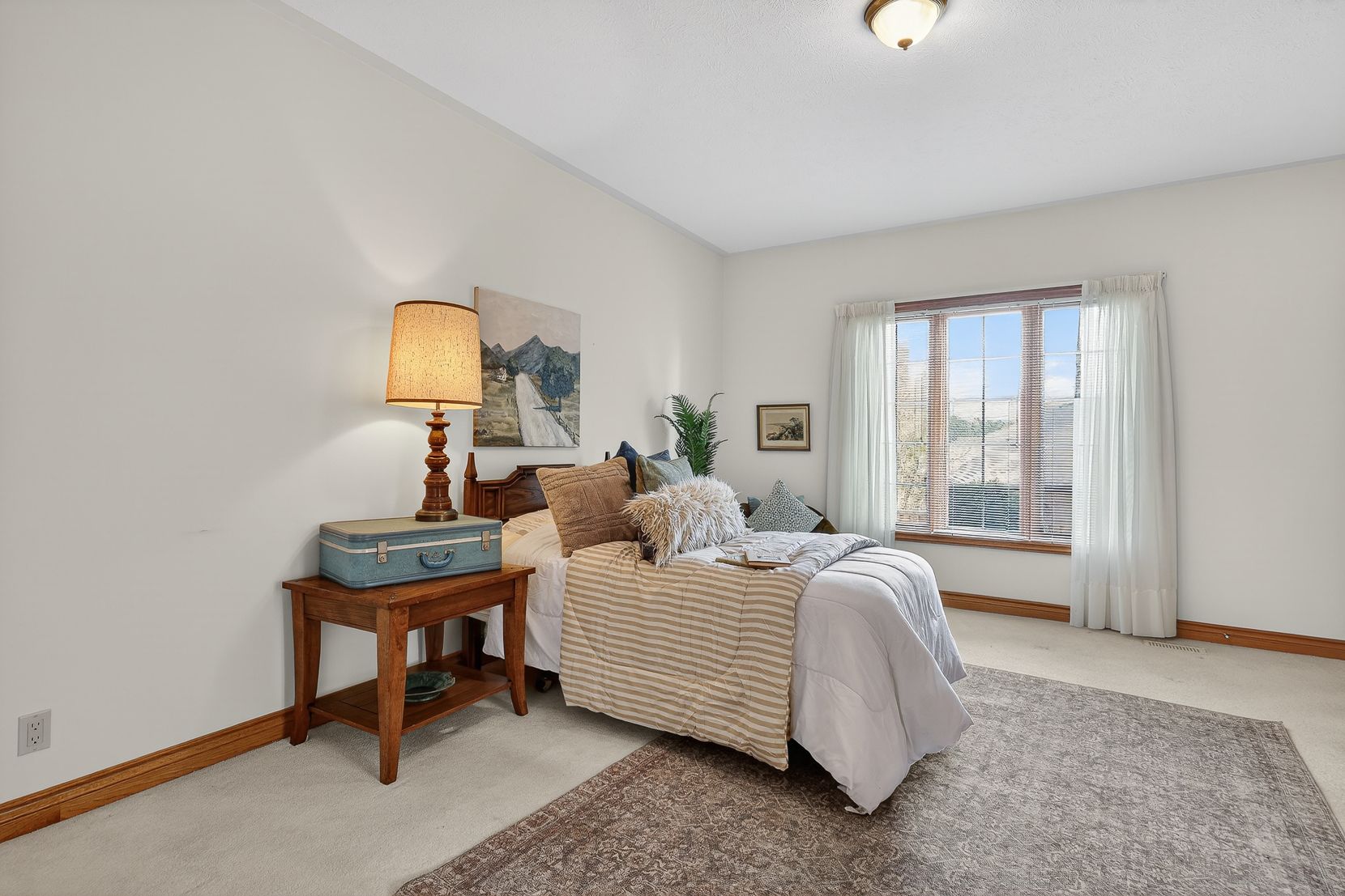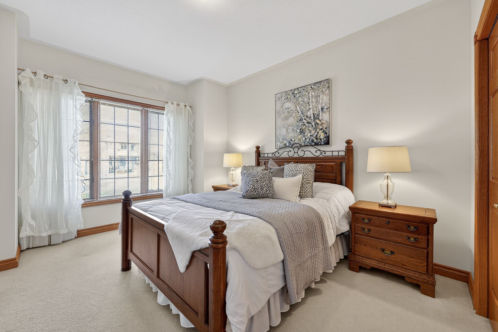 • Spacious layout with custom oak cabinetry and bright bay window in kitchen.