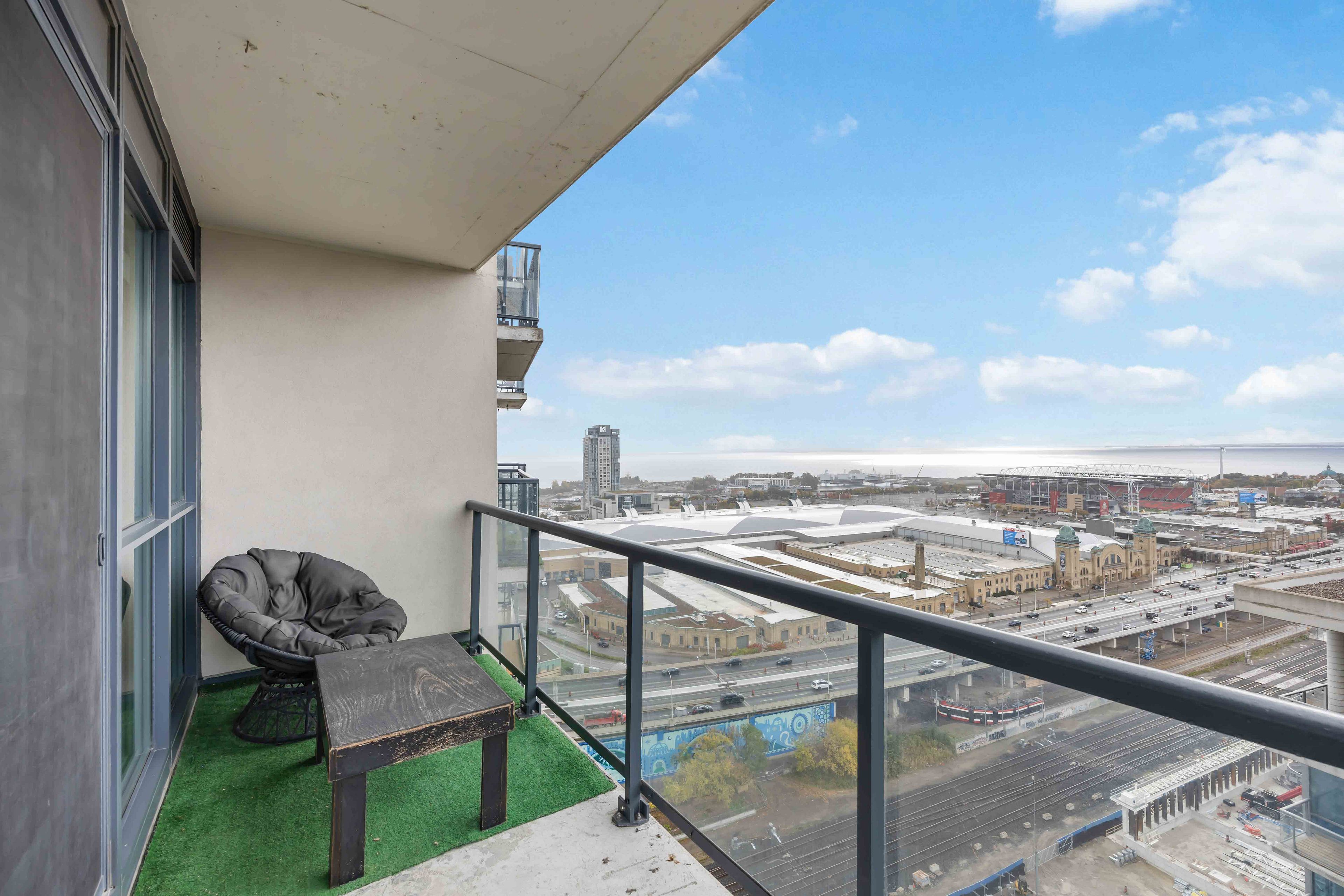 Views that rival million-dollar suites - for less than half the price! Imagine starting and ending each day with sweeping southwest views of lake ontario, exhibition place, and bmo field. Watch the action of argo games & tfc matches all from the comfort of your home. This sun-drenched 1-bedroom suite in the heart of liberty village combines modern design with effortless comfort. The open-concept layout features a sleek white kitchen with granite counters and stainless steel appliances. Floor-to-ceiling windows flood the living space with natural light, framing stunning views from sunrise to sunset. The smart, efficient floor plan offers room for a proper dining area, a cozy living space, and a bedroom that comfortably fits a queen bed and a dedicated work-from-home setup. A spacious walk-in front hall closet with stacked laundry + built-in storage (not just a closet!) add rare functionality and convenience. Step outside and enjoy a chic outdoor pool and 5-star amenities that elevate your everyday living. All of this, just steps from grocery stores, gyms, restaurants, and liberty village's vibrant local scene.