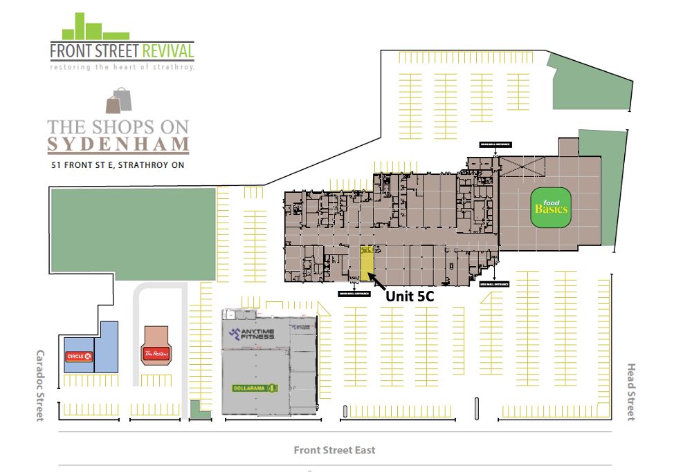 1,274 sq ft available at the shops on sydenham, one of the largest and busiest commercial destinations in town. Located in the heart of downtown strathroy, unit 5c includes an exterior facade facing the large parking lot as well as an interior mall entrance providing both exposure and convenience. The property is home to food basics, dollarama, tim horton's, anytime fitness, circle k, gino's pizza, hearing life and many more businesses. Unit 5c is being offered at $29/sq ft + $8/sq ft (tmi). Tenant to hold utilities.