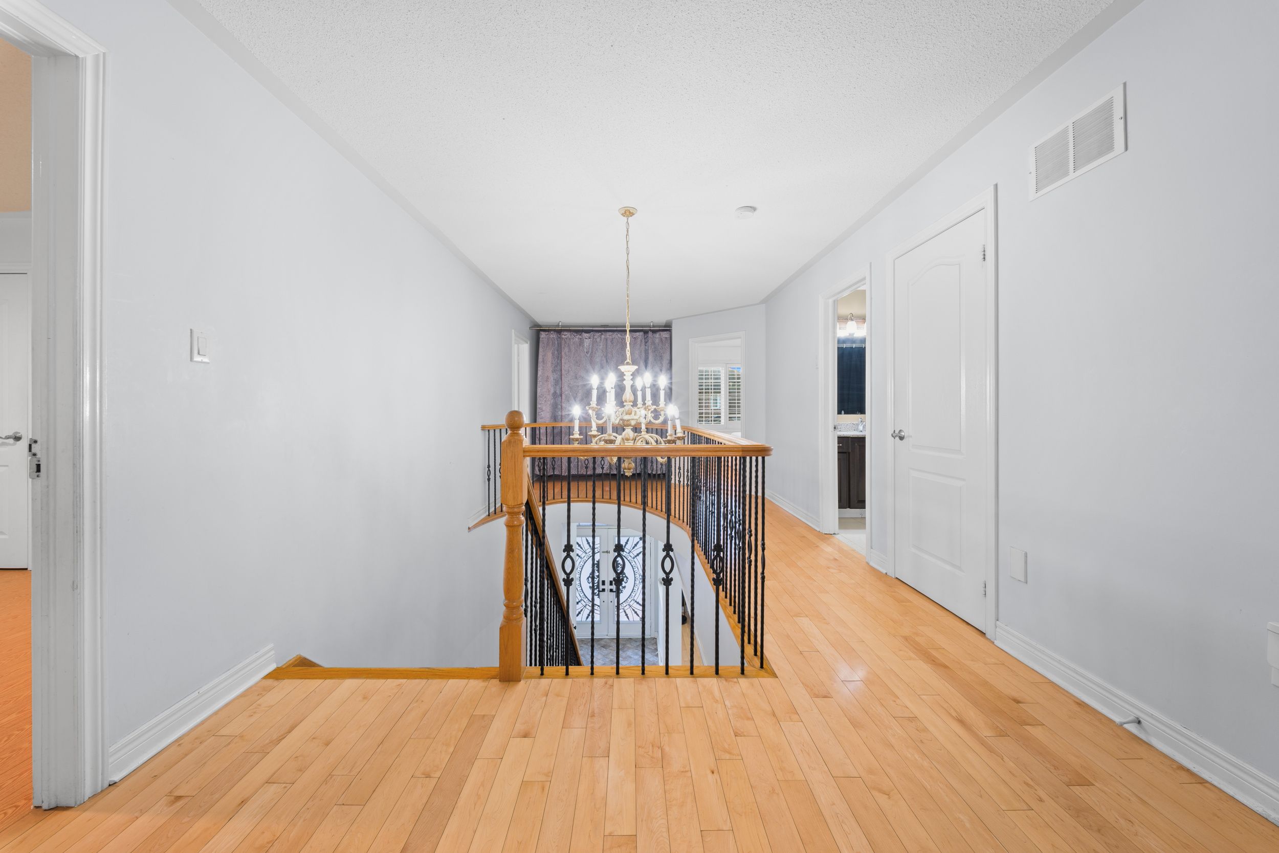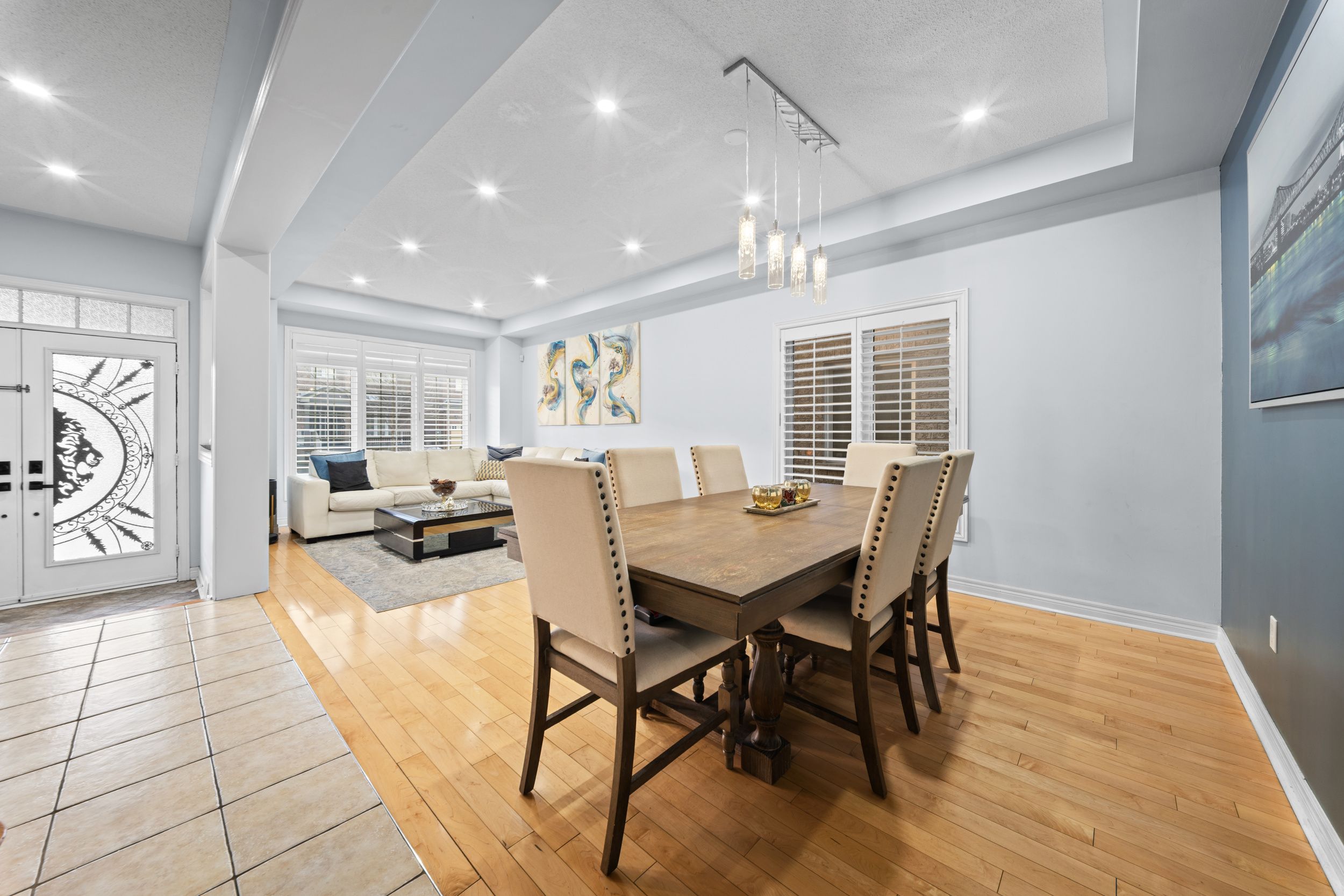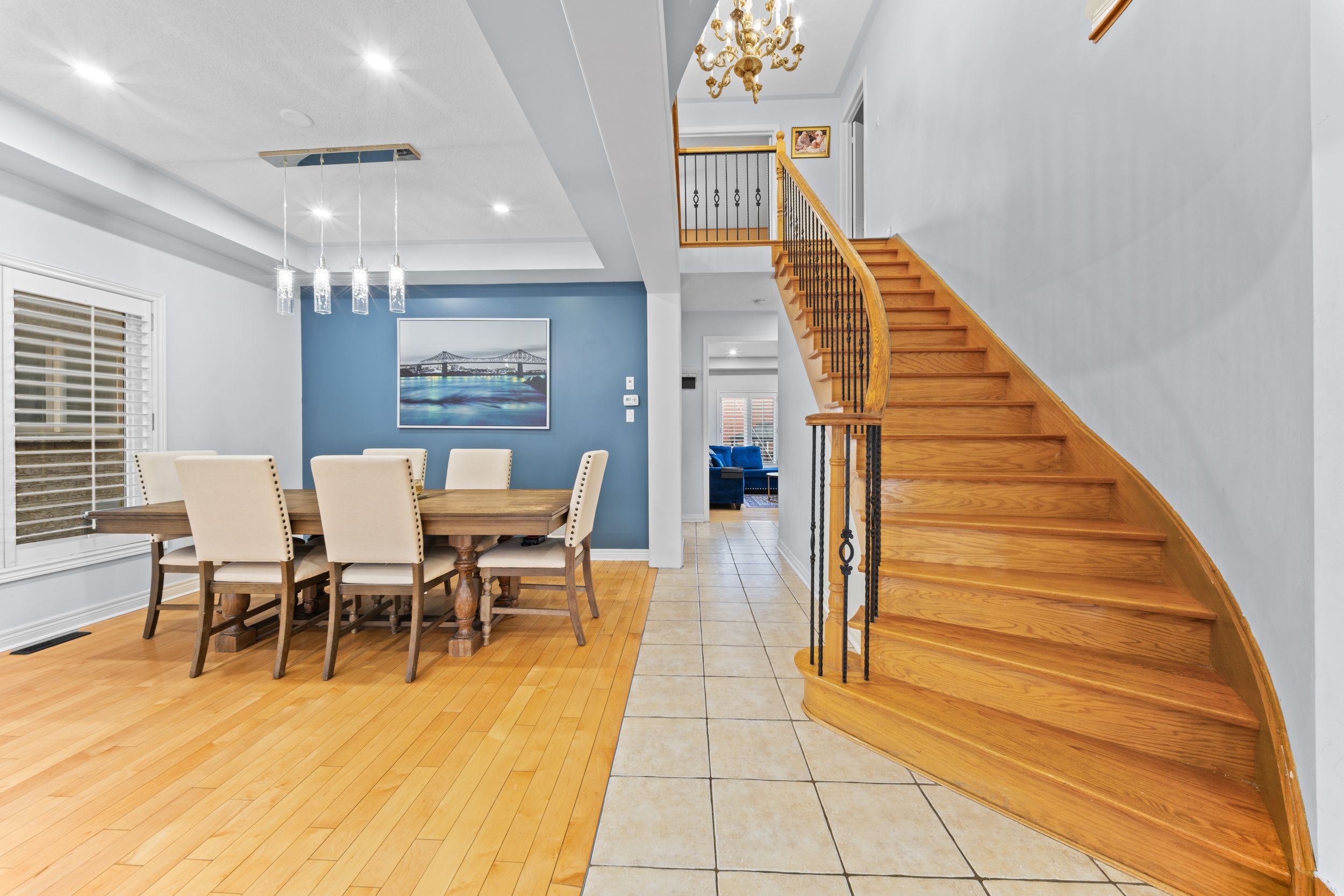 • Bright layout with a grand curved staircase and elegant double door entrance.