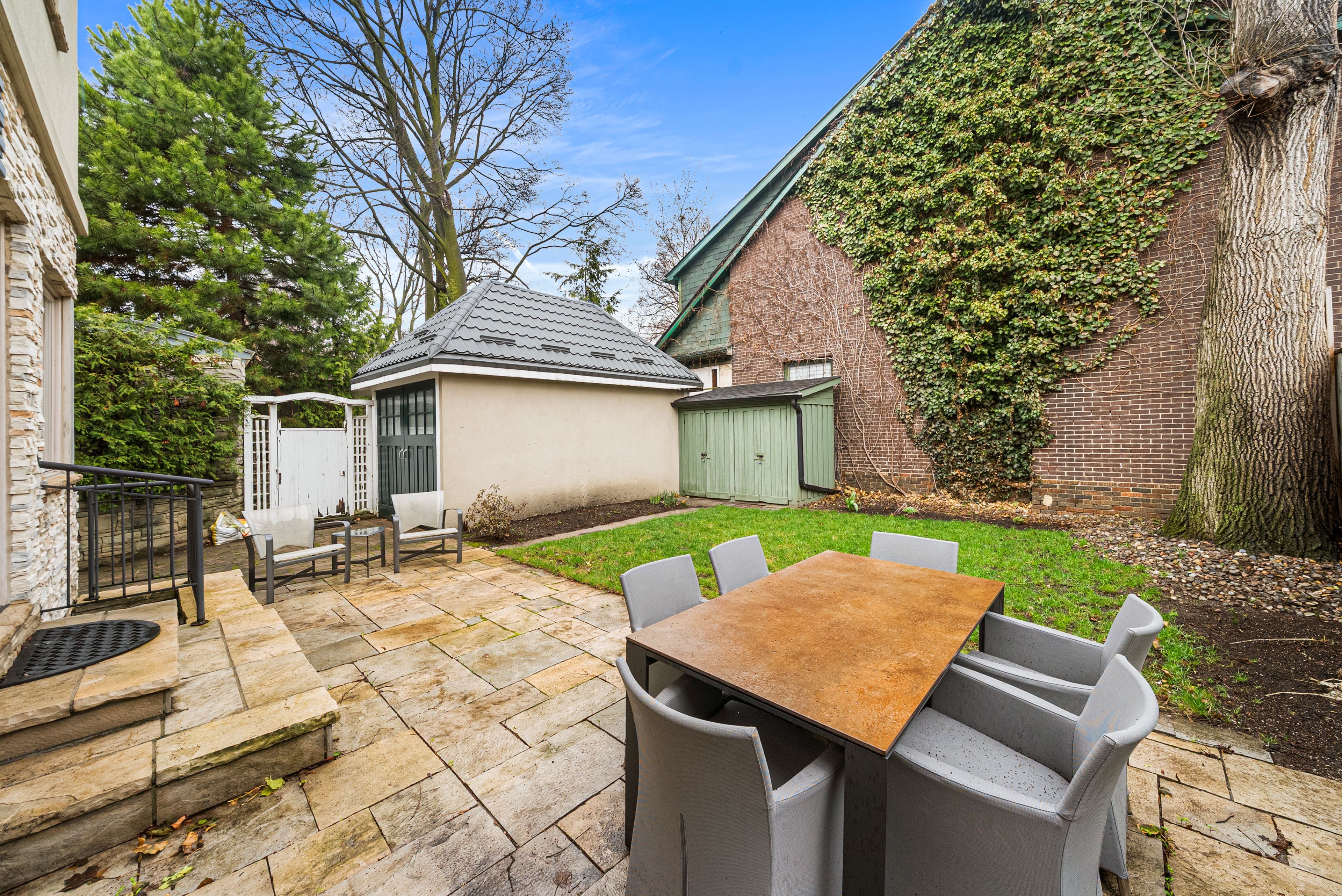 • Sun-filled family room leads to a backyard, perfect for entertaining.