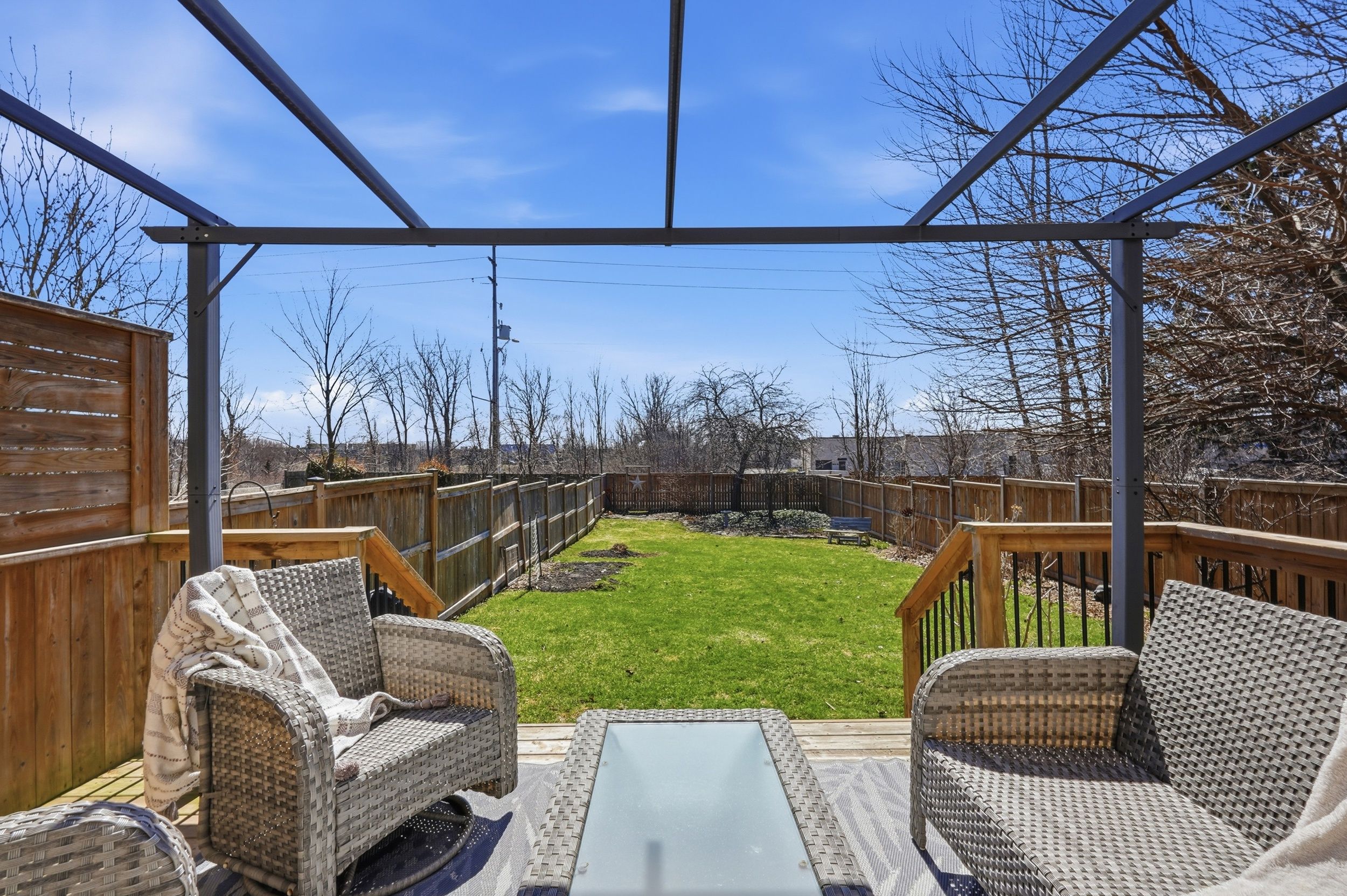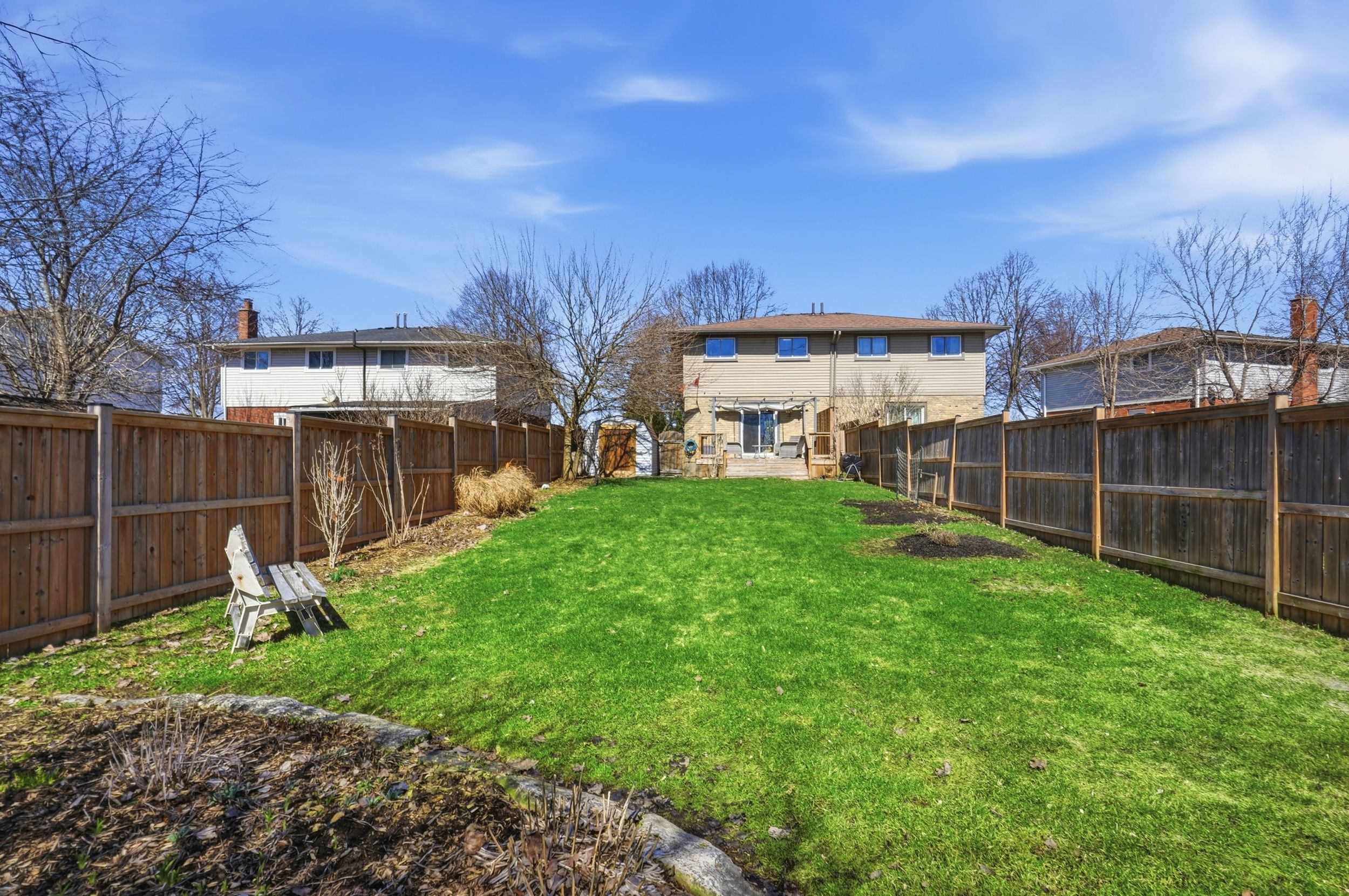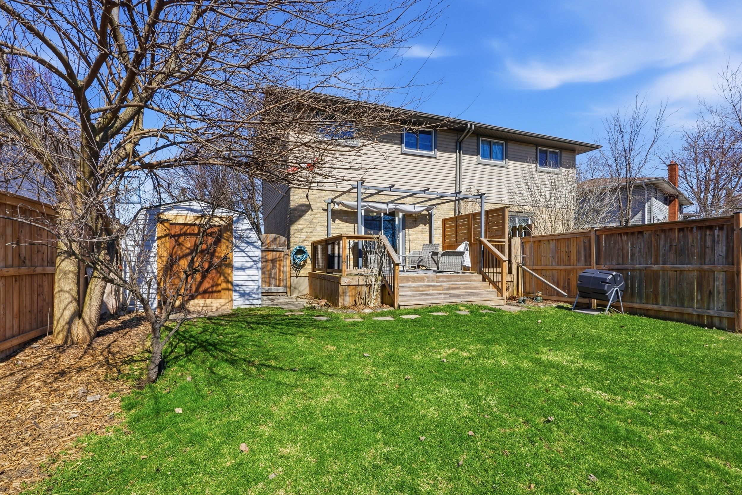 • Private, fully fenced backyard with a spacious deck and patio.