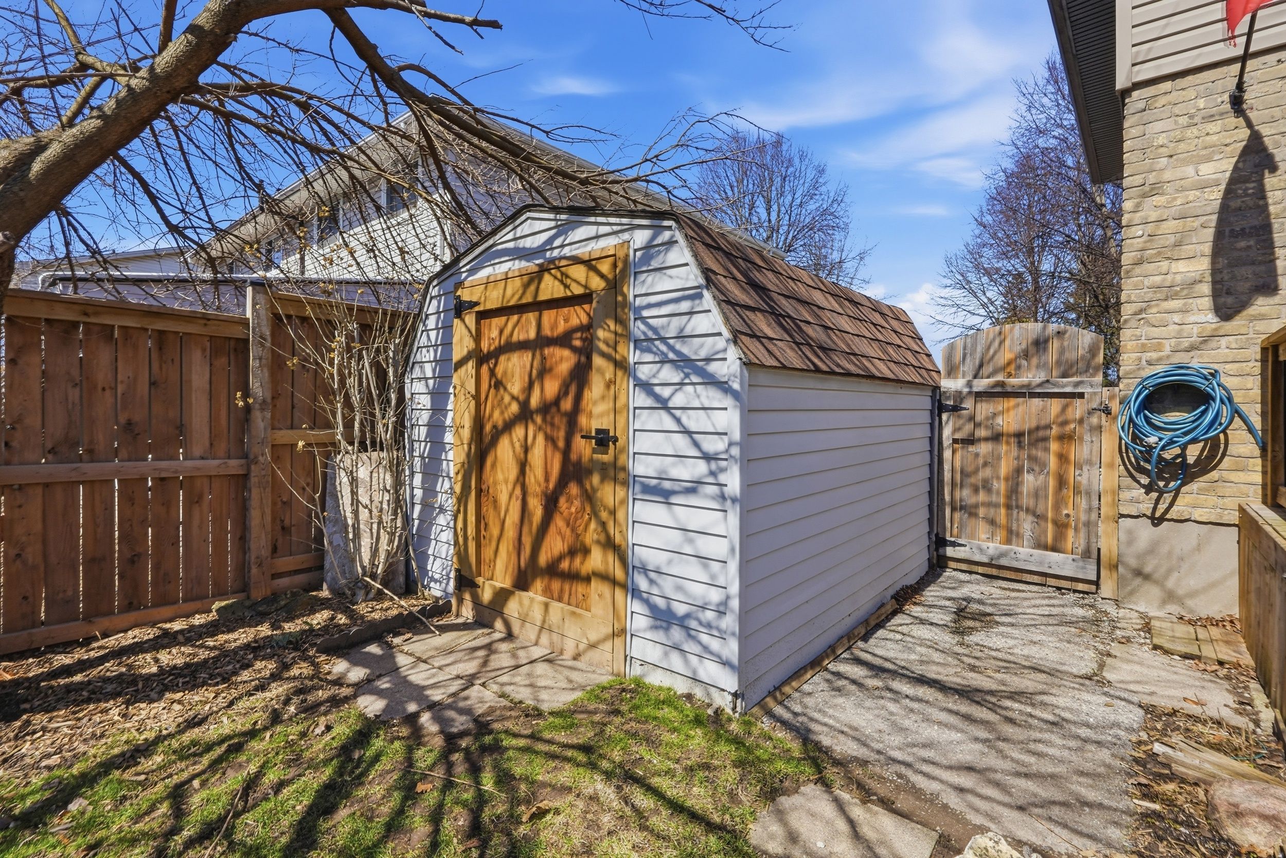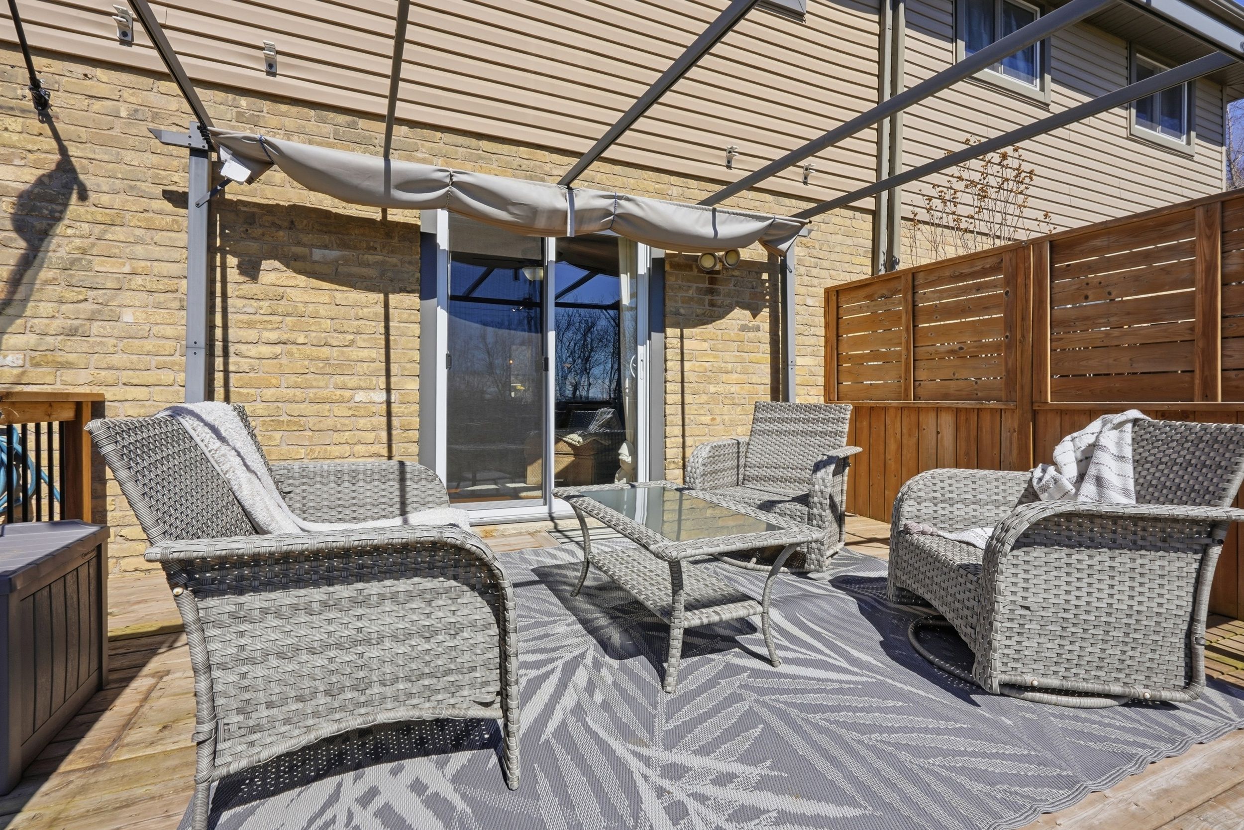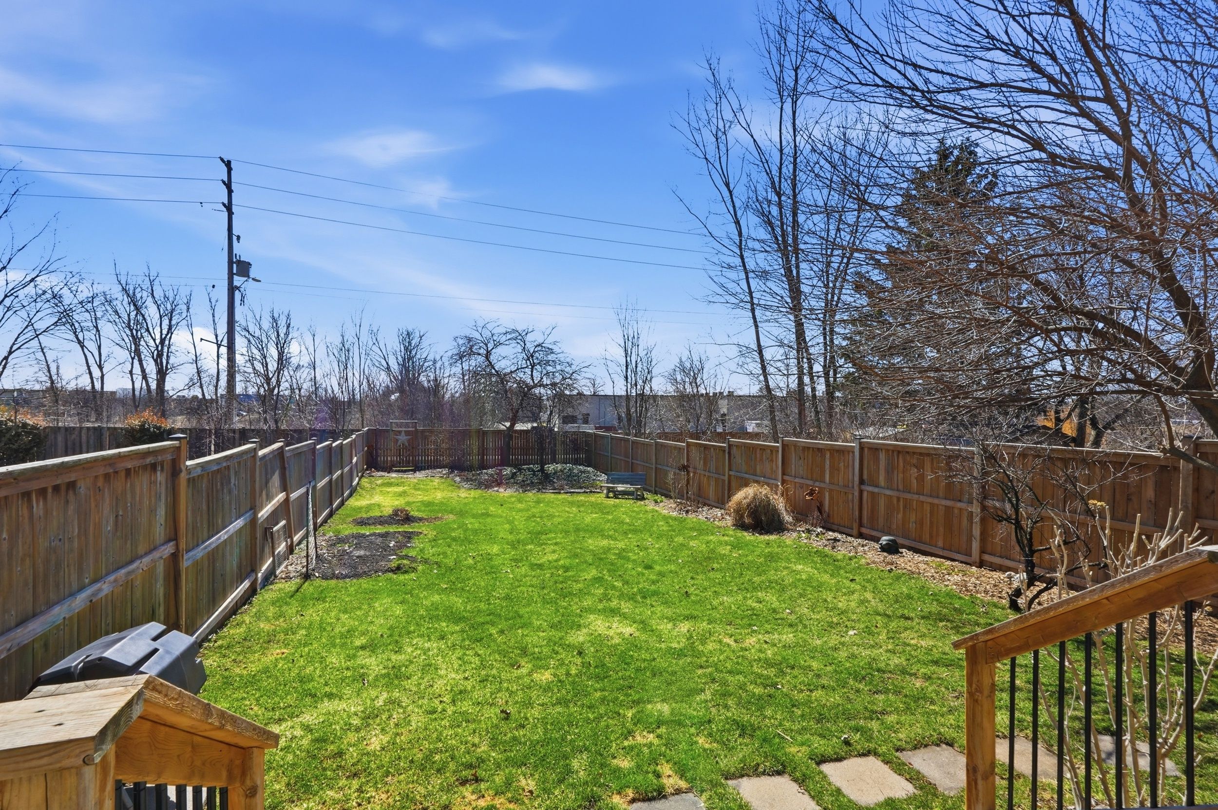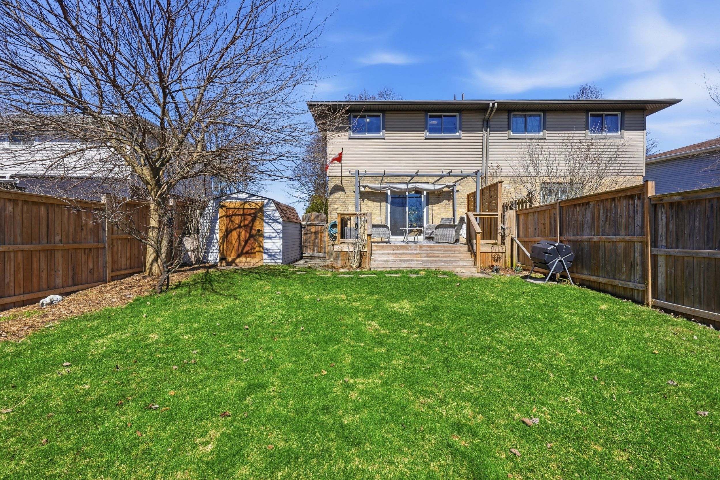• Private, fully fenced backyard with a spacious deck and patio.