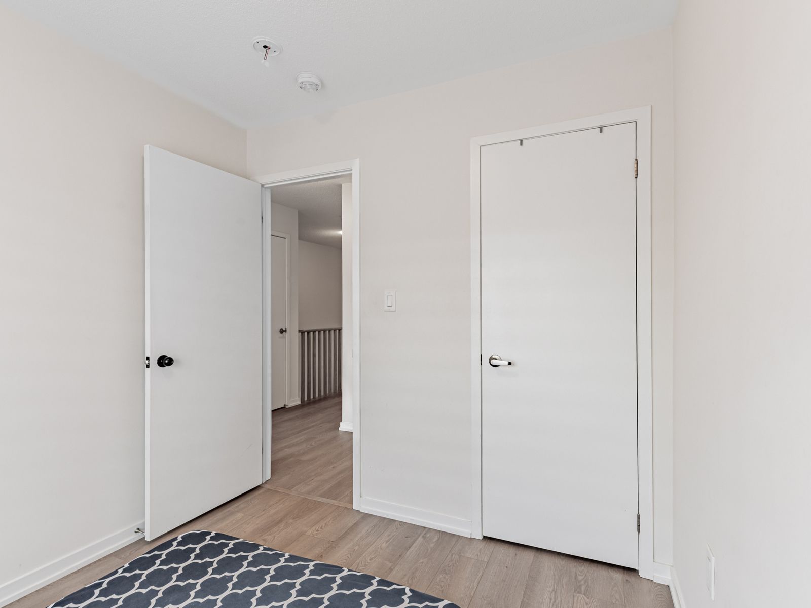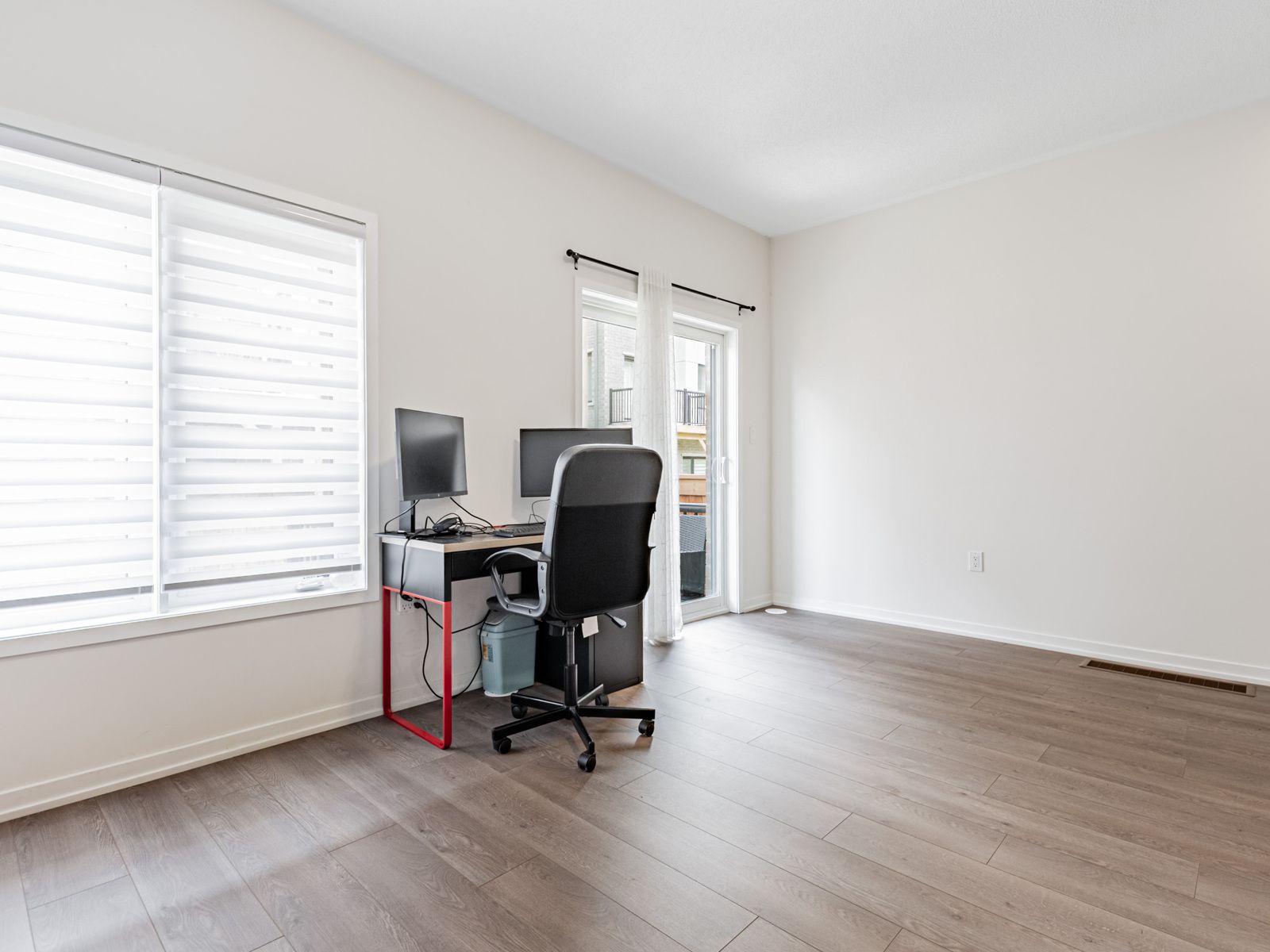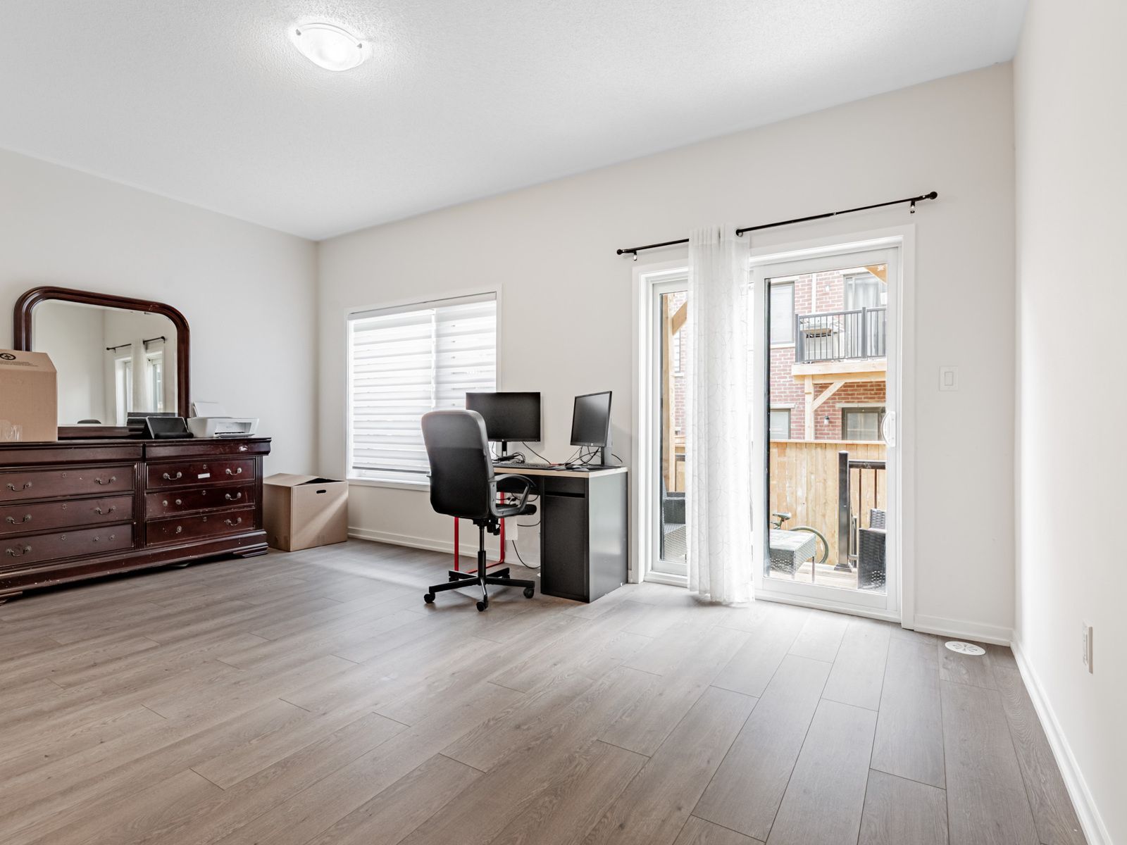 • Cozy living room with an electric fireplace and balcony access.