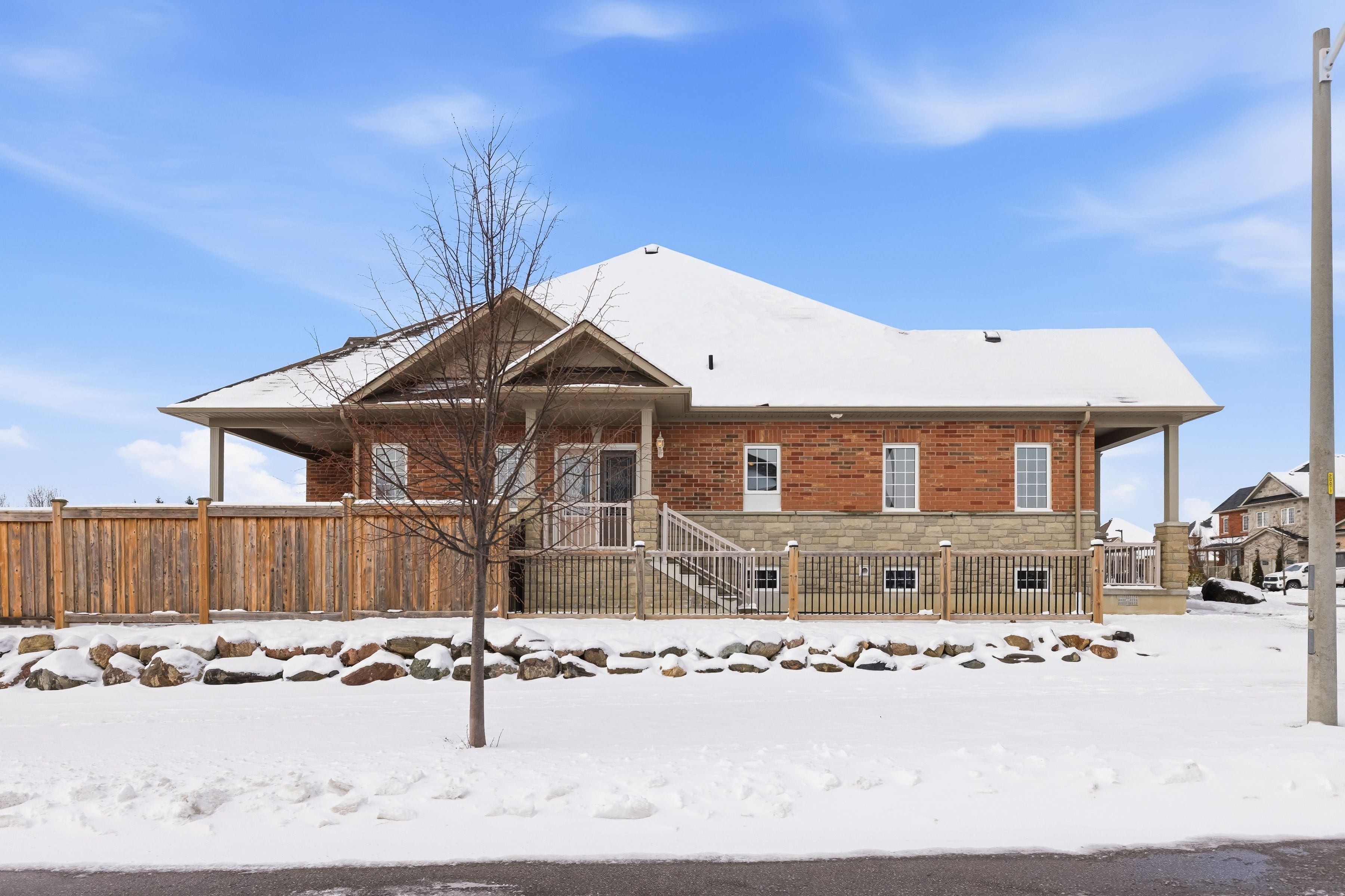 Located in one of brooklin's most sought-after family neighbourhoods, this impressive brick and stone bungalow offers over 2,057 sq ft above grade plus a beautifully finished basement with a 2nd kitchen and a separate entrance designed for flexibility and comfort. Set on a large landscaped corner lot with an interlocked driveway & walkways, covered front & back porches, fenced yard, and triple car garage, this home combines curb appeal with exceptional functionality. The open concept main floor features hardwood floors and a spacious kitchen with an island, granite countertops, a gas range, and premium kitchenaid appliances. A bright breakfast area and living room with gas fireplace walk out to the covered back porch with gas bbq hookup, creating an ideal space for entertaining or relaxing. Main floor laundry provides added convenience. Offering 3+2 bedrooms and 4 bathrooms, the layout is ideal for families or multigenerational living. The oversized primary suite includes a walk-in closet and 4-piece ensuite bathroom. The finished basement features new vinyl flooring, two additional bedrooms, a full 3-piece bath, 2nd gas fireplace, kitchen with electric range and fridge, massive cold cellar, and separate entrance walking up to the garage-perfect for multi generational living, guests, or potential rental income. Additional highlights include 200-amp service, furnace updated in 2025, and new garage door openers in 2026. All within walking distance to downtown brooklin, schools, parks, restaurants, shops, and everyday amenities, with quick access to highway 407. Don't miss this one!