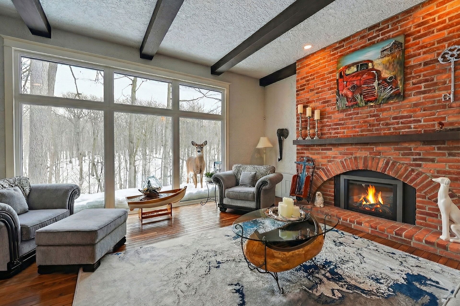 • Spacious sunken living room with floor-to-ceiling windows and fireplace.