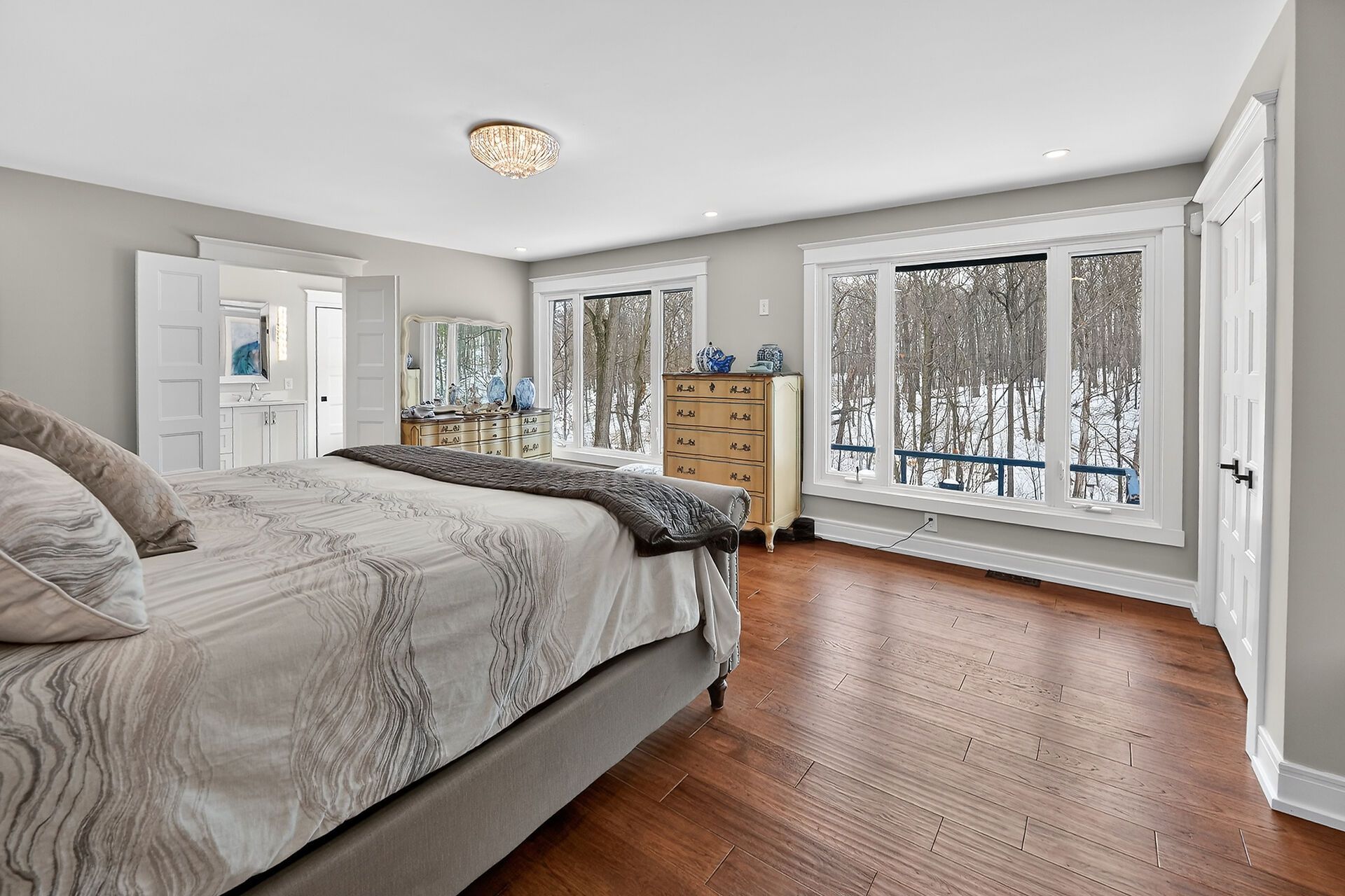 Luxury bungalow set on over 2 acres of private property backing directly onto the breathtaking woodland views, a majestic stream and vibrantwildlife that animates the wilderness. Step inside this fully renovated ranch style bungalow which offers refined living surrounded by nature. Alarge front foyer welcomes you home with stunning views of the niagara escarpment. The expansive chef-inspired kitchen boasts of heatedfloors, a large island, granite countertops, a fulgor milano 6-burner gas stove and oven, a walk-in pantry with built-in second oven. Entertaineffortlessly by the gas fireplace or at the elegant wet bar accented with a black walnut counter and bar fridge. Step out to the upper deck tobarbecue with your herb garden at your side or simply take in the views. The sunken living room features floor-to-ceiling windows overlookingthe escarpment and a second gas fireplace, creating a warm and inviting ambiance. The main-floor primary suite includes a luxurious 5-pieceensuite with heated floors and a walk-in closet, while two additional main-floor bedrooms each enjoy private 3-piece ensuites. Convenient main-floor laundry and garage access complete the level. The fully finished lower level offers an office, exercise room, second kitchen and laundryarea, bar and games room, fourth bedroom, and 3-piece bath, with a separate entrance - perfect for guests or multi-generational living. Mostlyall newer windows, doors, updated kitchen, 5 bathrooms, flooring throughout, eaves, decks, garage doors, and openers provide peace of mind. An exceptional opportunity combine luxury, natural beauty and in town convenience.