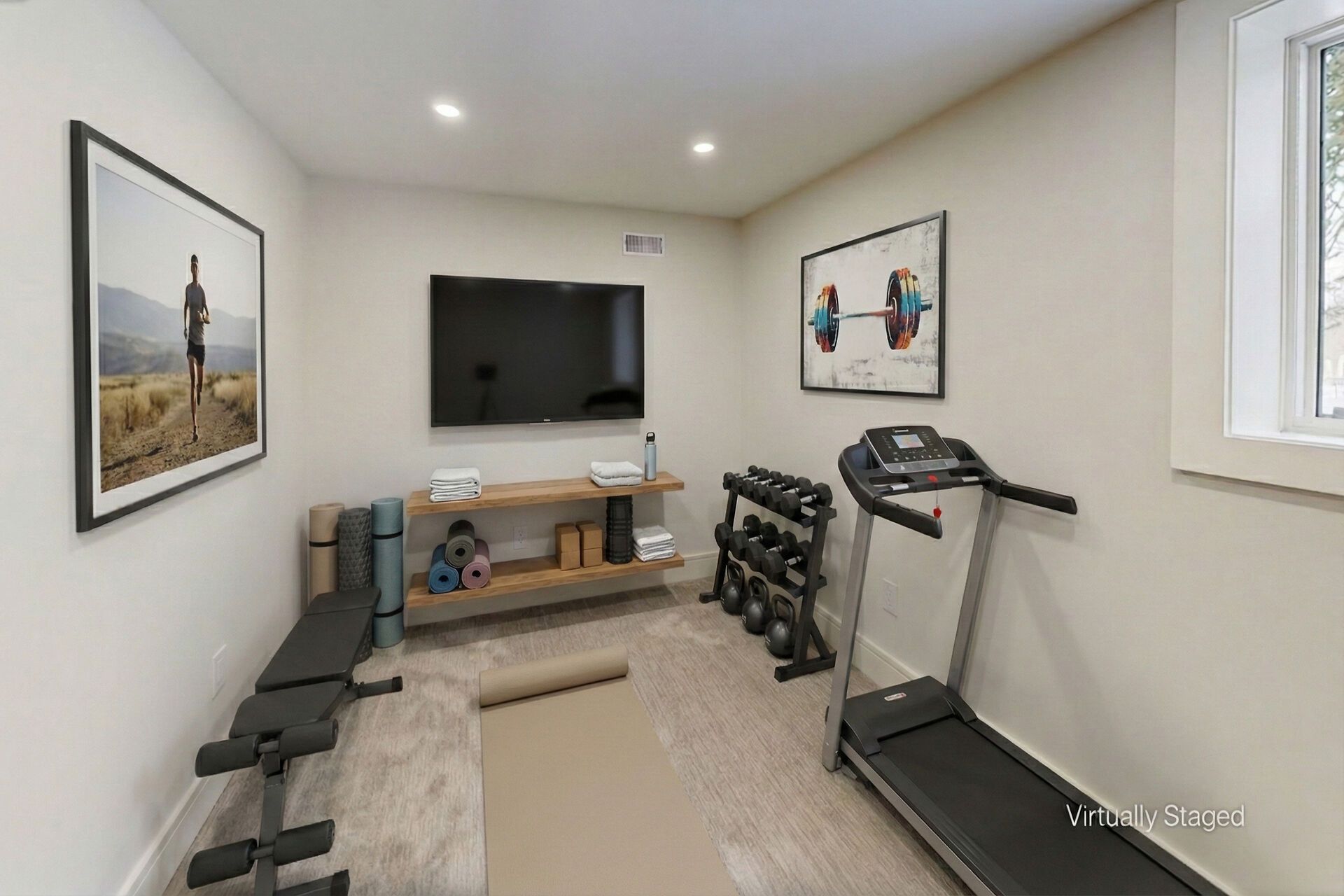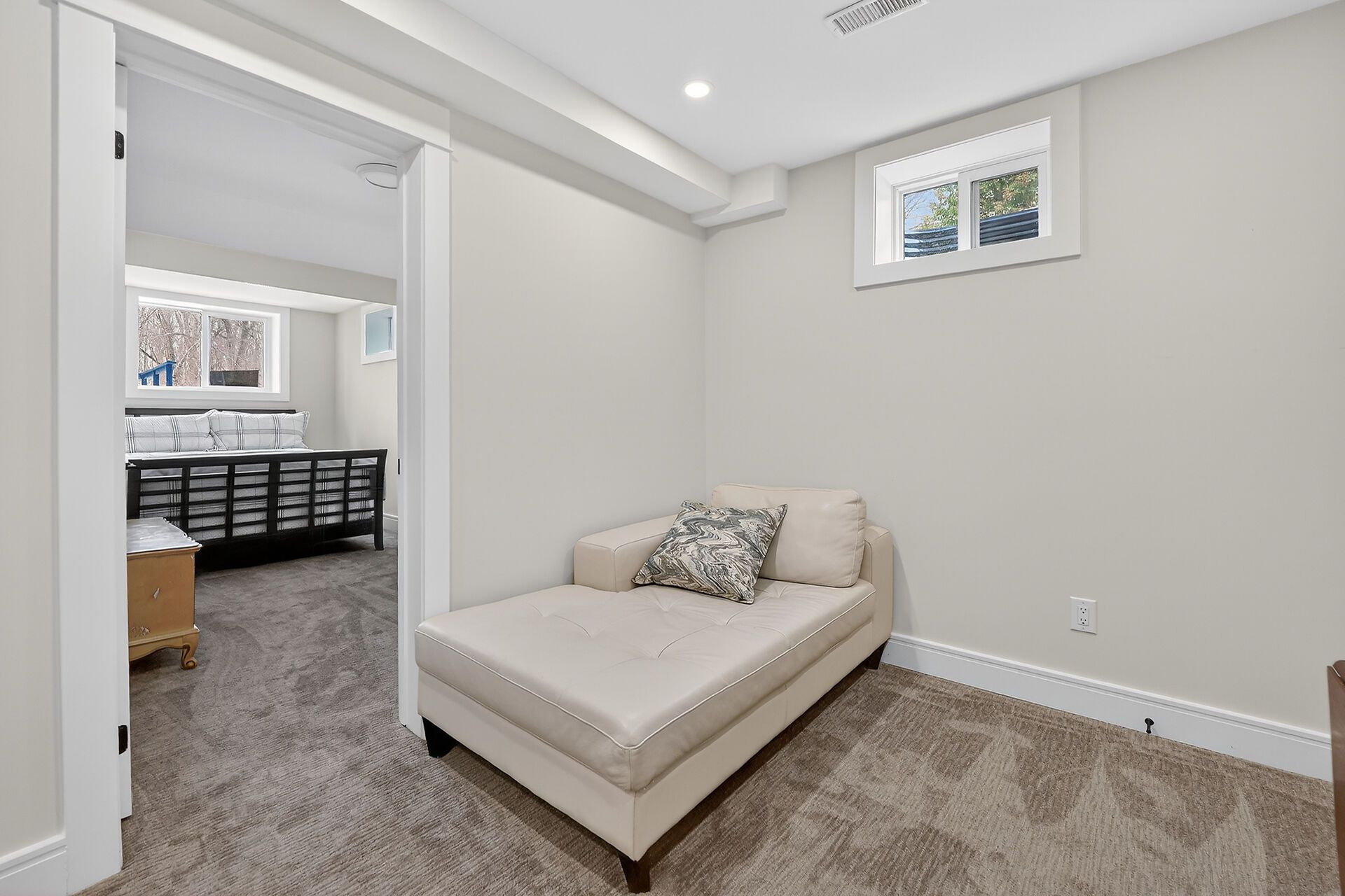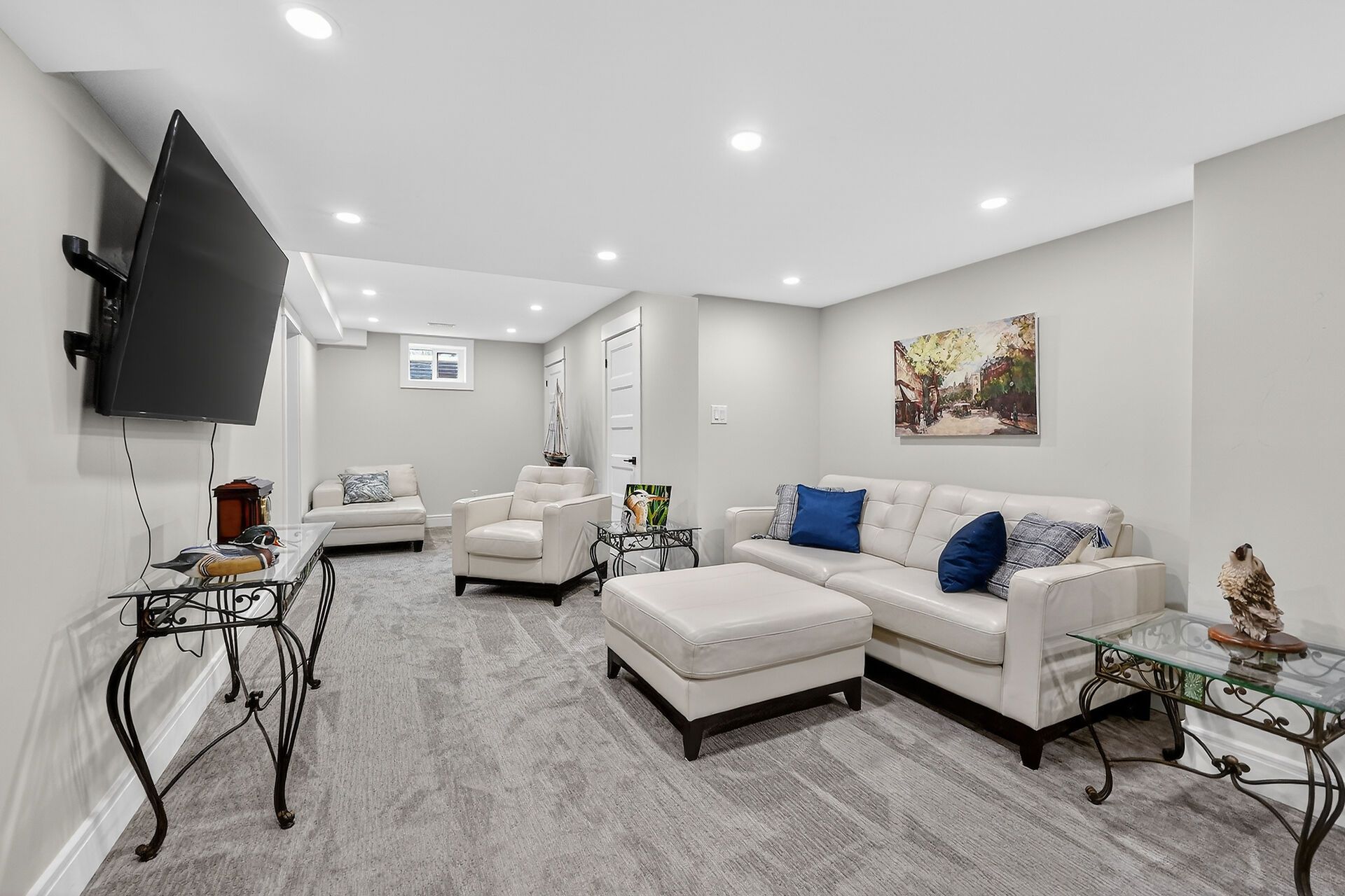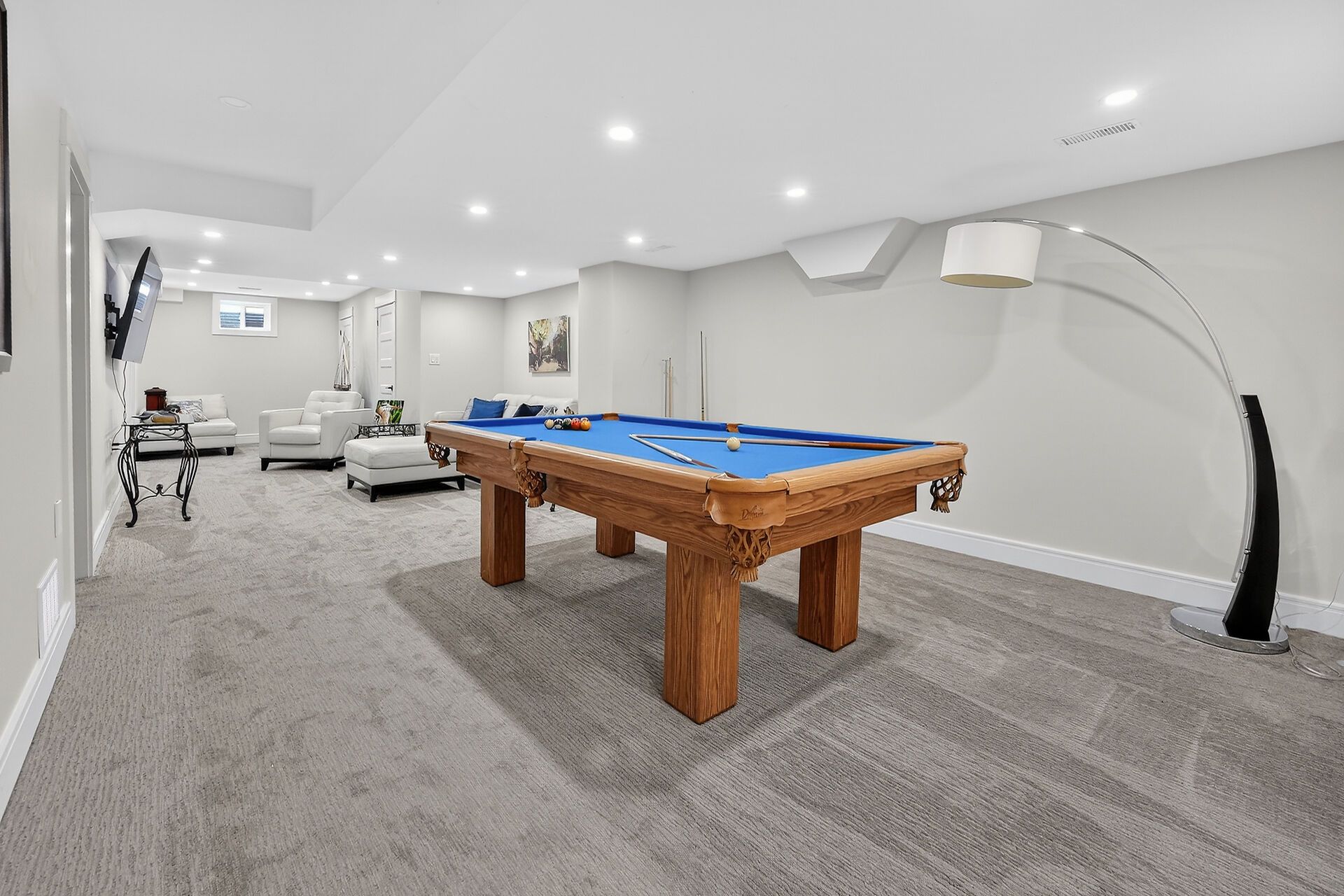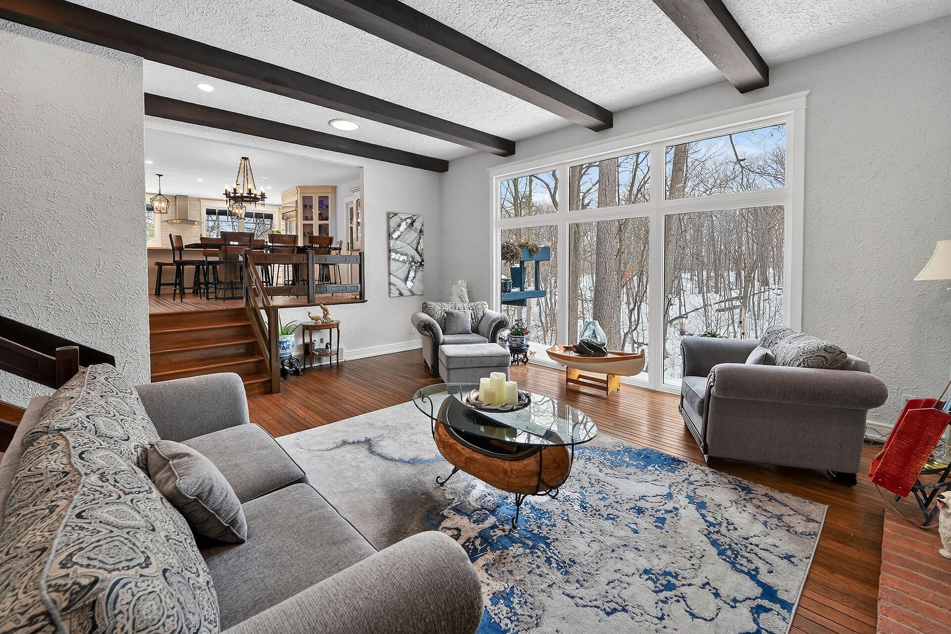 • Multiple entertaining spaces, including a sunken living room with floor-to-ceiling windows.