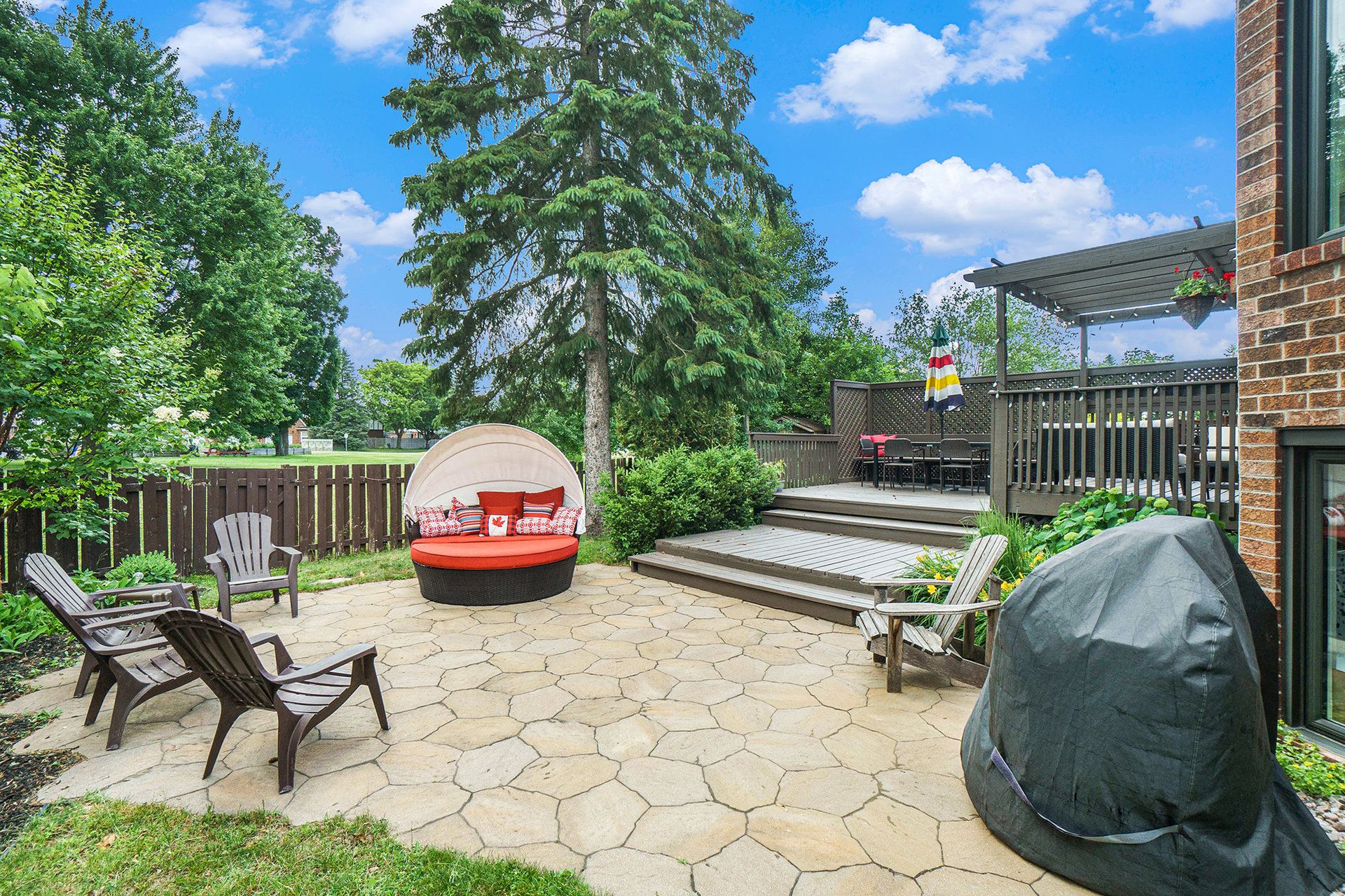 • Beautifully landscaped backyard with deck and patio for outdoor entertaining.