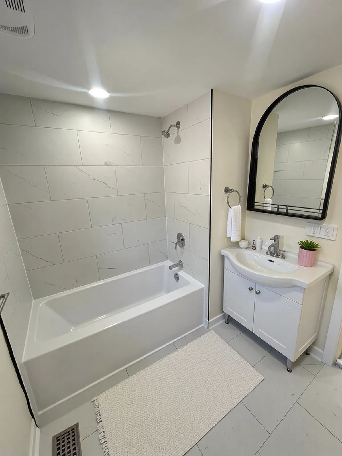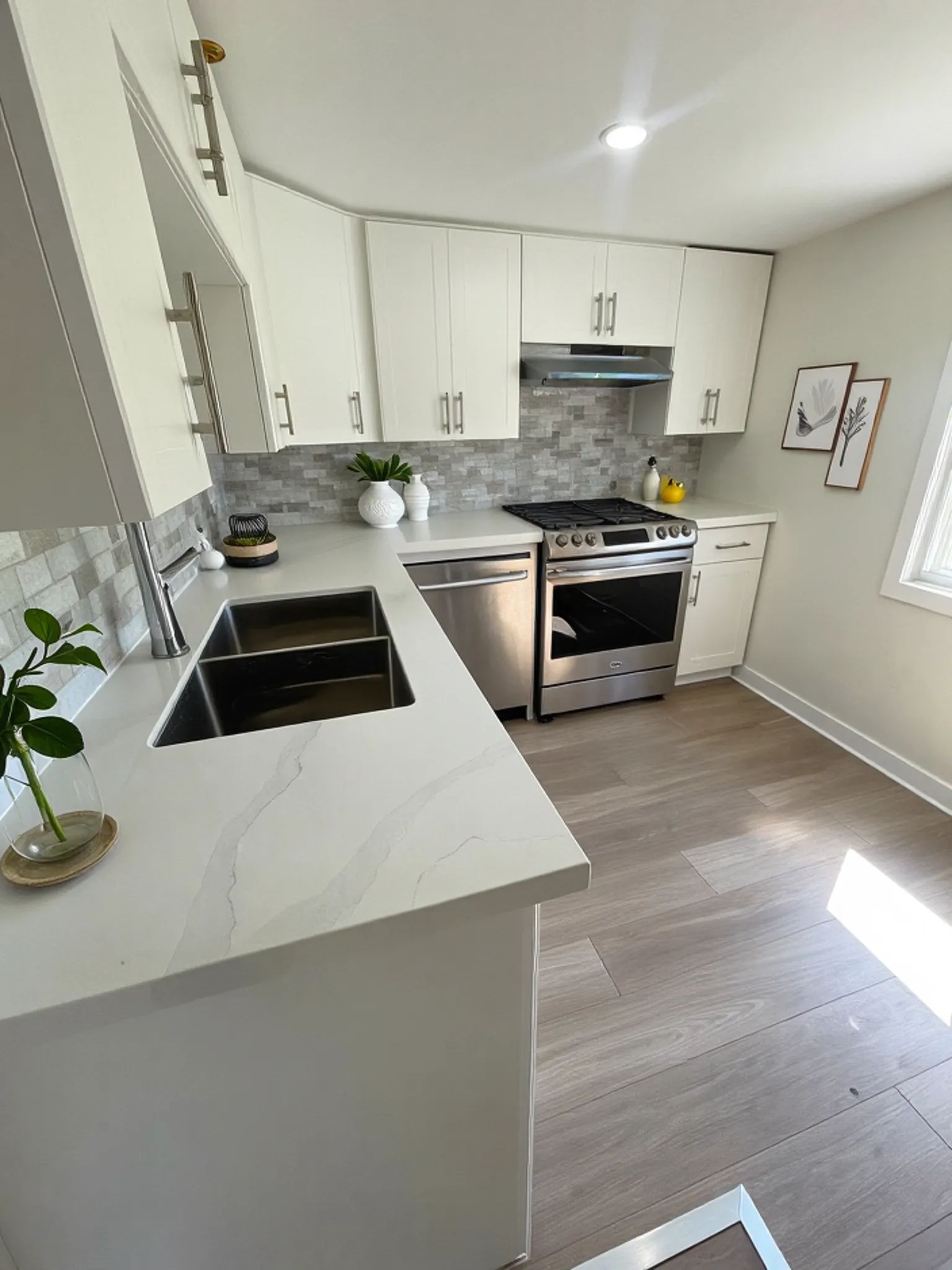 • Renovated bathroom and kitchen with quartz countertops and stainless steel appliances.
