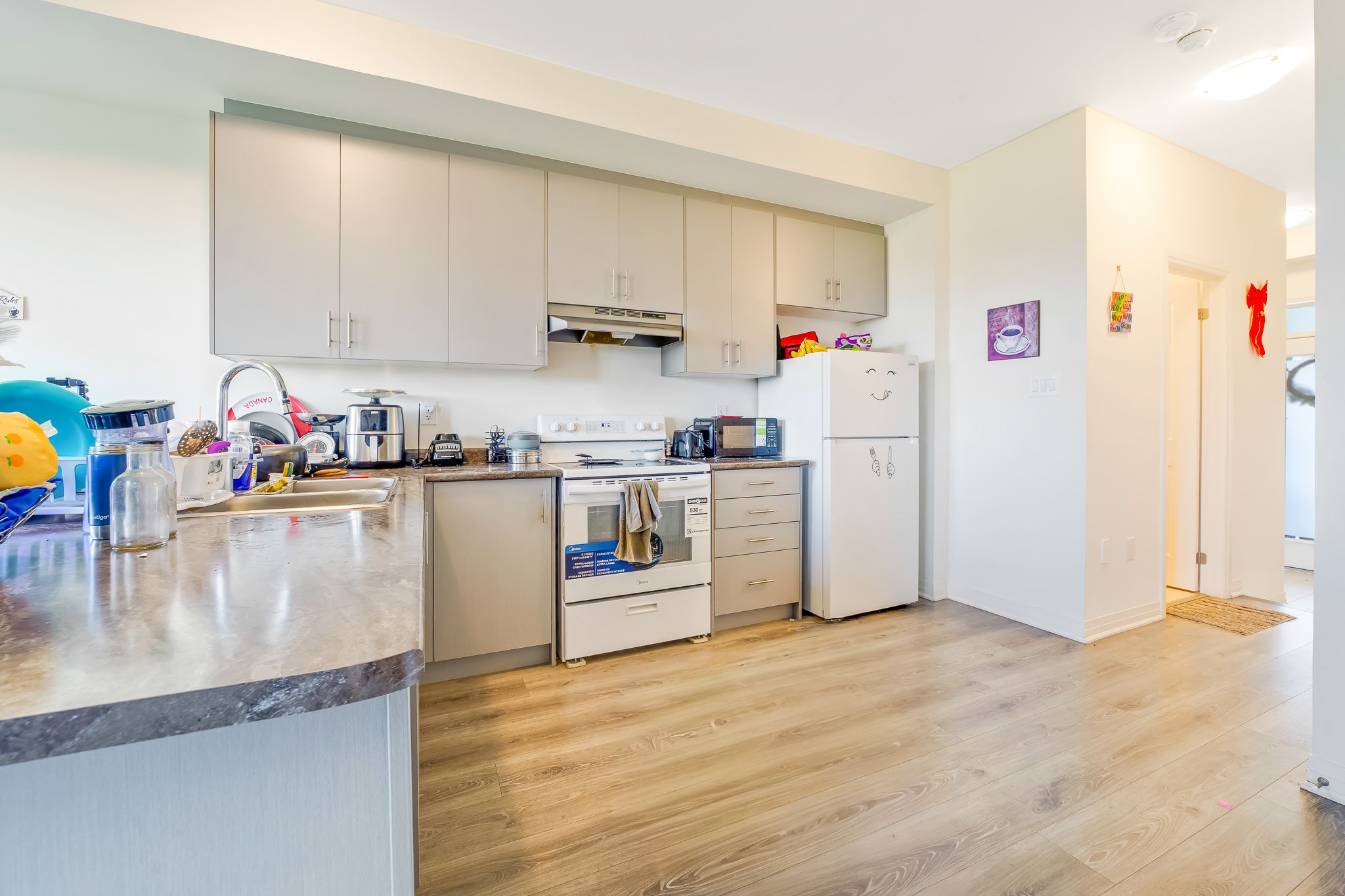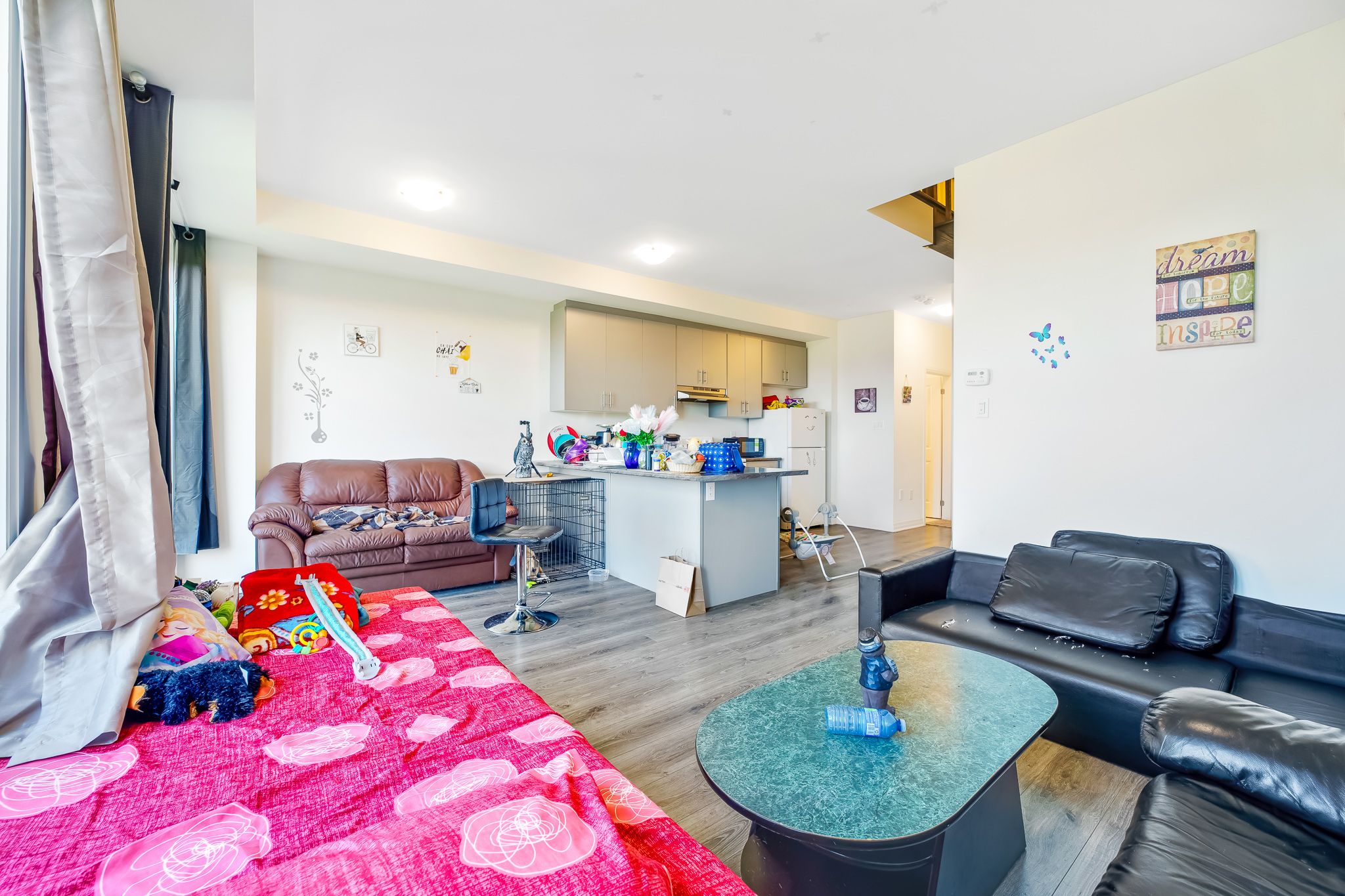 This stunning townhouse offers an exceptional opportunity to own a spacious 3-bedroom, 3-bathroom home in a highly sought-after location. Perfectly situated near highway 400, south barrie go station, scenic walking and cycling trails, top-rated schools, and vibrant shopping districts, this home is ideal for both commuters and families. Enjoy quick access to friday harbour resort, golf courses, and year-round recreational amenities right at your doorstep! The exterior features charming curb appeal with a covered front porch and the convenience of no sidewalk, allowing parking for two vehicles in the driveway. Step inside to discover high-quality laminate and tile flooring throughout the main level and bathrooms, creating a modern and low-maintenance space. The open-concept kitchen boasts rich-toned cabinetry, a range hood, electric stove, and refrigerator, making it perfect for both everyday living and entertaining. The primary bedroom offers a private retreat complete with a 3-piece ensuite and walk-in closet, providing the perfect space to unwind.