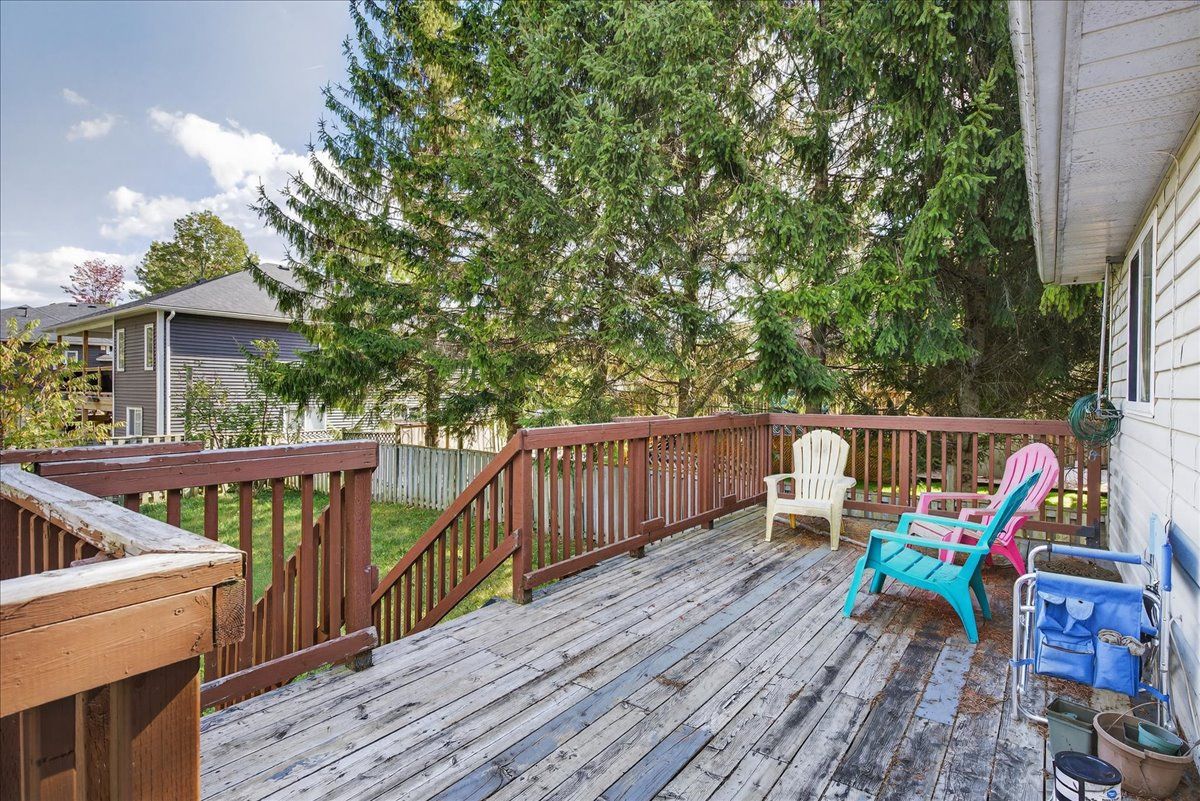 • Fully fenced backyard with mature trees and a deck for outdoor relaxation.