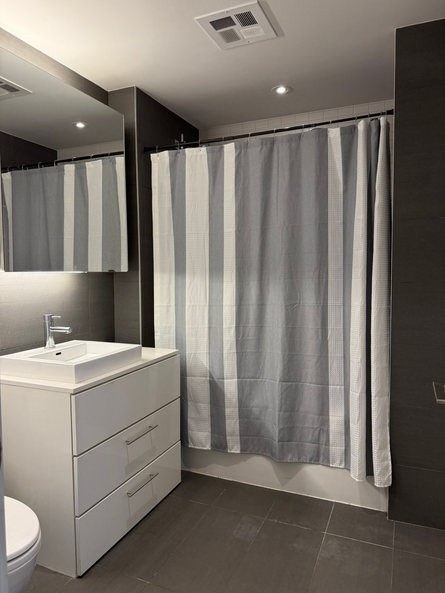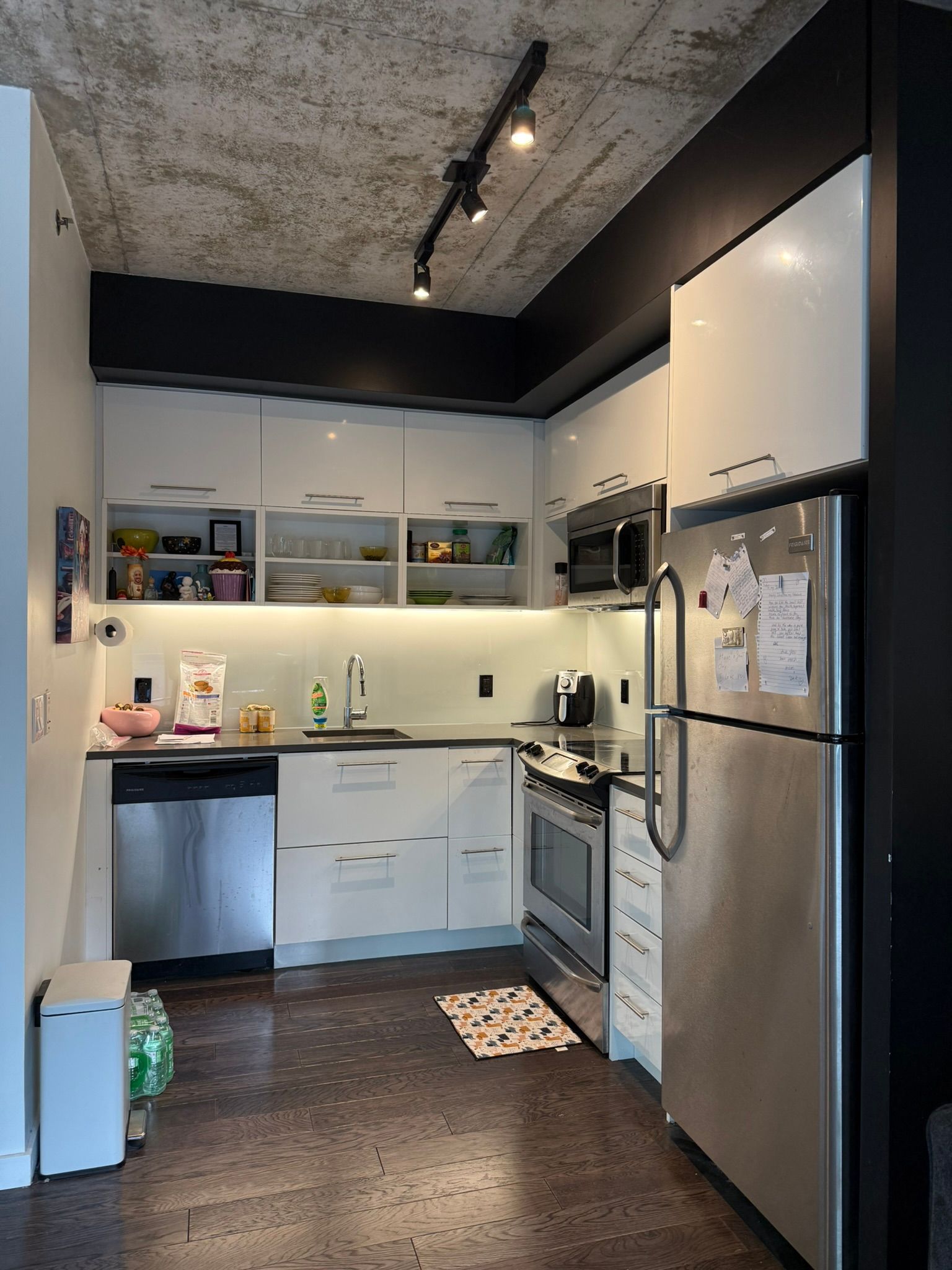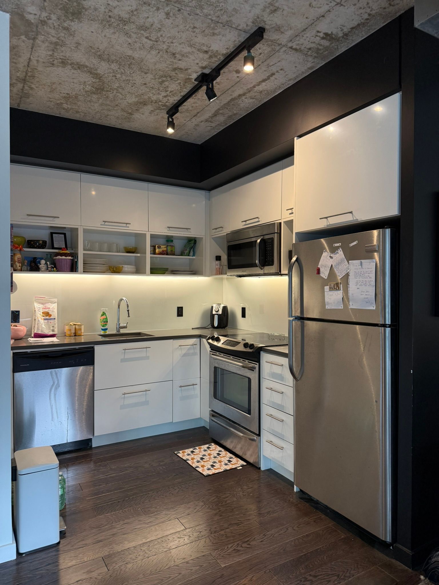 • Modern kitchen with stainless steel appliances and sleek quartz countertop.