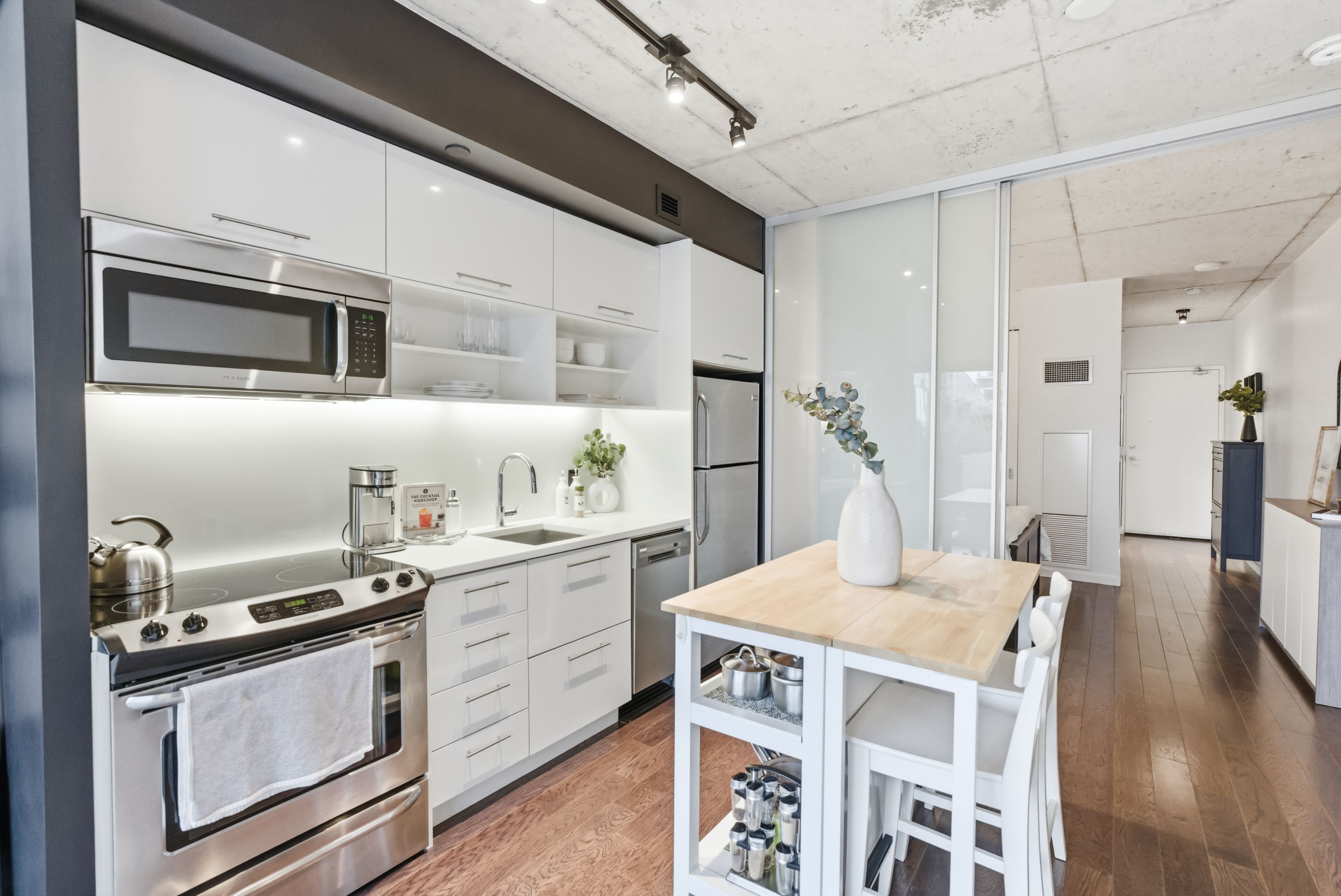 Completed in 2013, river city phase 1 is a leed gold-certified building in the vibrant corktown and west don lands communities, with easy access to riverside, leslieville, the distillery district, st. Lawrence market, corktown commons, the don river valley, toronto's waterfront trail, and the dvp. The ttc 504 king streetcar is right at your doorstep with routes 503 and 501. This modern loft-style suite offers approximately 550 sq ft of functional living space, plus a 55 sq ft balcony with composite decking panels. Located on the 6th floor, the unit provides direct access to the interior walkway connecting to the adjoining building and outdoor courtyard and pool. It boasts a superior south-facing exposure overlooking the pool area, flooding the space with natural light. Features include 9-foot exposed concrete ceilings and stylish walnut hardwood flooring throughout. The contemporary white kitchen is equipped with stainless steel appliances, new dishwasher, and grey quartz countertops. The spa-inspired, fully tiled bathroom features a soaker tub, updated vanity and toilet, mirrored cabinet, and convenient ensuite laundry. Outstanding building amenities include 24-hour concierge, outdoor courtyard and swimming pool with community bbq areas, fully equipped fitness centre, two spacious party rooms with lounge, bar, kitchen, dining area and billiards table, guest suite, and sun deck. Come make the celebrated river city development your home and enjoy the perfect blend of modern living, convenience, and style.