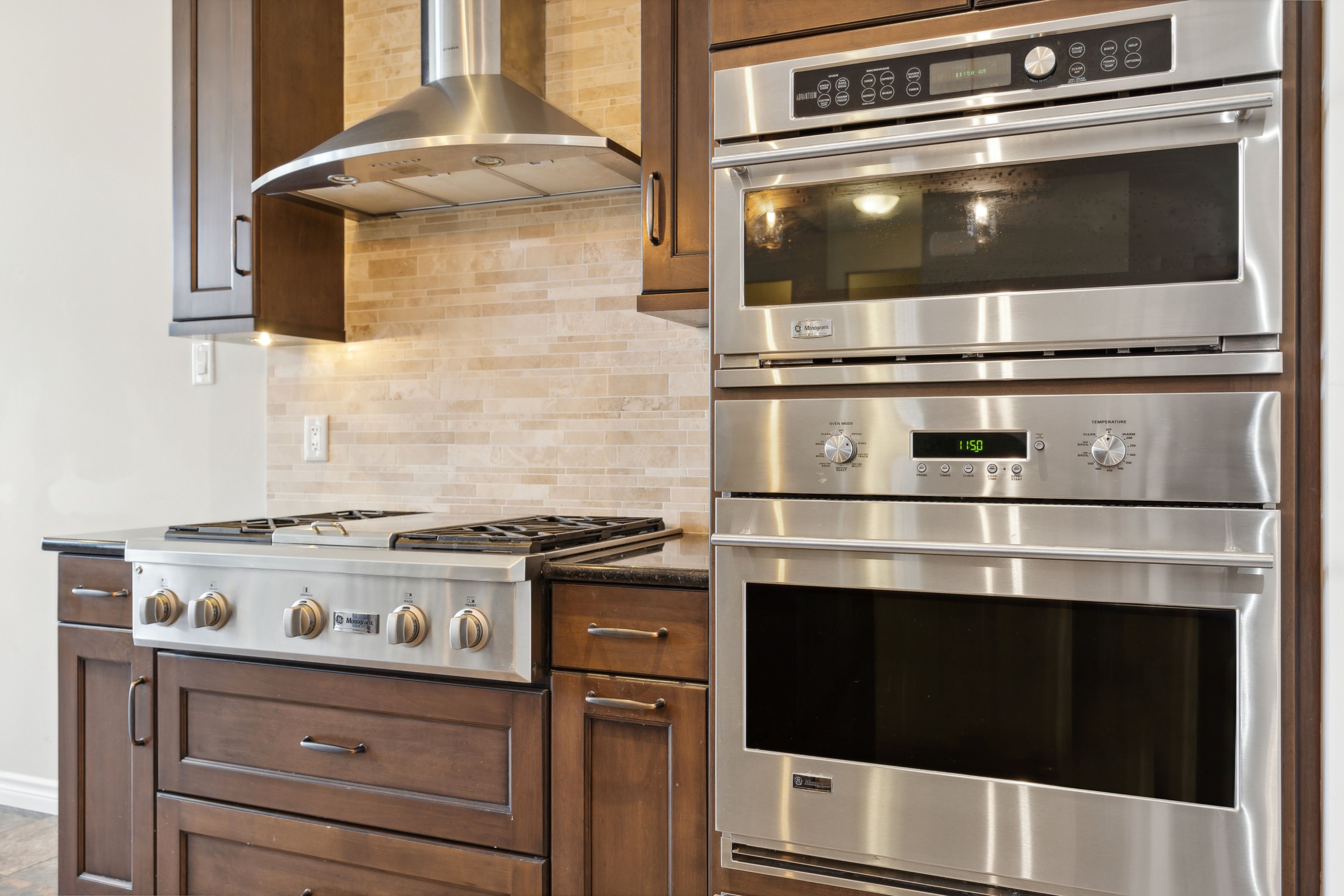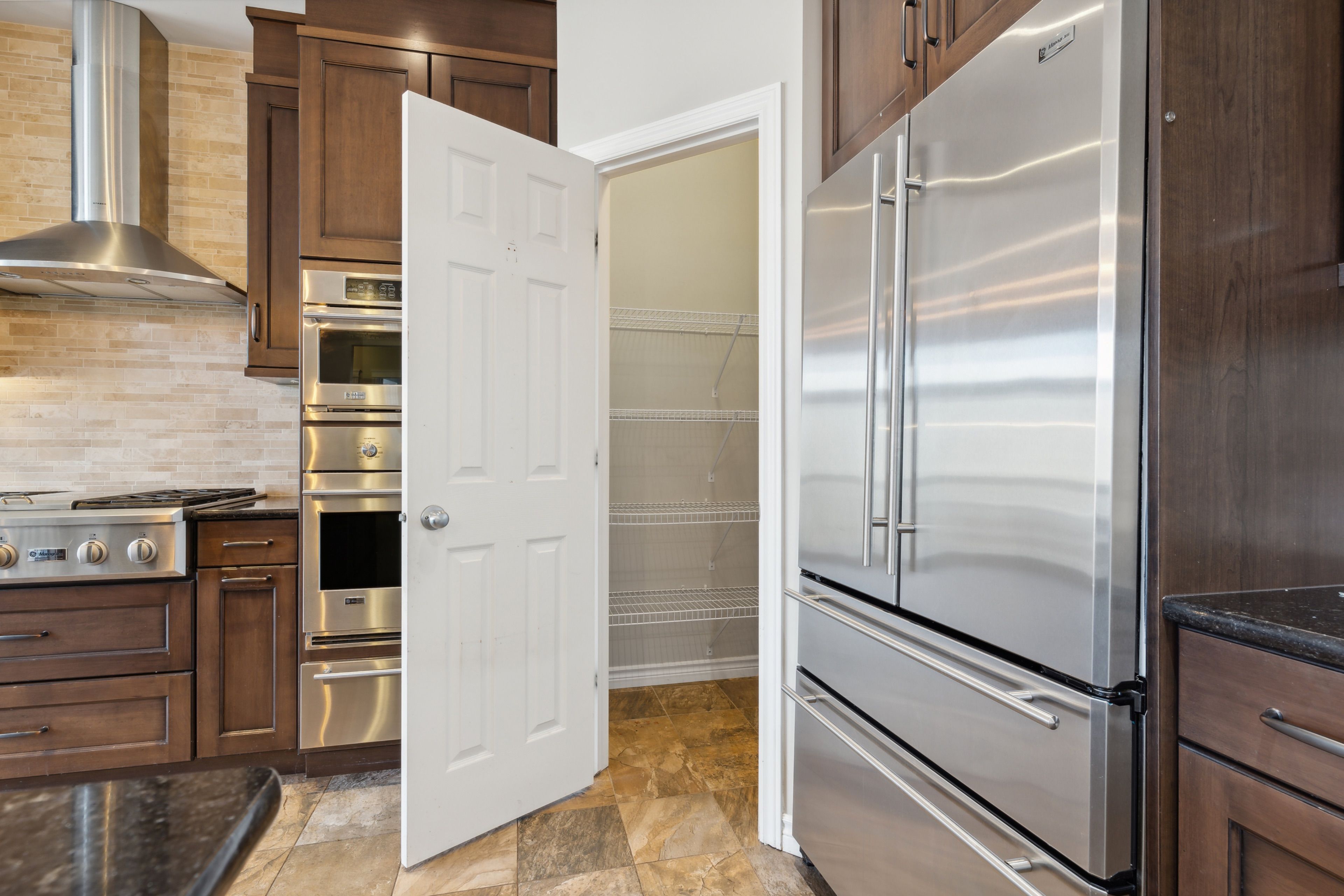 • Upgraded kitchen with high-end appliances, gas range, and walk-in pantry.