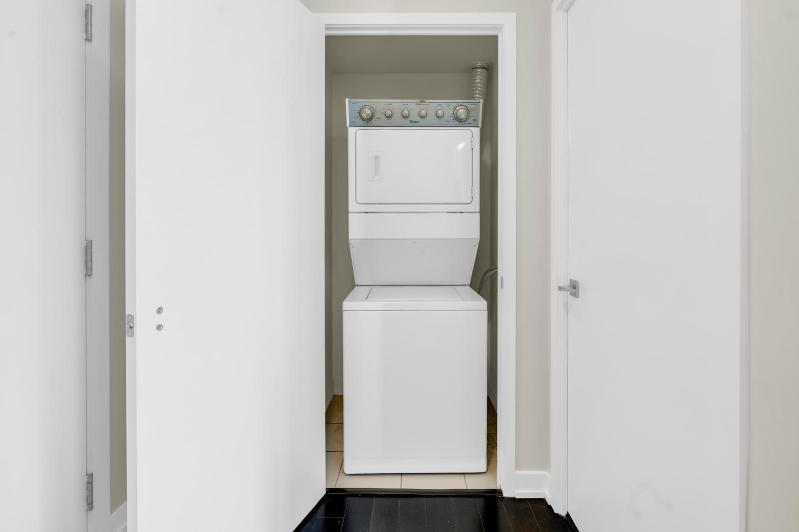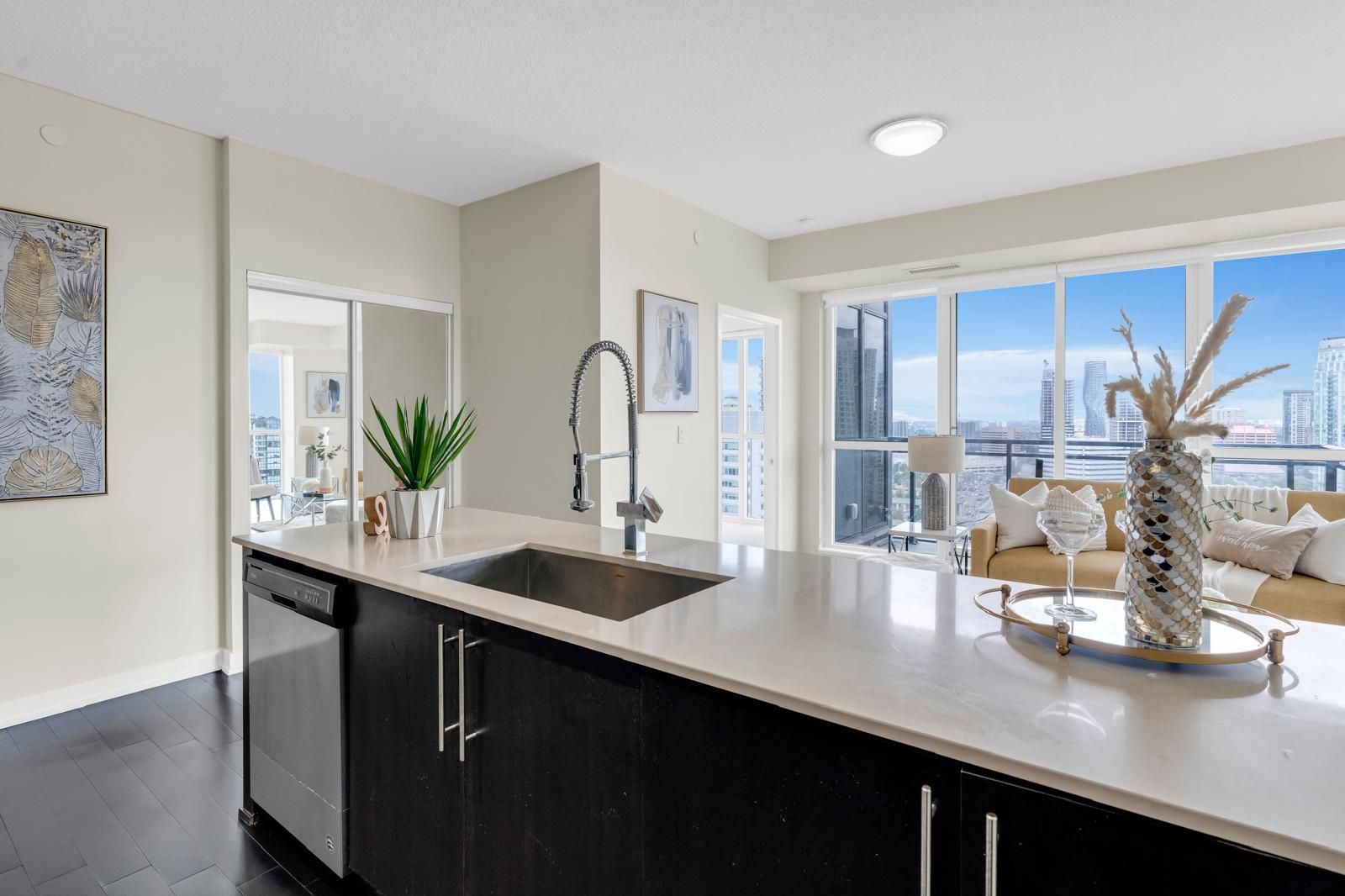 Unobstructed south and east views, clear view of the lake. 2 bedrooms 2 bath corner unit with parking and locker. Dark laminate flooring throughout. Quartz counter. Down town mississauga in the heart of square one area. Close to the public transit, celebration square, central library, ymca, sheridan college. Cafe's and restaurants at ground level steps away. Open concept floor plan . Stainless steel appliances, building has excellent amenities including guest suites, high end gym sauna, indoor swimming pool, terrace, bbq area, volley ball court, party room, games room, childers play area, meeting room, library and much more