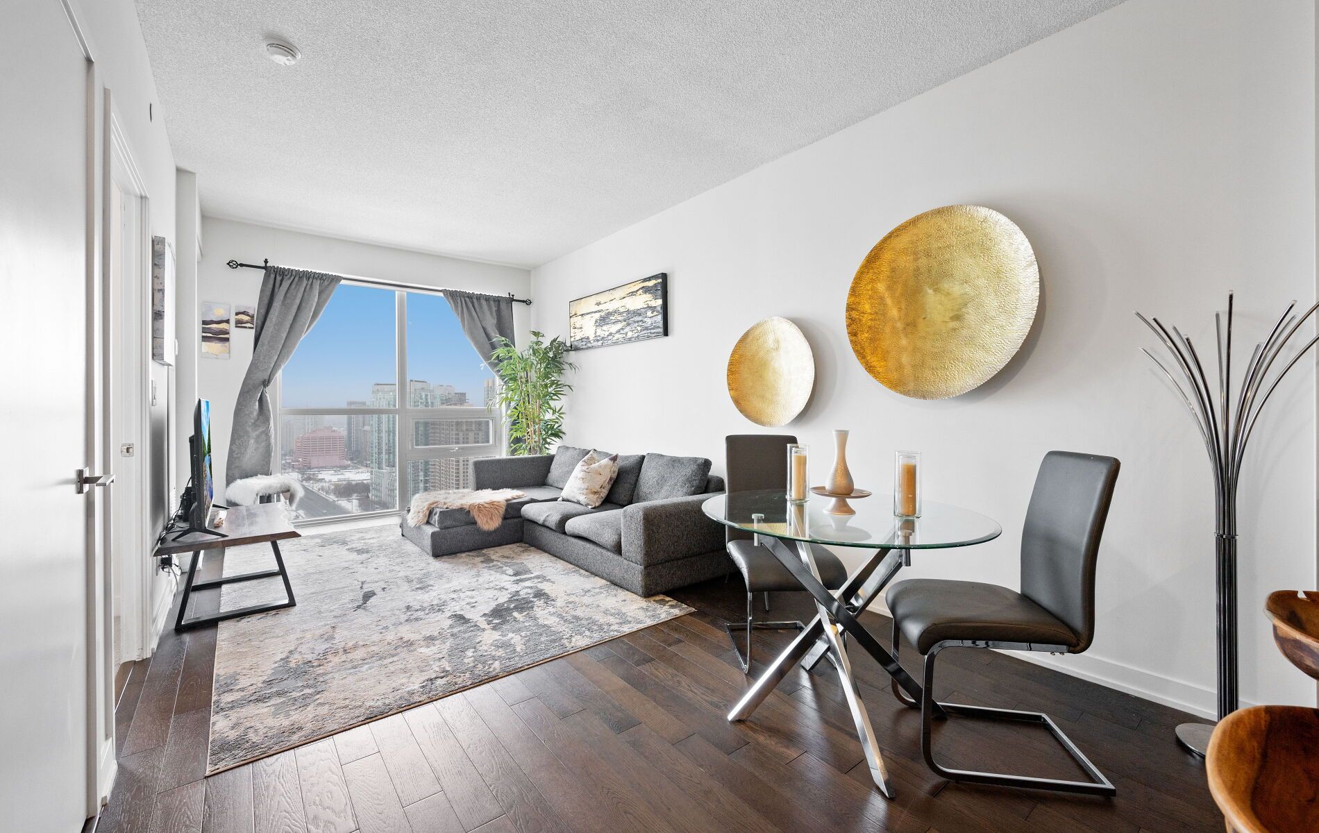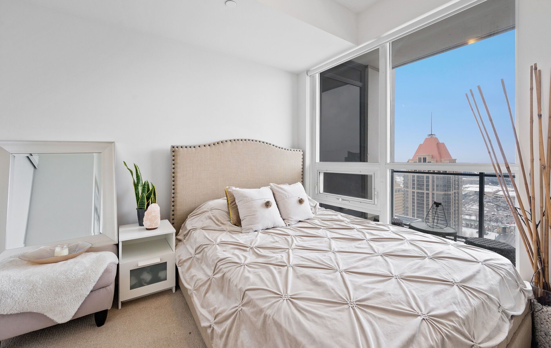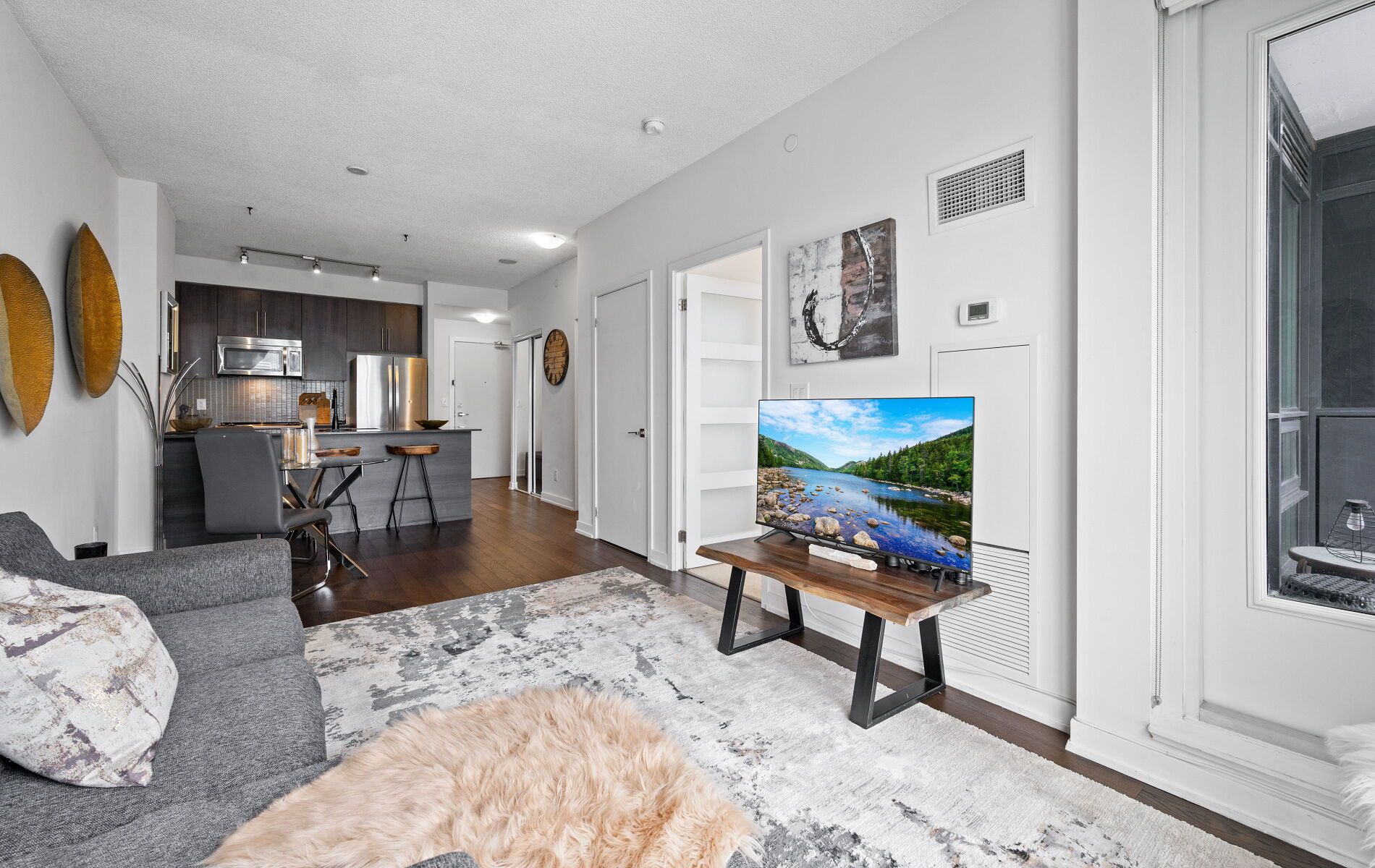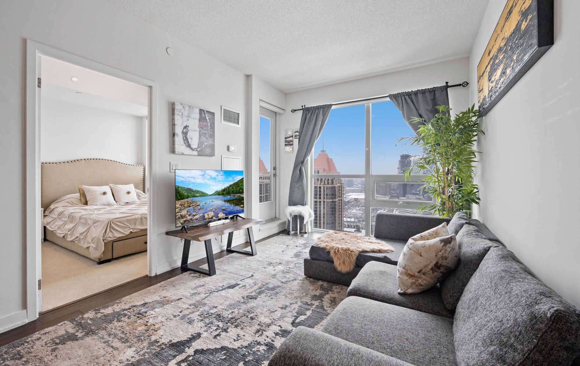 • Stylish 1-bedroom condo with open-concept living and expansive windows.