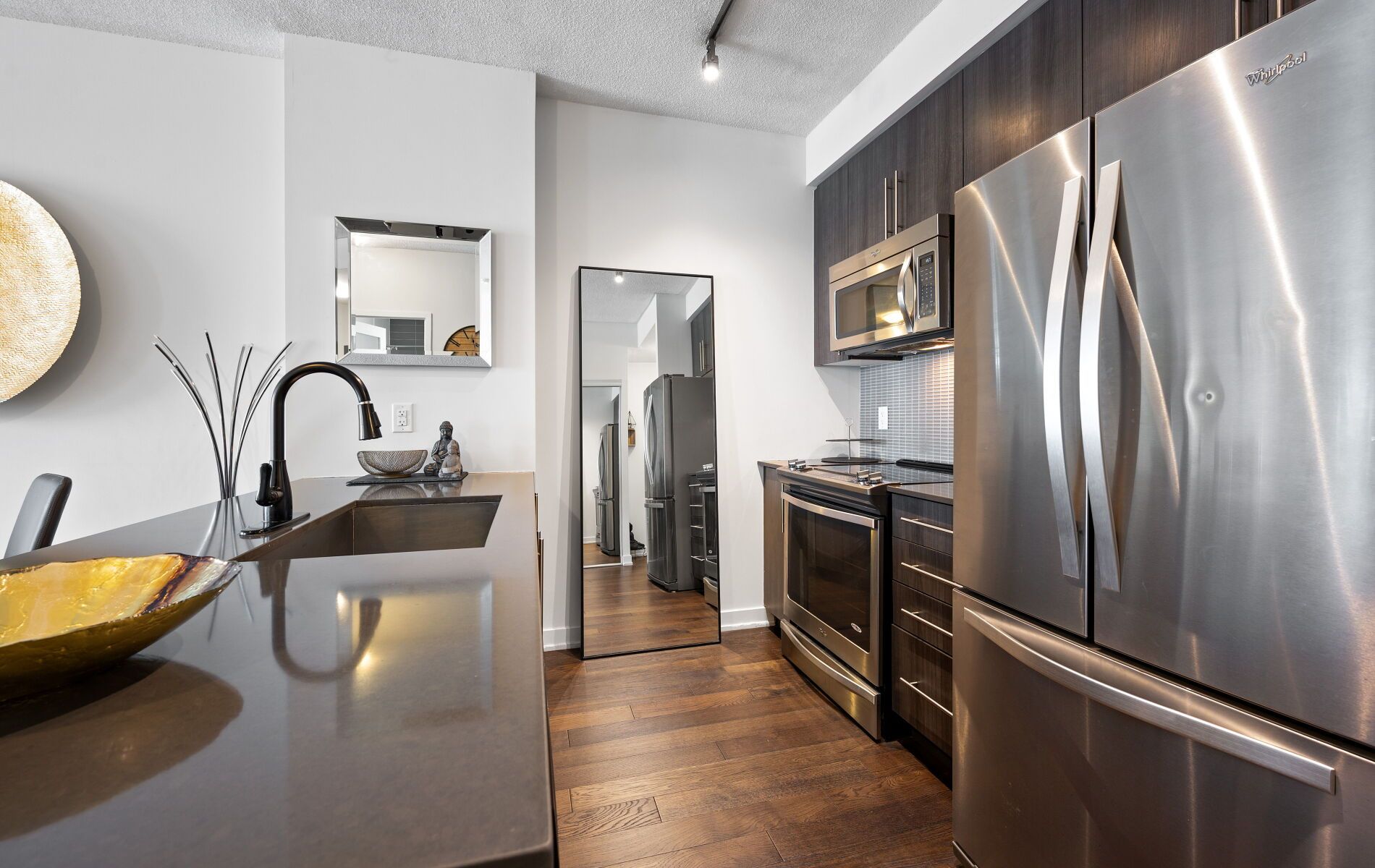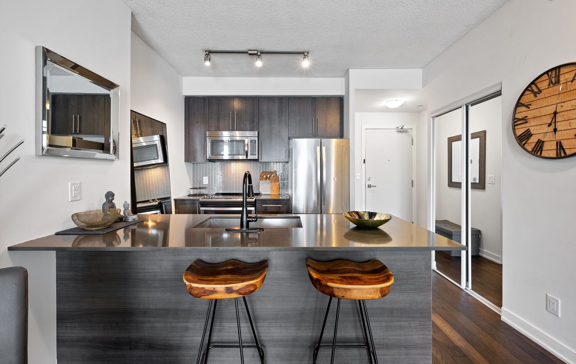 • Modern kitchen with stainless steel appliances and breakfast bar for casual dining.