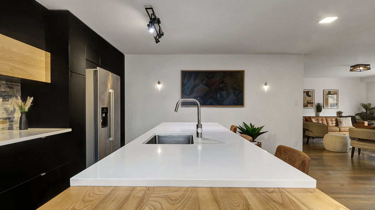 • Chef's kitchen boasts sleek cabinetry, quartz countertops, and an oversized island.