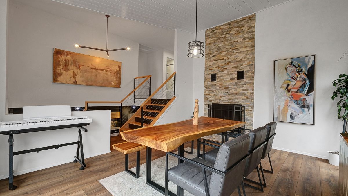 • Bright open-concept living area featuring a gas fireplace and patio access.