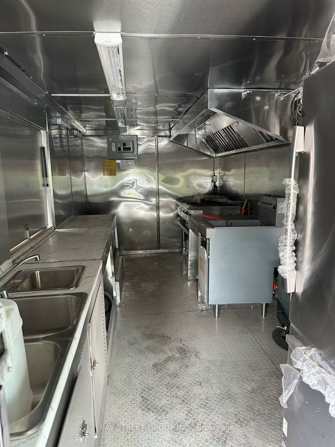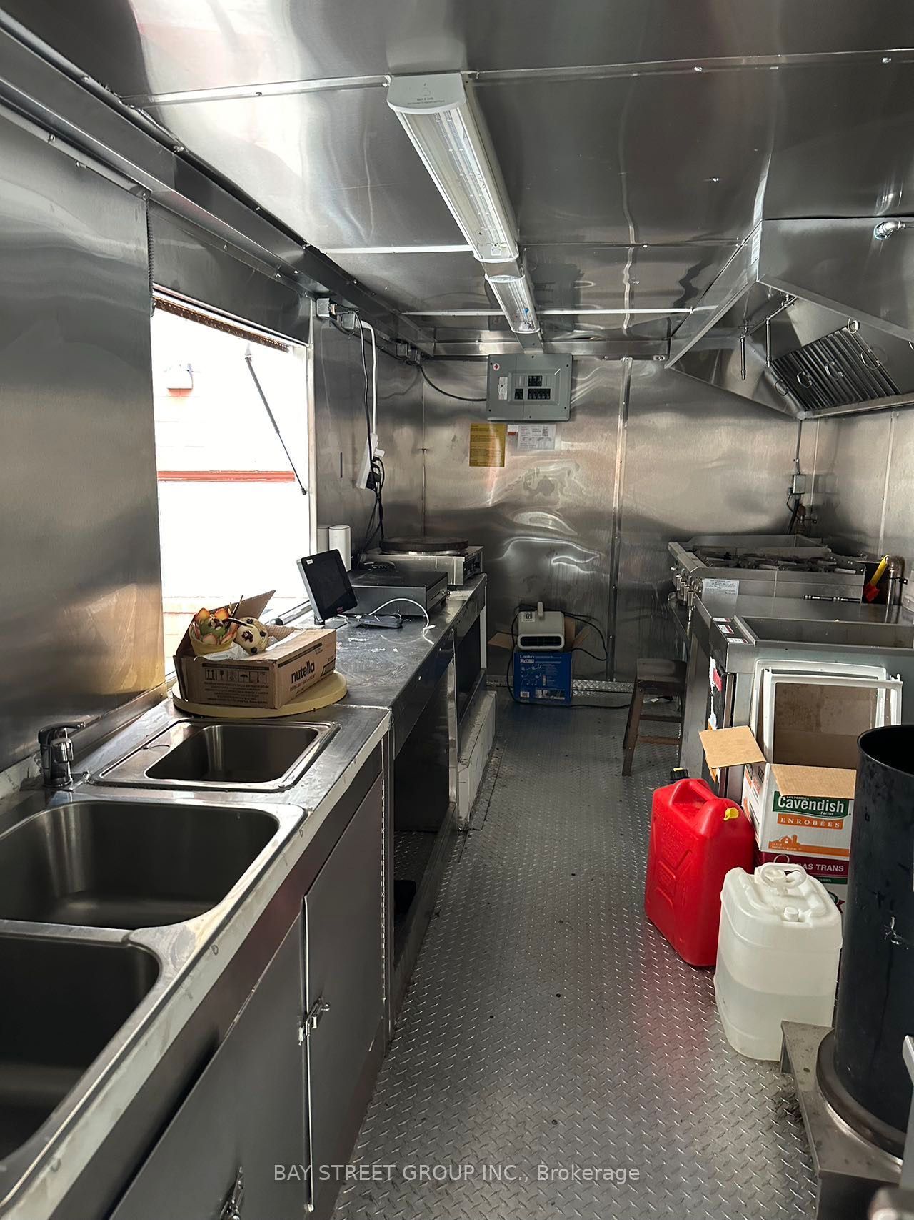 • Includes commercial exhaust hood, fryer, and refrigerator for cooking.