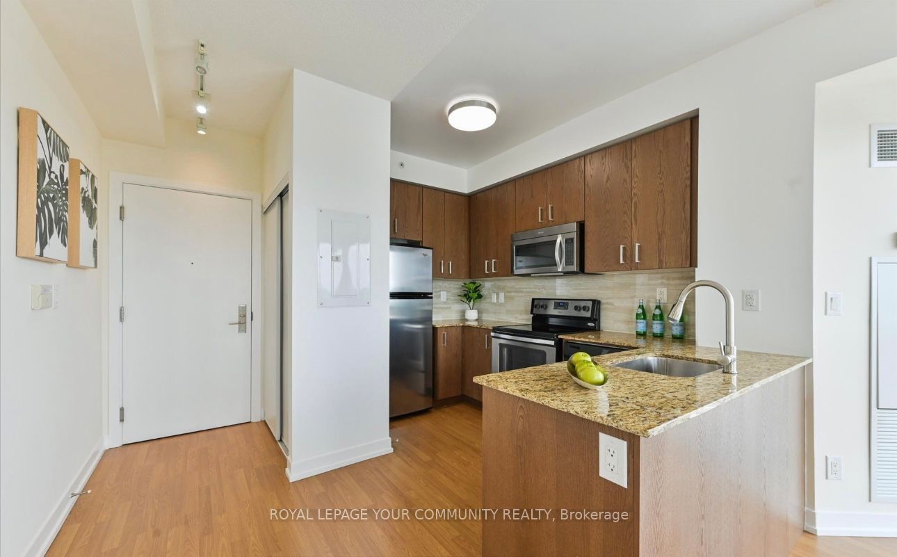 Welcome to evolution condo. Boutique-style, sun-filled 1-bedroom suite featuring soaring 9 ft ceilings, floor-to-ceiling windows, and a functional open-concept layout. Enjoy a spacious wrap-around balcony (approx. 352 sq. Ft.) with unobstructed views, ideal for relaxing or entertaining. The modern kitchen offers granite countertops, stainless steel appliances, and a breakfast bar. The primary bedroom features a wall-to-wall closet and walk-out to the balcony access. Includes a four-piece bathroom and a large laundry closet with stackable washer and dryer. Custom window shades, one underground parking space and one storage locker is included. Well-managed building offering excellent amenities including gym, party and games rooms, concierge, guest suites, bike storage, and visitor parking. Prime etobicoke city centre location with michael power park at your doorstep. Walking distance to islington & kipling subway stations, kipling go, shops, restaurants, and everyday conveniences. Easy access to hwy 427, 401, gardiner expressway, and qew. An ideal opportunity for first-time buyers or investors seeking convenience and long-term value.