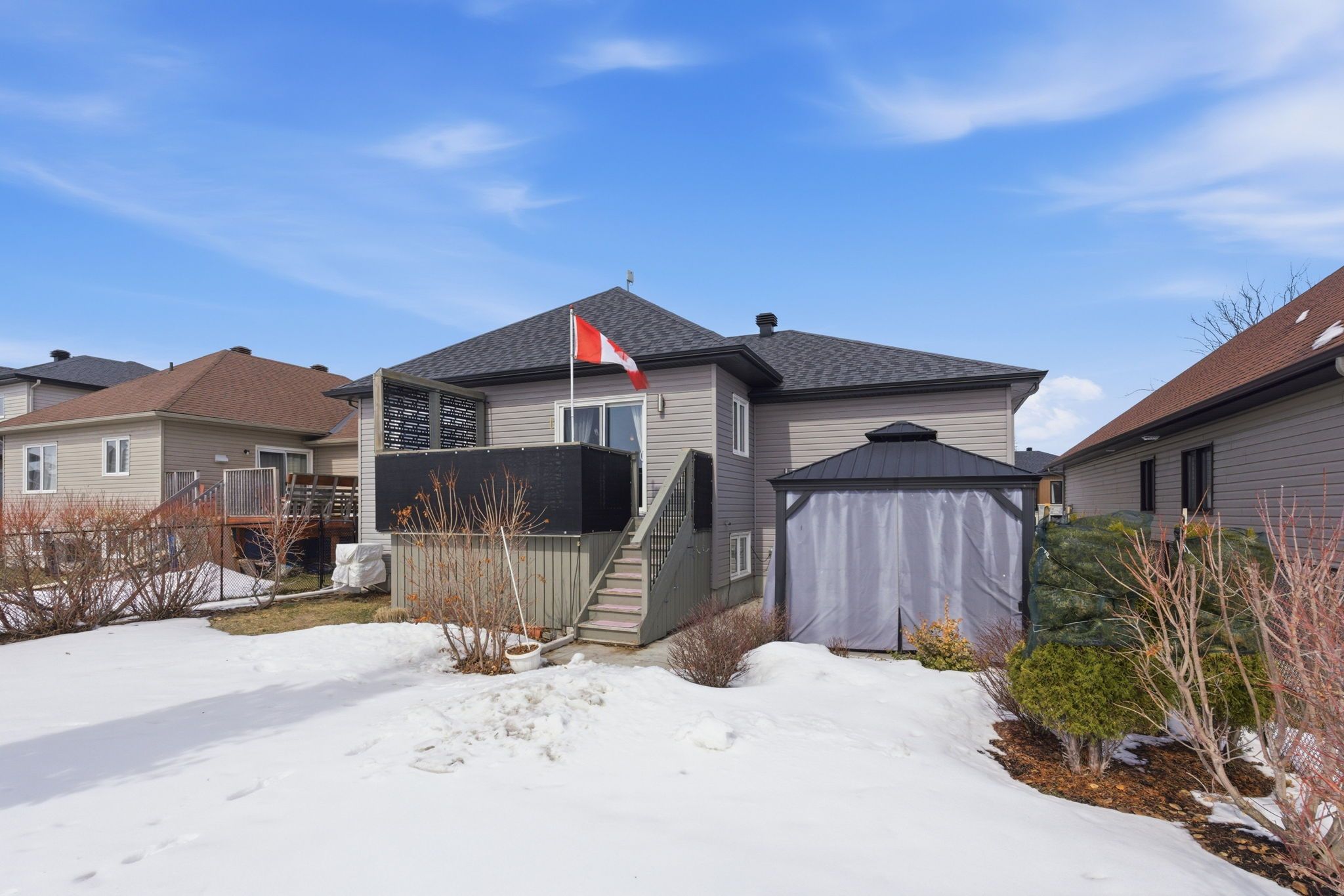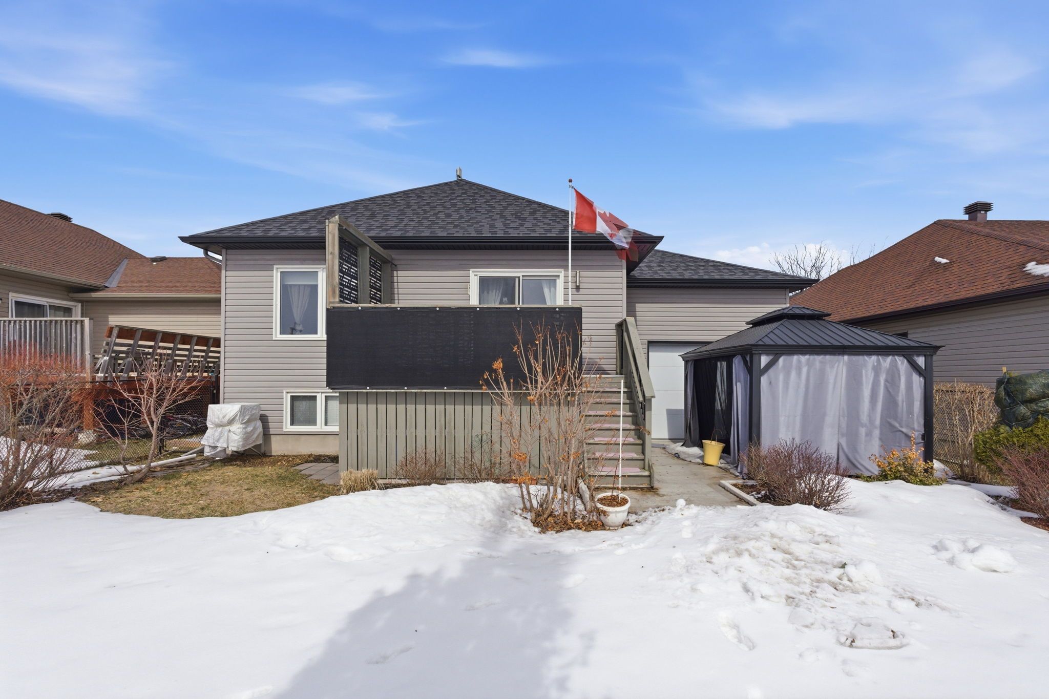 Step inside your dream bungalow! Sunlight spills into every corner of this 4-bedroom, 2-bath home, creating a bright and airy space you'll love to come home to. The open-concept living and dining area is perfect for cozy mornings with coffee - or lively evenings with friends and family. The kitchen? It's awesome. With generous storage and a huge prep counter, it's ready for everything from weekday breakfasts to weekend dinner parties. Slide open the patio doors to your private deck and soak in the views of green space and recreation areas-your little slice of outdoor bliss. The yard is fully enclosed and features a charming gazebo and meticulously maintained gardens, front and back. Whether you're hosting, relaxing, or just enjoying a sunny afternoon, it's your peaceful retreat. Wake up to sunshine in every bedroom-yes, even the lower-level bedrooms-thanks to the home's bright, sun-filled design. The fully finished lower level with soaring 9' ceilings, offers a cozy family room and an additional full bathroom. You'll also find two more bedrooms with durable lifeproof sterling oak 22 mil flooring, one room which is beautifully accessed through elegant french doors. The basement provides abundant storage space throughout. And let's talk garage: this heated space is built for real life. Two standard garage doors, two side access doors, and a floor drain that makes it easy to keep your cars looking sharp all year long. Sunshine, space, style, and comfort - welcome home!