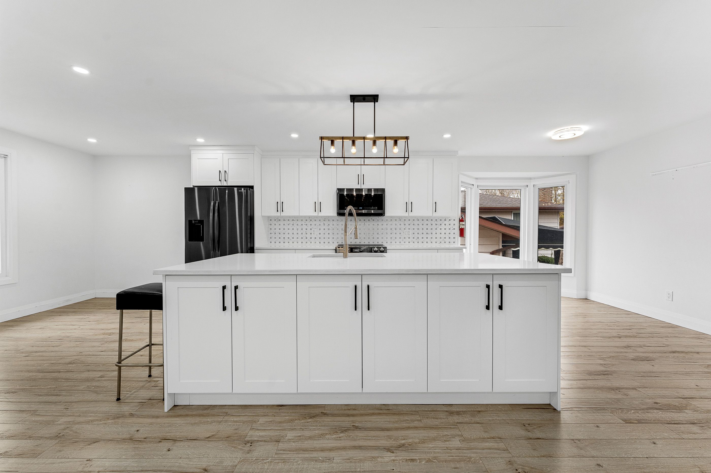 • Bright main floor with a large kitchen featuring stylish quartz countertops and ample cabinets.