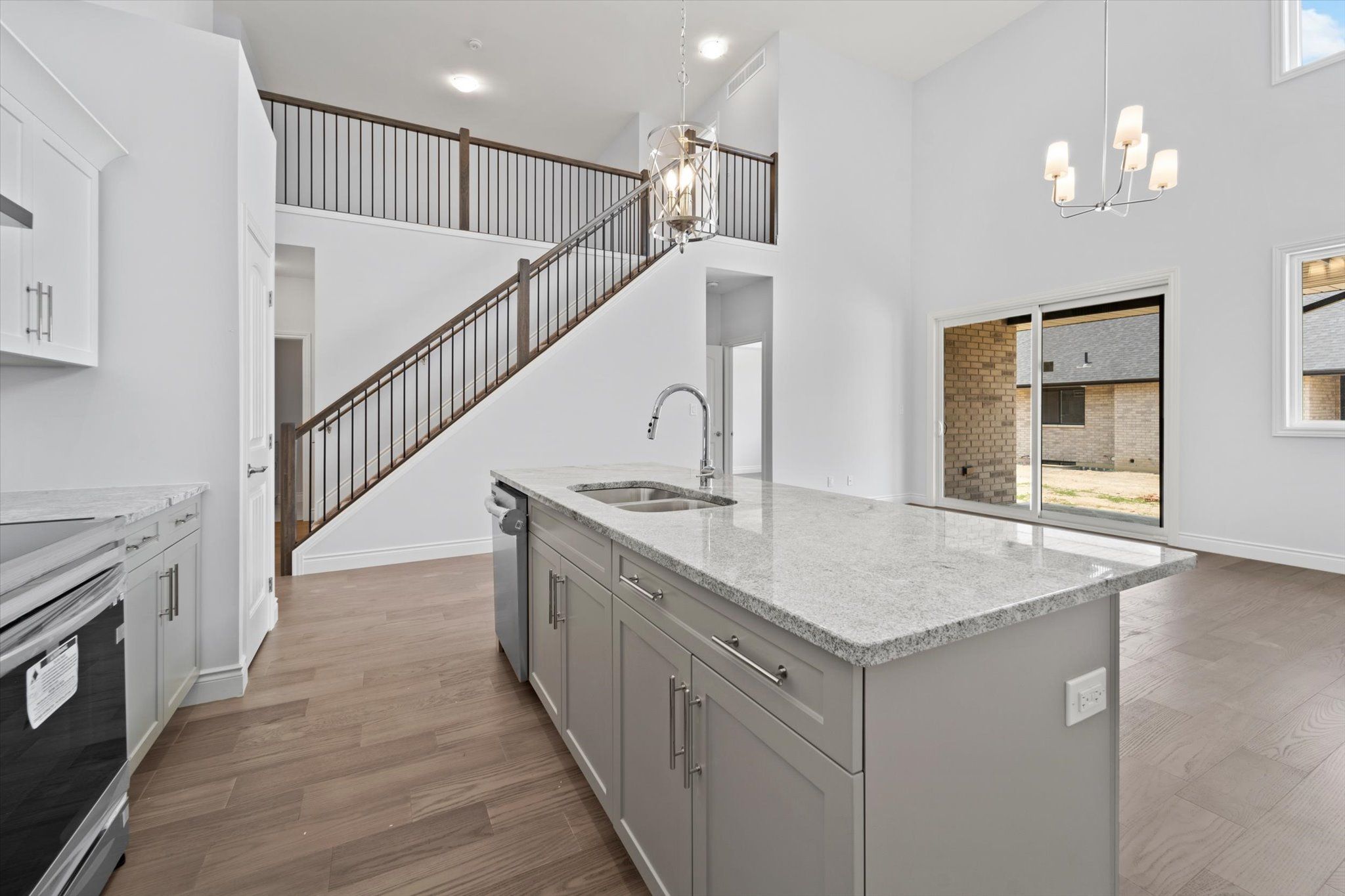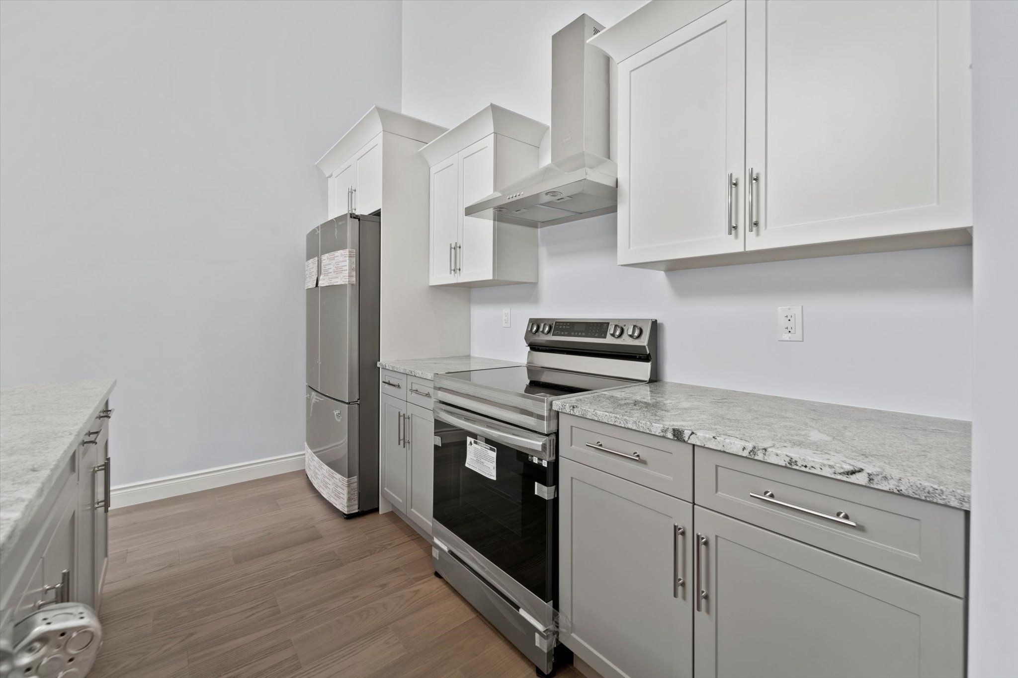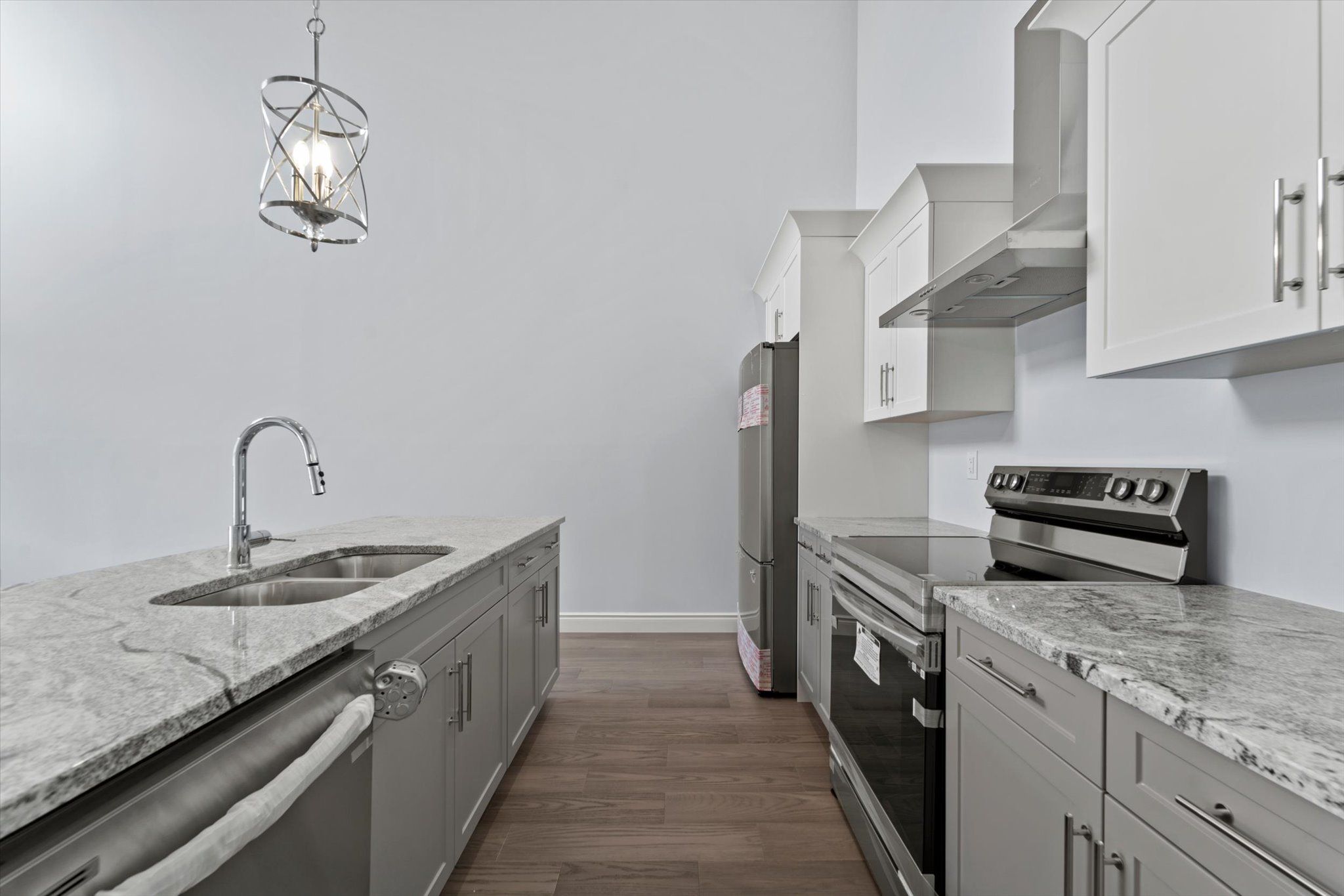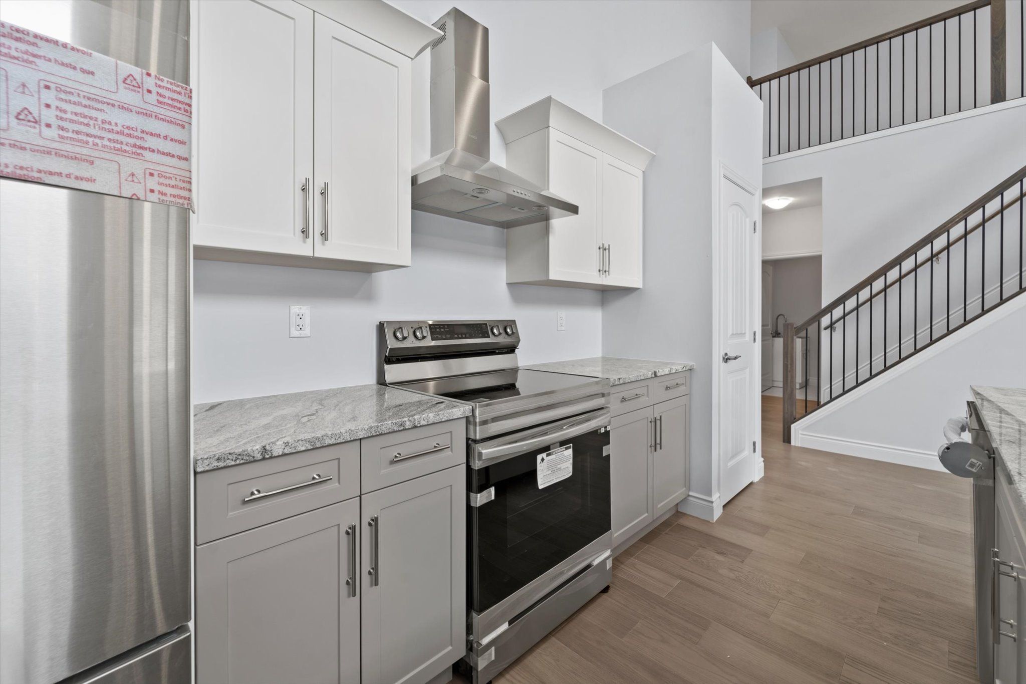 • Chef's kitchen equipped with stainless steel appliances and quartz countertops.