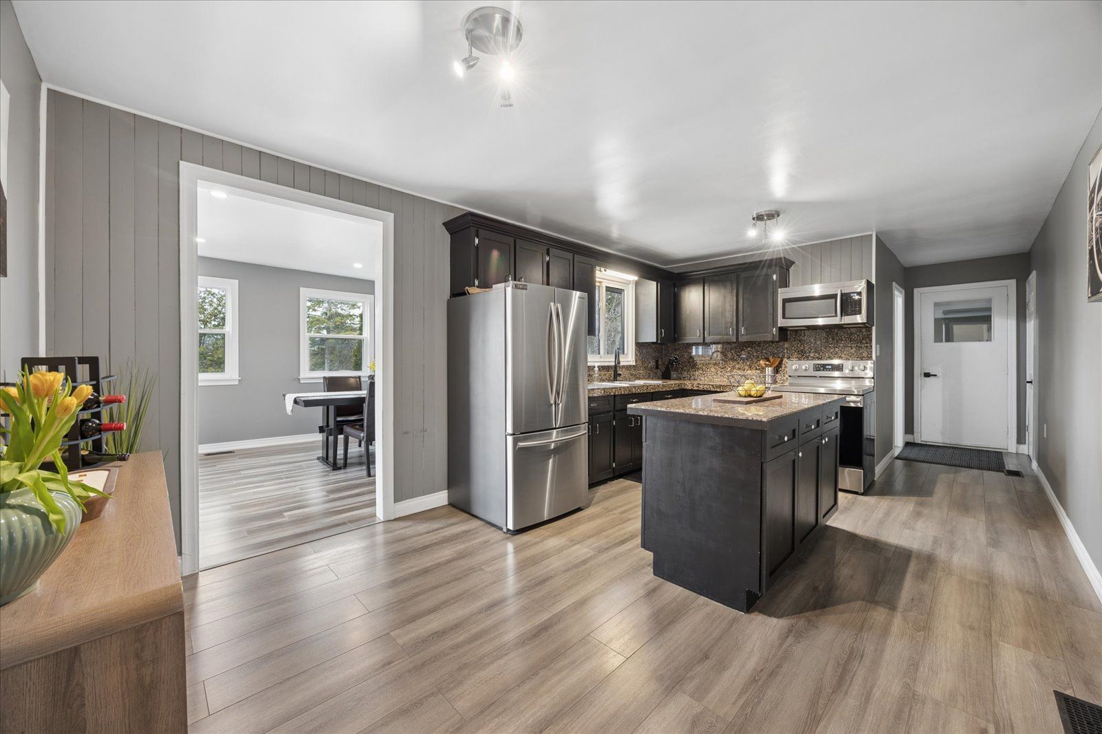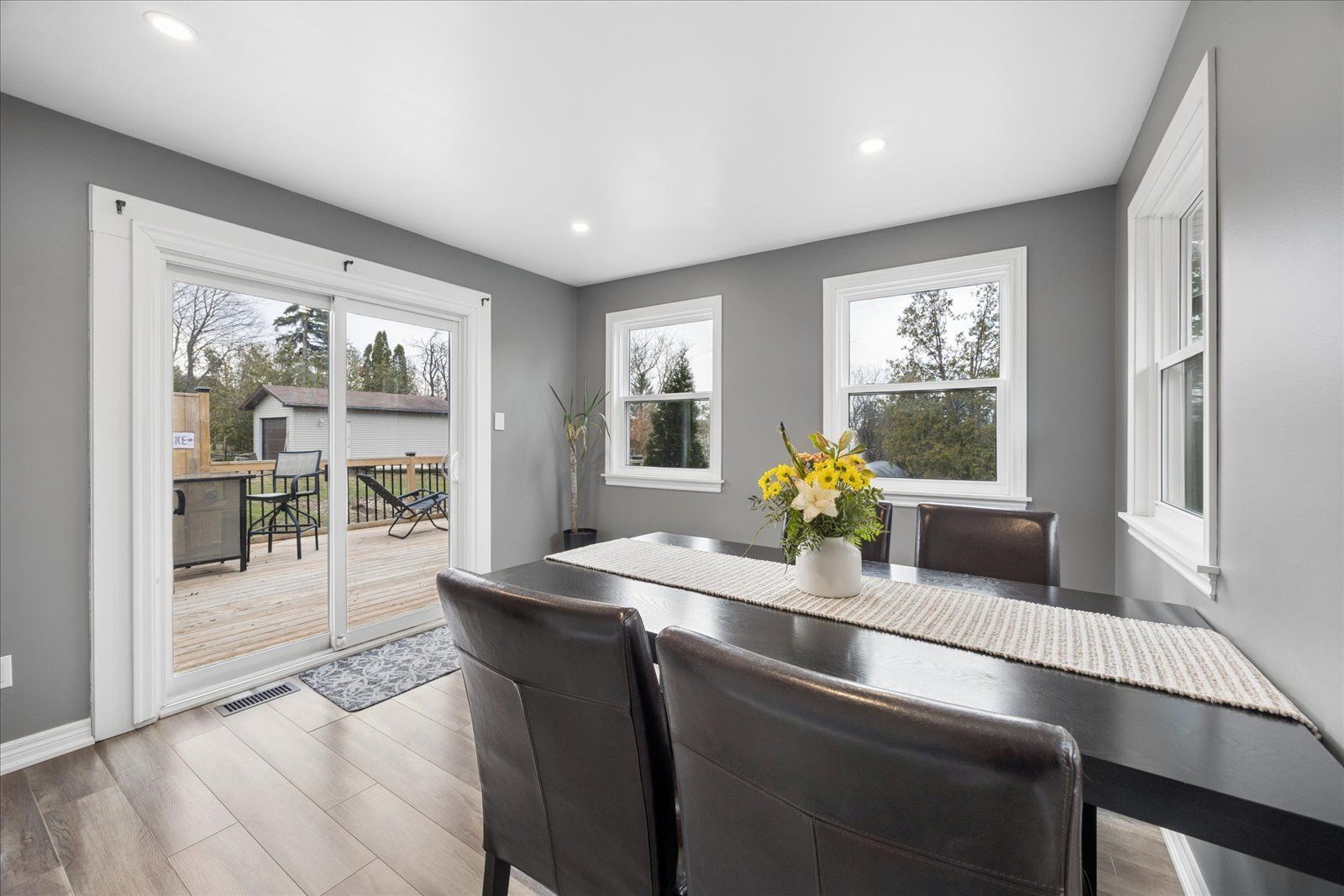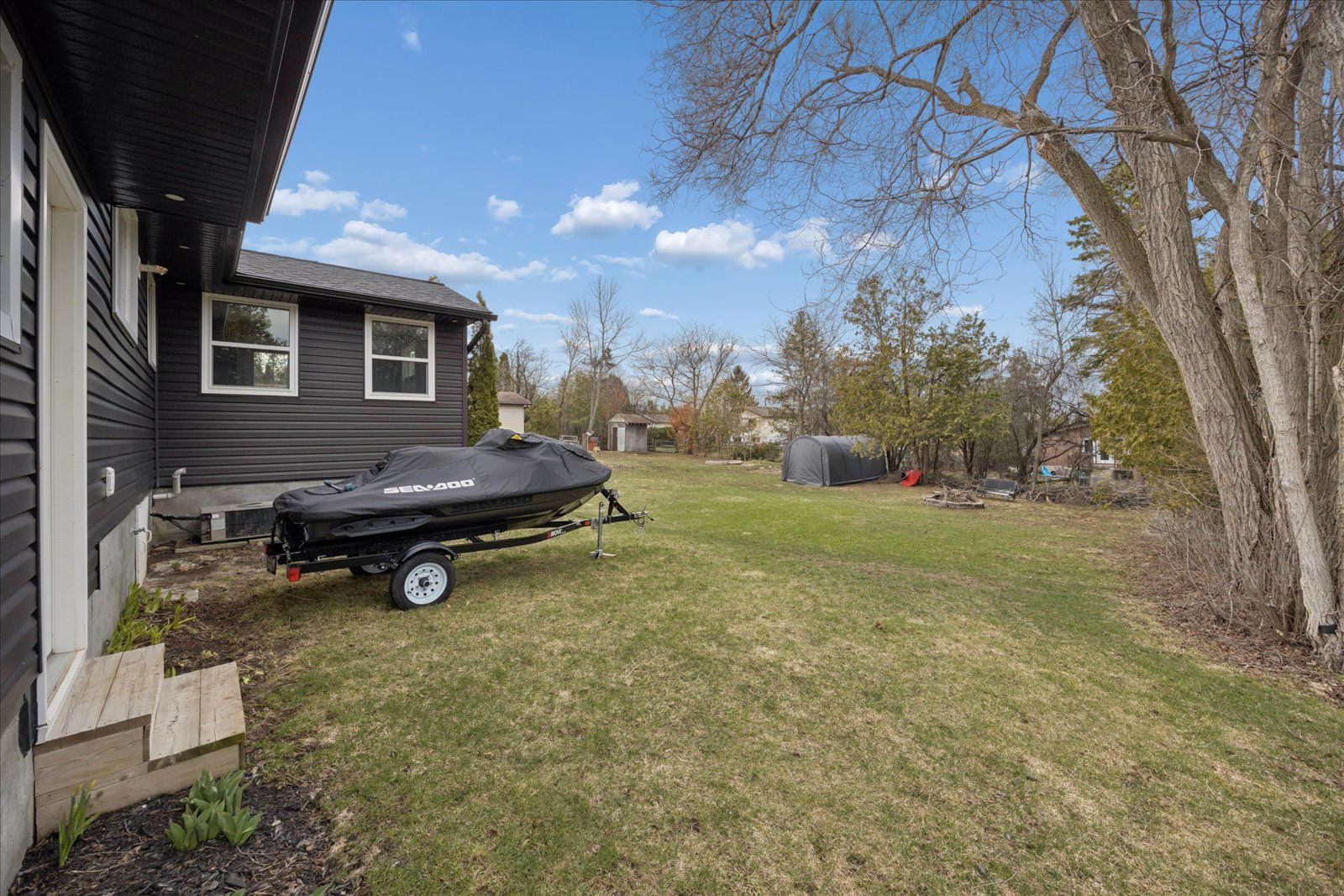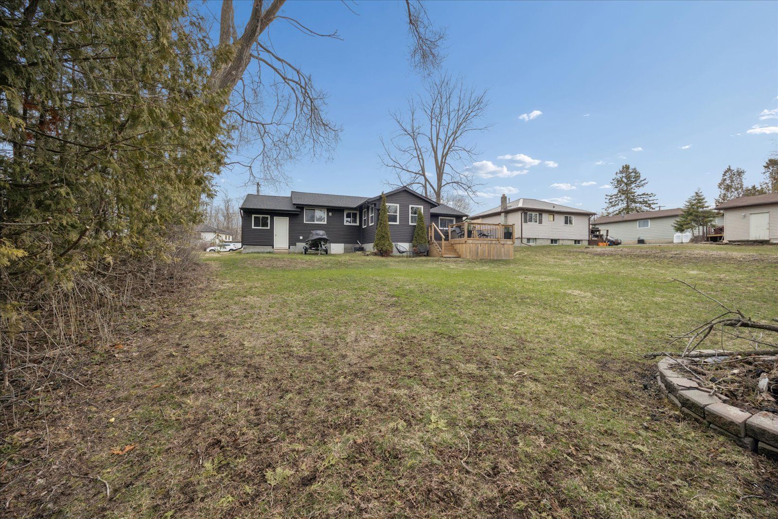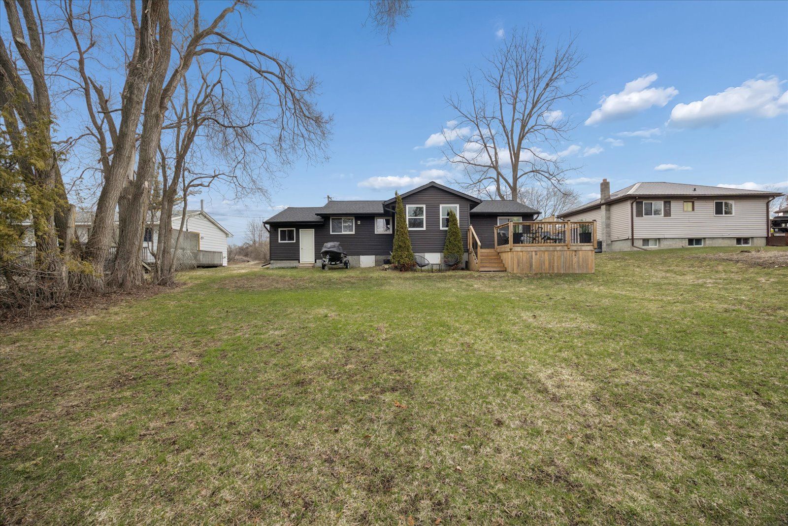 Welcome to this beautifully updated, move-in ready bungalow set on a generous 66 x 160 ft lot, offering the perfect blend of comfort, style, and outdoor living. From the moment you arrive, the home impresses with its modern curb appeal, featuring brand new vinyl siding, soffit, fascia, eavestroughs, exterior pot lights, and new shingles for added peace of mind. Inside, you'll find a bright and inviting layout with laminate flooring throughout and a spacious living room ideal for both relaxing and entertaining. The charming kitchen with island flows effortlessly into the dining area, where large windows fill the space with natural light and provide direct access to a beautiful new deck-perfect for summer barbeques and outdoor gatherings. The backyard is truly a standout, offering a sun-drenched setting with plenty of space for kids to play, entertain guests, or simply unwind. This well-appointed home features two bedrooms and one bathroom, along with an oversized single-car garage that offers convenient access into the home through the hallway and access the the laundry/storage area. The driveway accommodates up to four vehicles, and additional upgrades include a new furnace and new washer and dryer. With natural gas and full town services, this property delivers both comfort and convenience. Complete with modern exterior finishes, spacious principal rooms, and seamless indoor-outdoor living, this turnkey home is an incredible opportunity for first-time buyers, downsizers, or anyone looking for a move-in ready property with room to grow.