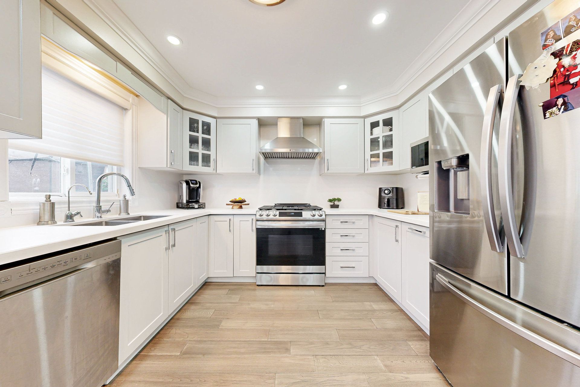 • Modern gourmet kitchen with quartz countertops and stainless-steel appliances.