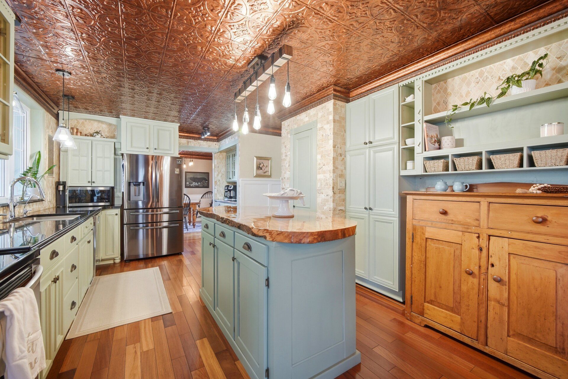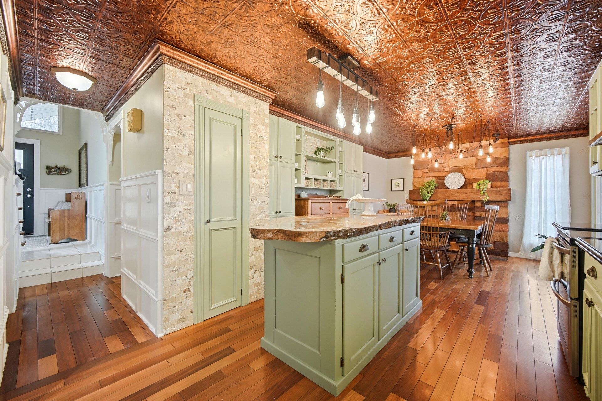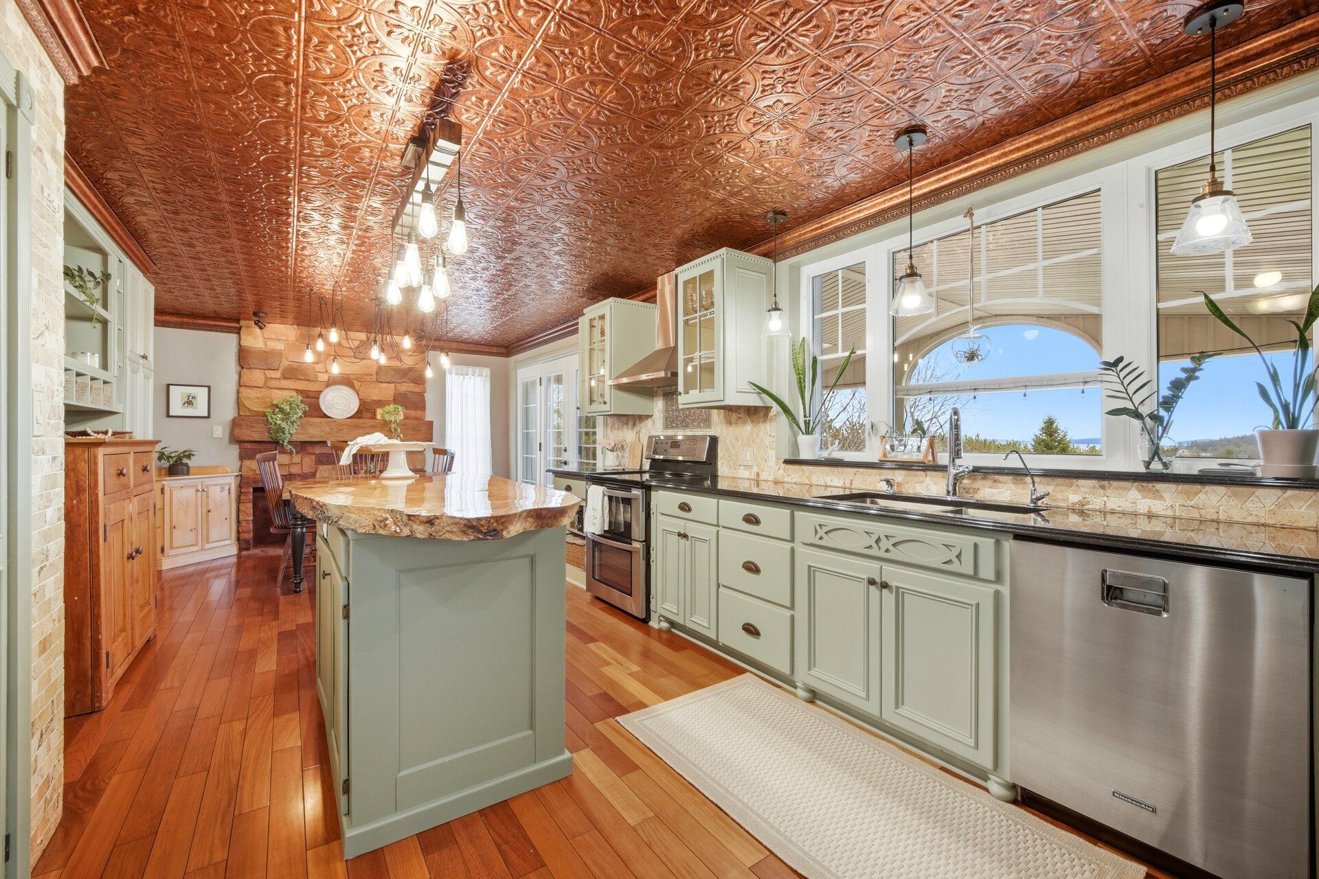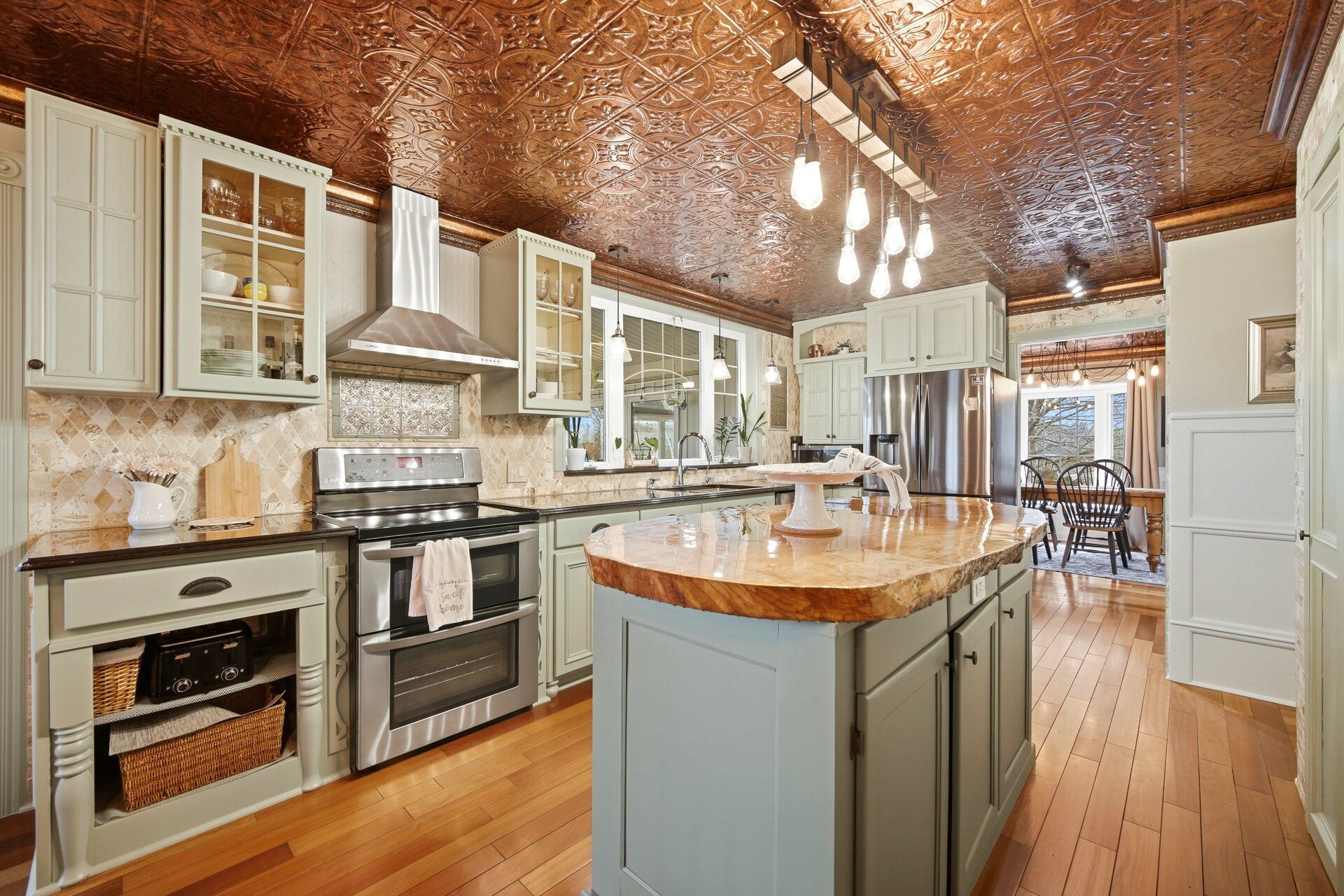 • Large eat-in kitchen features custom live edge island and stainless steel appliances.