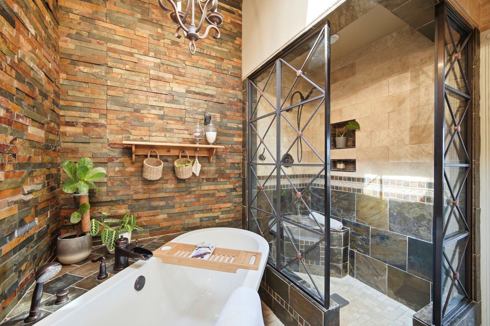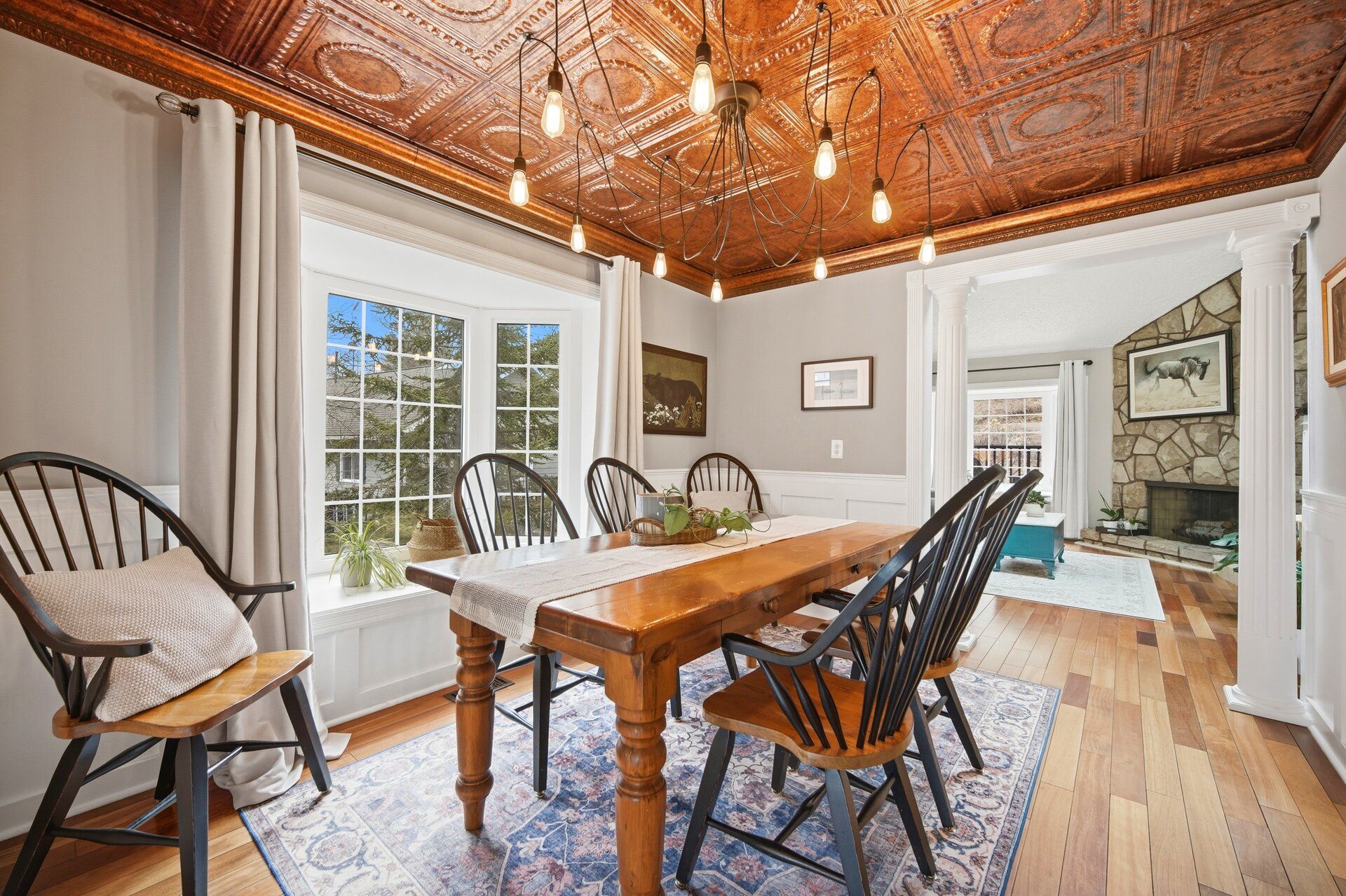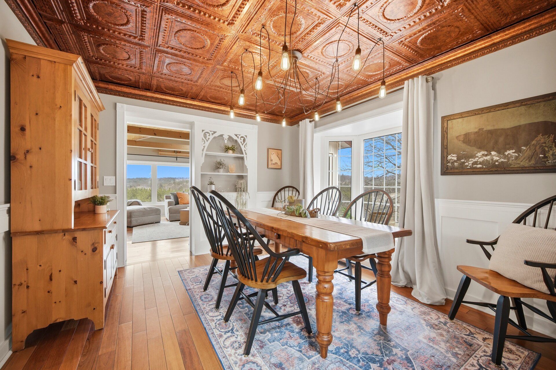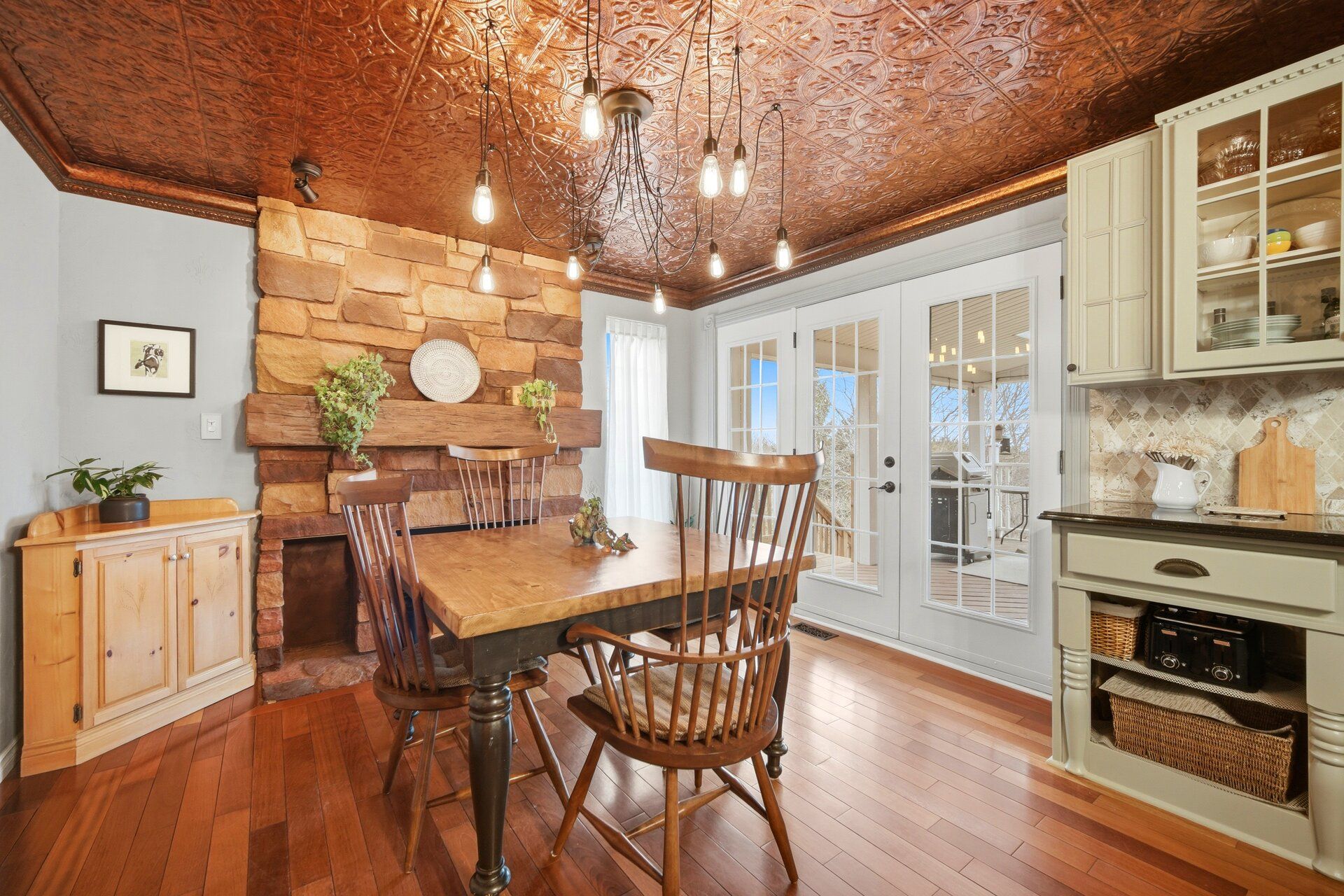 • Large eat-in kitchen features custom live edge island and stainless steel appliances.