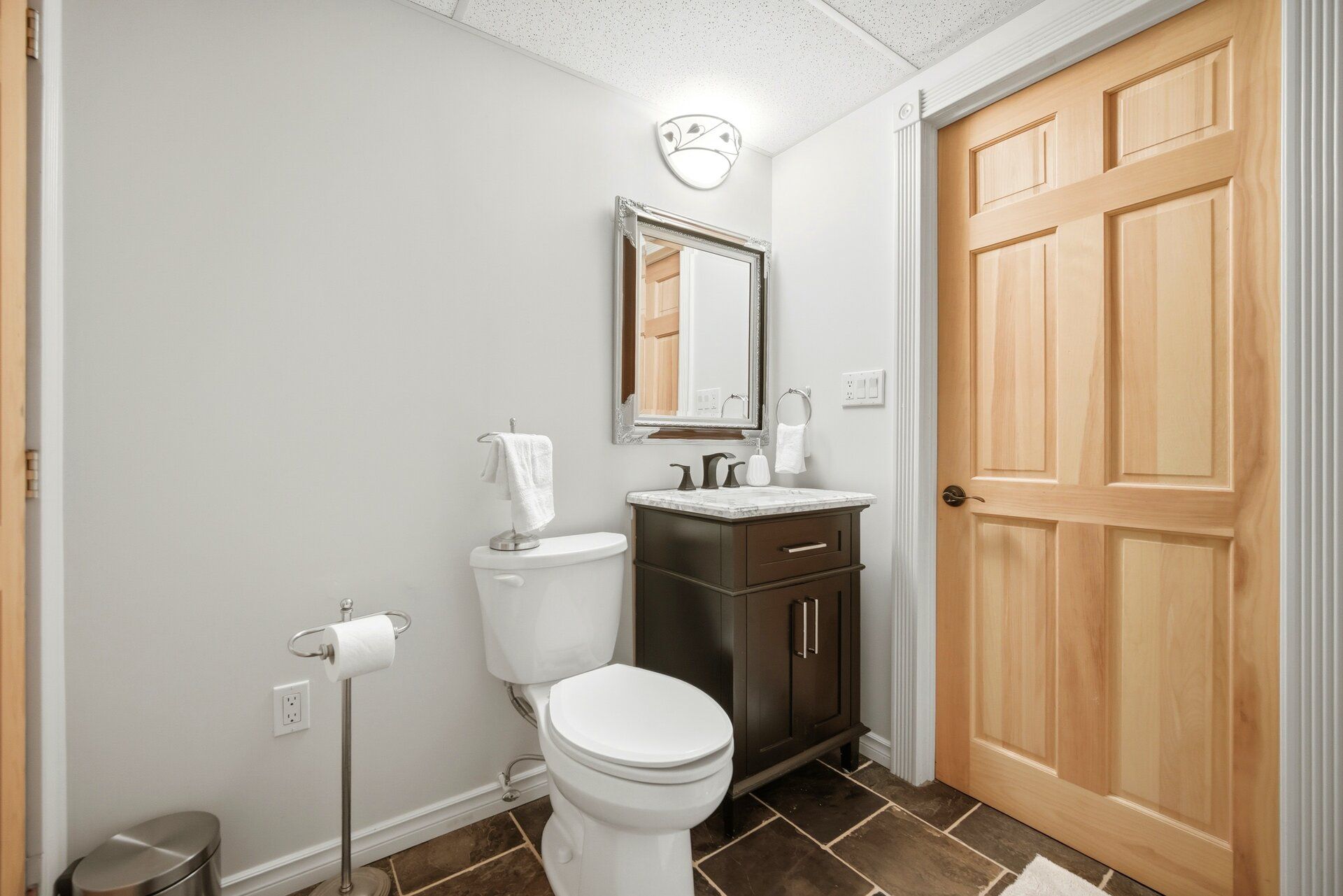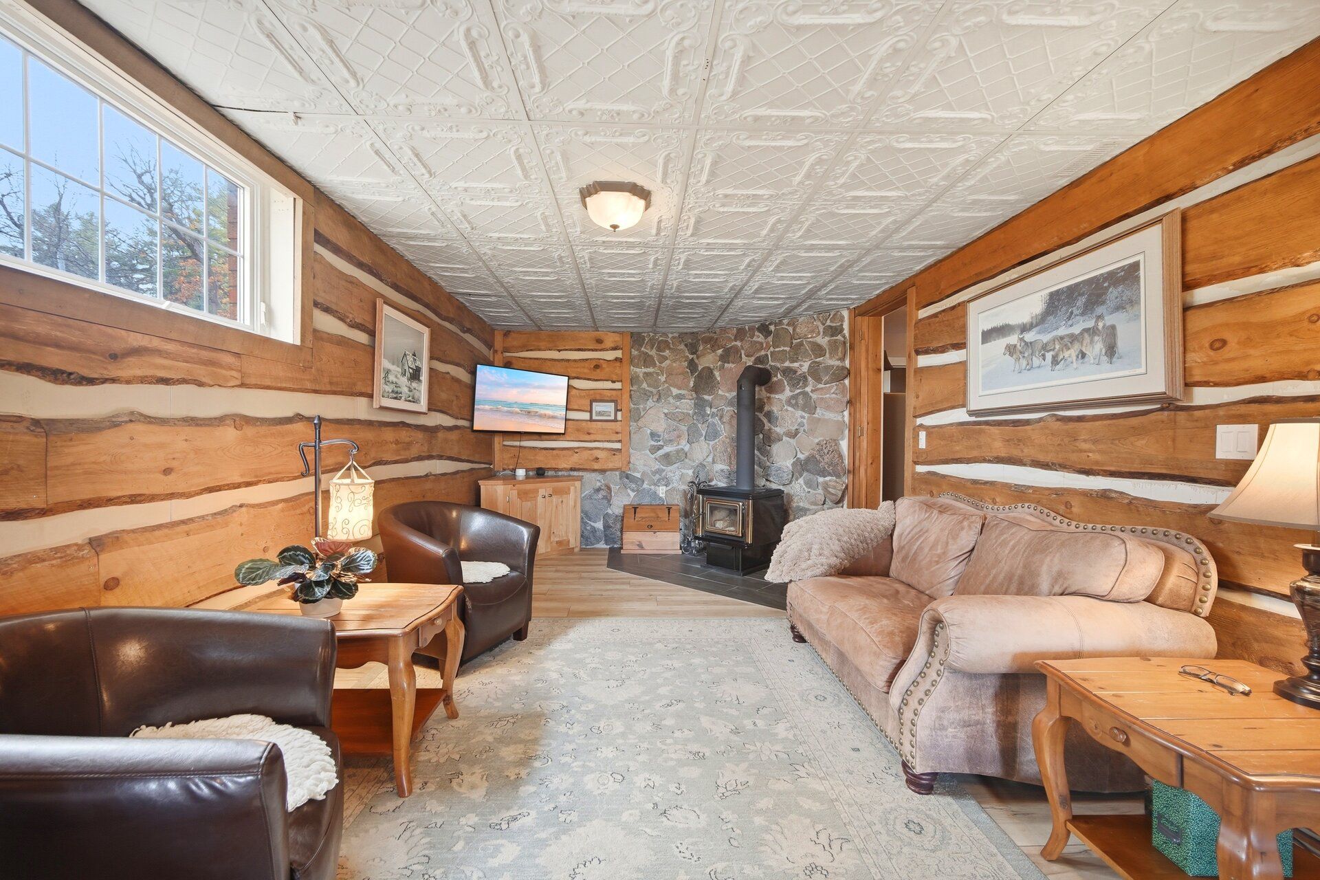 • Lower level recreation area has a cozy wood stove and cabin-like feel.