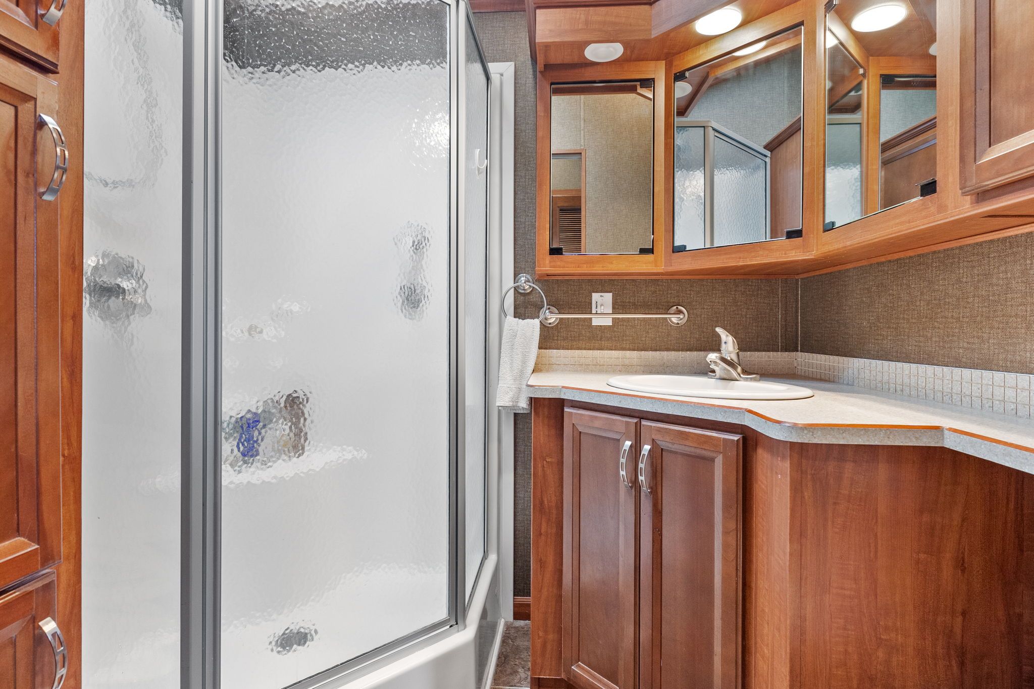 • Light-filled bathroom features skylight and convenient washer/dryer combo.