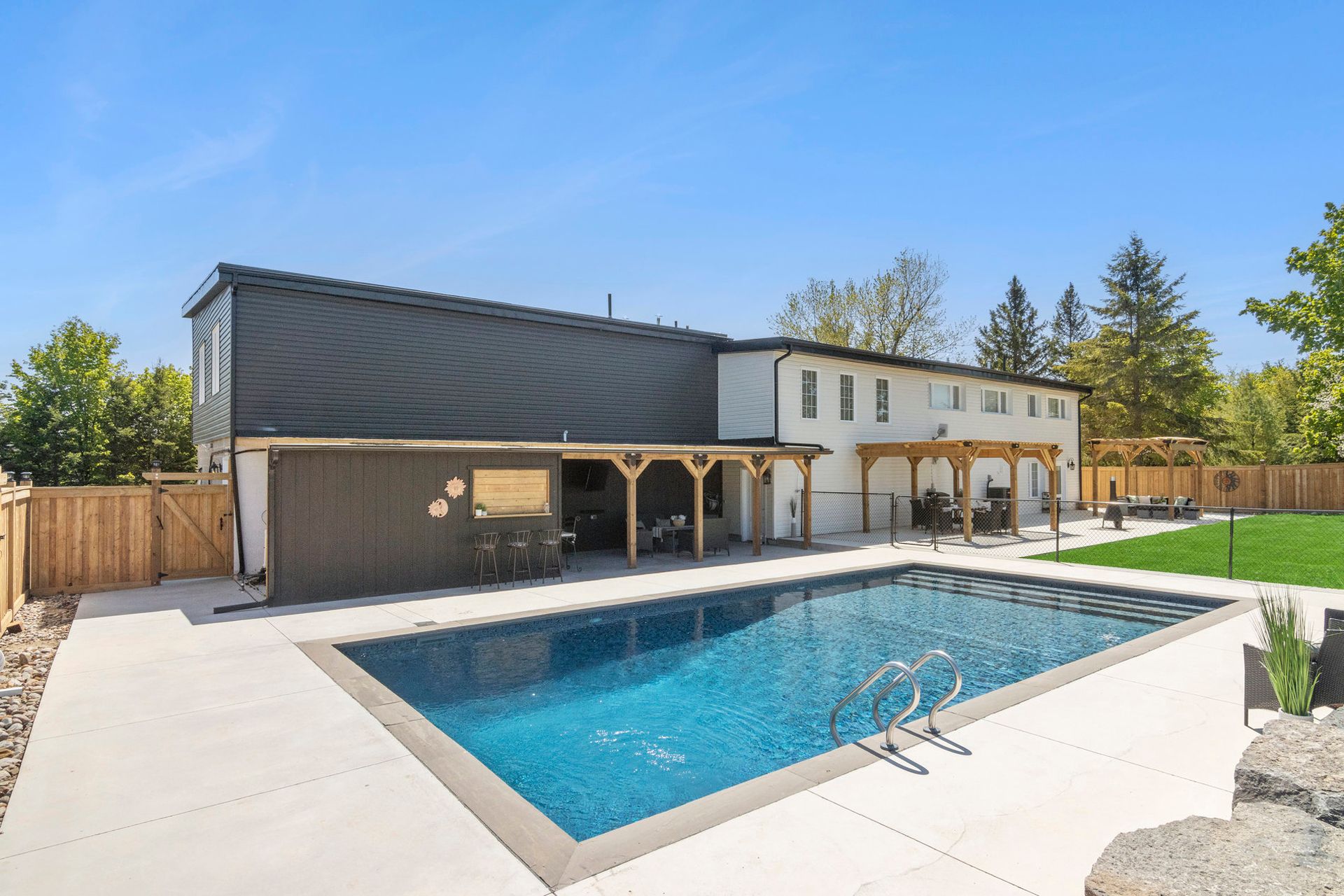 Welcome to this stunning newly re-constructed colonial style two storey home, where mixture of rustic and traditional style meets modern elegance. Intricate design throughout the entire house with many great features offers: 5255 sqft, 2 kitchens, 2 dinning rooms, 3 family rooms, 5 bedrooms (can be 6), private office, 6 bathrooms, mud room, gym, 3 fireplaces & very generous closet space. This house is ready for large family & even the in-laws! Covered double door entrance invites you to foyer with w/in closet, over to a large entertainers dream kitchen with oversized centre island, quartz countertops & walk in pantry. Open concept living/dining with stunning cast stone fireplace, wainscoting & pot/lights t/o. Large family room with walkout to pool. Massive primary suite with sitting area, large walk in closet & stunning bathroom. Second bedroom with private ensuite, double door closet & large window. 5 pc main bath and the other two bedrooms are all great in size with large closets & windows & plenty of sunlight. Separate very spacious second unit is ready for your extended family or guests, currently one bedroom but can be two & with it's own laundry. Stunning wood flooring t/o the entire house, pot lights t/o in & out, soundproof ceilings with extra heights on 2nd floor & plenty of closet space. 2. 5 acres of privacy w/mature trees, inground fenced in swimming pool, concrete walkways all around the house, new driveway & iron gate. Oversized heated 4 car garage, with epoxy floors, kitchenette, 2 pc bath, electric vehicle ready & lot's of storage space. Enjoy the beautiful new heated in-ground pool (22') with pool house, pergolas & lots of space to entertain on those hot summer days, and most of all - in absolute privacy! Most work was completed in late 2022'.