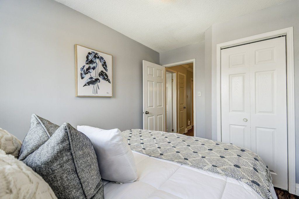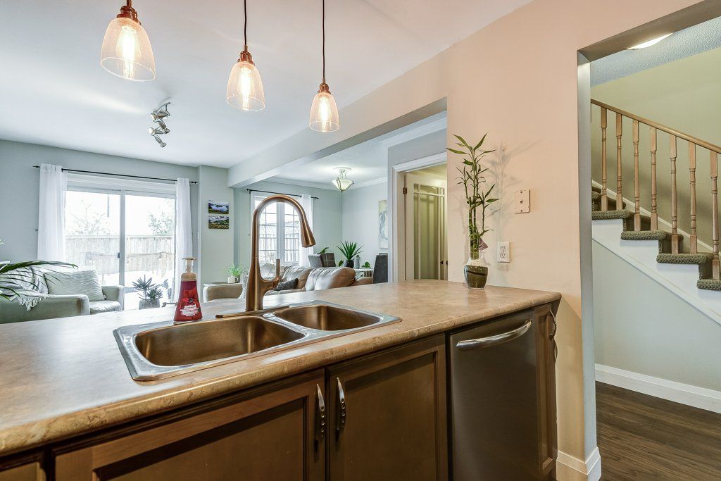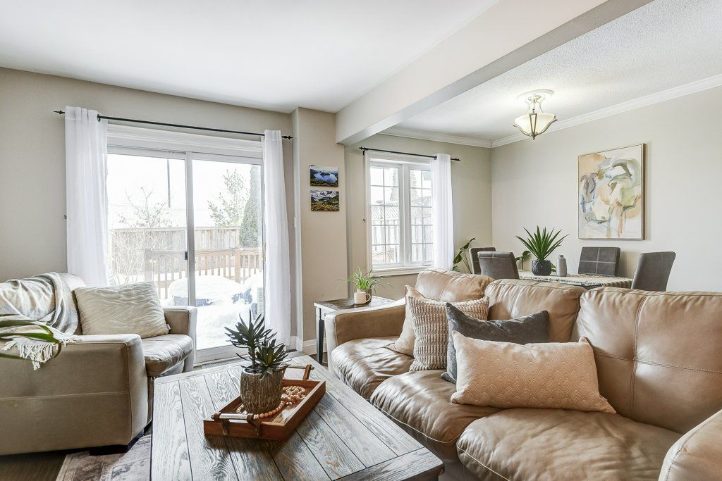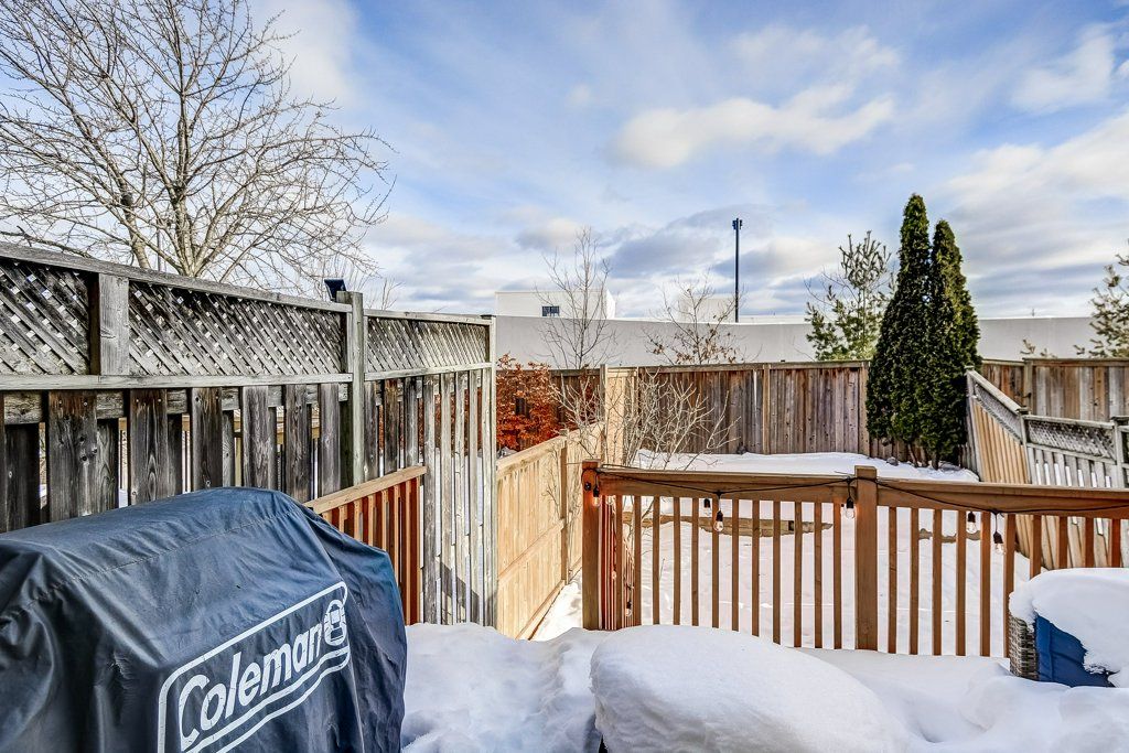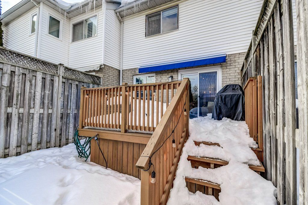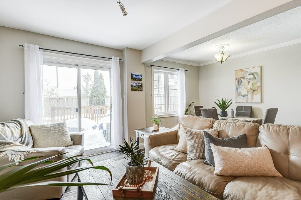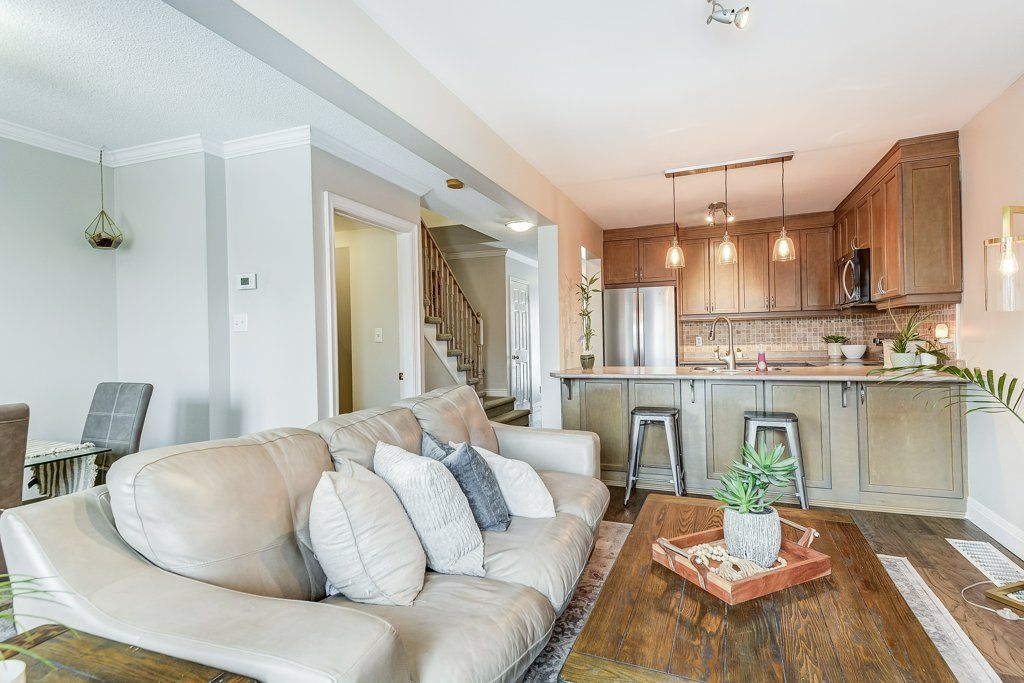 Gorgeous sun-filled townhome with no rear neighbours! Welcome to this beautifully updated, move-in-ready townhome offering bright open-concept living and exceptional functionality. The renovated kitchen features a breakfast bar overlooking the spacious living and dining areas - perfect for entertaining or everyday family life. Convenient direct garage entry adds everyday ease. Hardwood flooring runs throughout the kitchen, living room, dining room, and all bedrooms, creating a warm, cohesive feel throughout the main and upper levels. Upstairs, the spacious primary bedroom features his & hers closets. One secondary bedroom includes a built-in closet organizer, while the third bedroom offers generous space ready for your personal touch - ideal for families, guests, or a dedicated home office. The professionally finished basement expands your living space with a stylish rec room featuring tile and laminate flooring, a modern 3-piece bath, and ample storage. Step outside to your private, south-facing backyard oasis complete with a fabulous deck, retractable awning, brand new turf, and fresh wooden flower beds - creating a low-maintenance, beautifully landscaped retreat. With no rear neighbours, you'll enjoy added privacy year-round. Major updates include: new flooring (2022), new fridge, stove & microwave (2026), dishwasher (2024), furnace (2025), roof (2012), and deck (2013). Two-car driveway parking. Located close to highways, schools, parks, and shopping, this home checks all the boxes for comfort, convenience, and value.