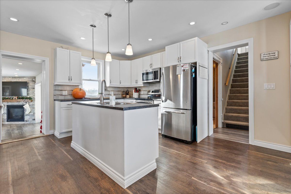 If you've been dreaming of country living, this is your opportunity! Set on 2. 5 acres with mature trees and beautiful landscaping, this property offers multiple outbuildings and garages in addition to the attached garage on the renovated 3-bedroom home. Inside, you'll find a spacious mudroom with in-floor heat and plenty of storage and the bright living room features stunning views of the property along with a cozy propane fireplace. The large, country-style eat-in kitchen provides exceptional cabinet space. A main-floor bedrrom/office with built-ins offers the ideal workspace or doubles as a great bedroom. The main level is complete with convenient laundry and a 4-piece bath. Upstairs are two bedrooms plus an oversized primary bedroom with its own private staircase from the kitchen. If its extra space you're looking for, you're in luck-this property includes two shops. A 24' x 30' shop plus an l-shaped 39' x 27' shop with a 24' x 17' addition equipped with water. Call today properties like this do not come along often!