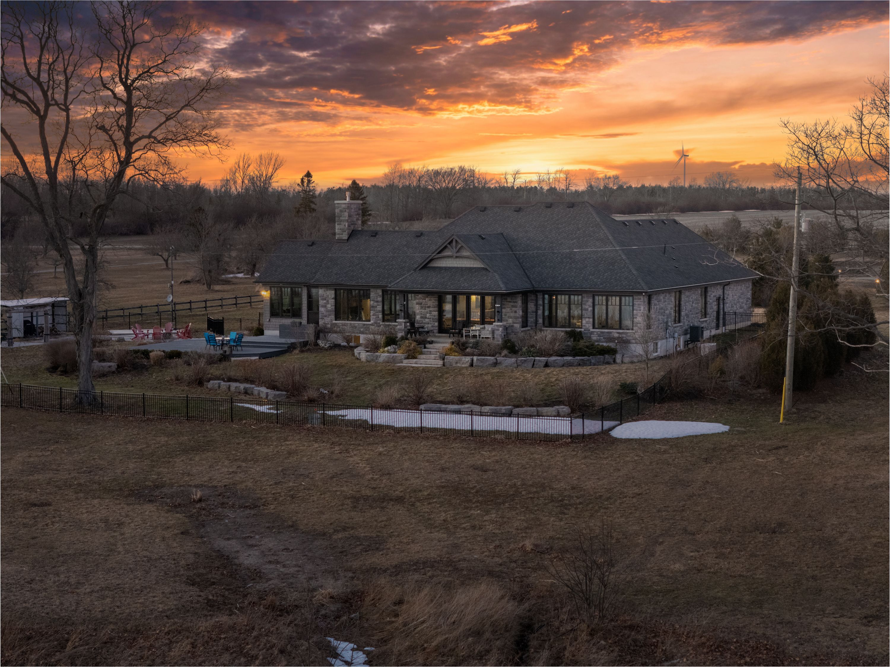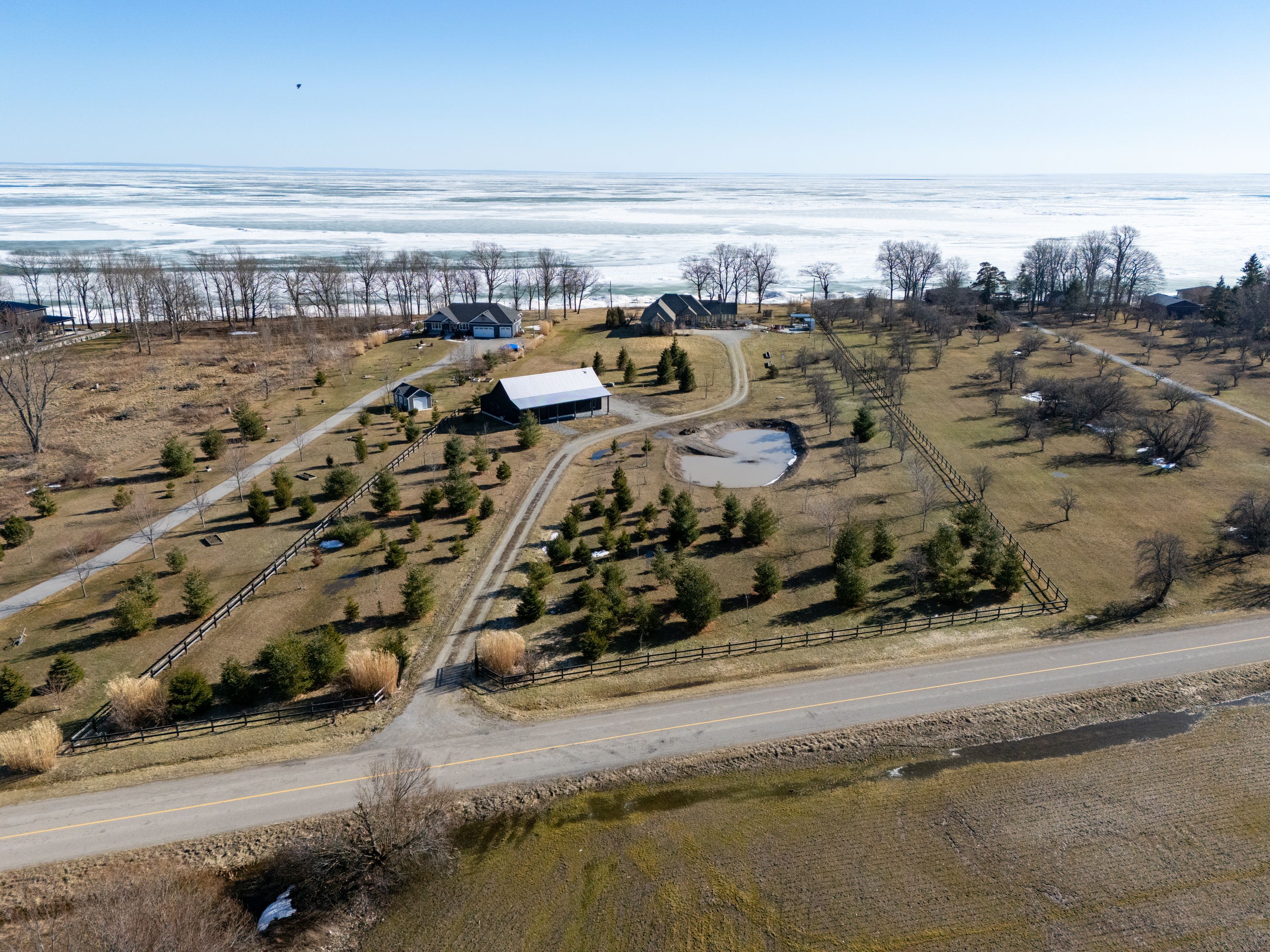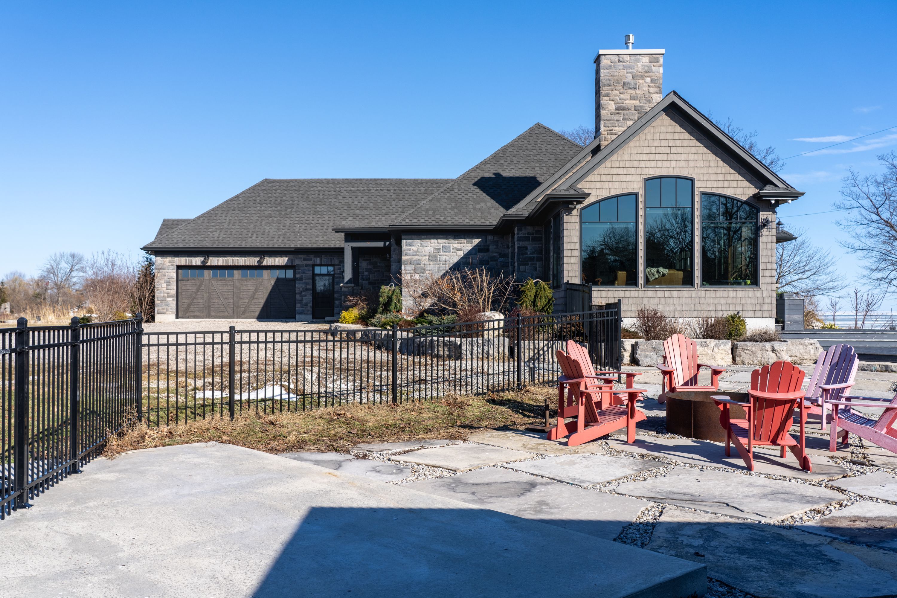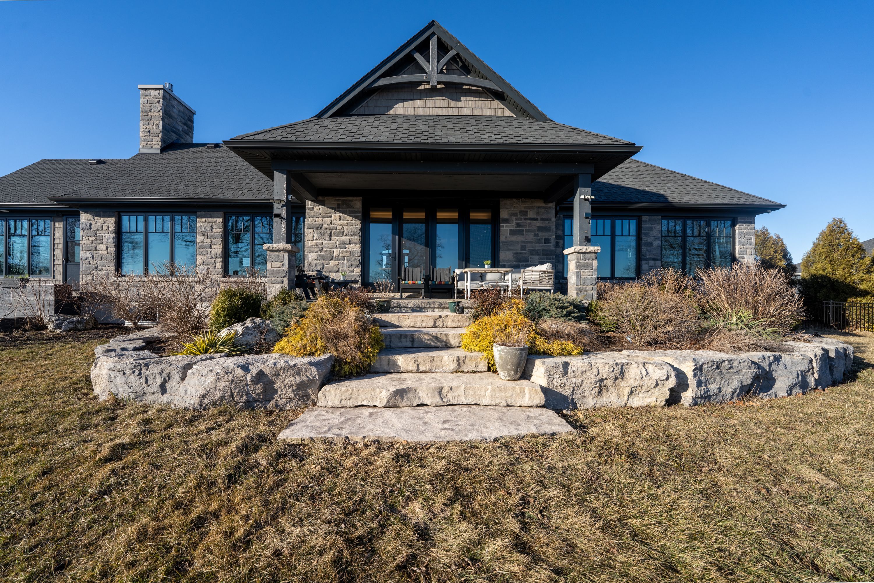 Behind a gated entrance and down a winding tree-lined driveway sits a lakefront estate along the shores of lake erie in the community of dunnville. Welcome to 515 sandy bay. Set on over 5. 5 acres with more than 270 feet of shoreline, this sprawling bungalow blends contemporary design with natural materials including stacked stone, wood accents, exposed beams and steel structural elements. The layout captures lake views from the main living areas. From the foyer, sightlines extend through the kitchen and dining area toward the water. The kitchen features black cabinetry, suede granite countertops, a large island with seating, pebble stone backsplash, wolf gas range, double built-in ovens, custom panel refrigerator and a walk-in pantry accessed through a repurposed horse stable door. The main level is divided into two wings. One side includes the bedrooms and bathrooms, while the other opens to the living room, glass sunroom & home office. Vaulted ceilings, exposed beams and stone fireplaces frame the lake views while large windows provide natural light. The primary suite features a walk-in closet and an ensuite with tin ceilings, floating wood vanity with chain detail, walk-in glass shower and black soaker tub positioned toward the lake. The fully finished lower level is accessed by a steel beam staircase with wood capping. Stone feature walls and an electric fireplace are featured throughout. Bedrooms include barn doors, wood and log feature walls, a custom lake mural and a converted wine cellar now used as a children's bedroom. Exterior features include a gated entrance, winding driveway with lighting, fruit trees, raised garden beds and a fenced yard. Massive stone walkways, a fire pit area and rock steps lead to the shoreline. A covered patio off the kitchen provides space for outdoor dining and entertaining. A detached shop offers space for storage, boats or hobbies and includes a finished one-bedroom apartment ideal for guests or extended family.