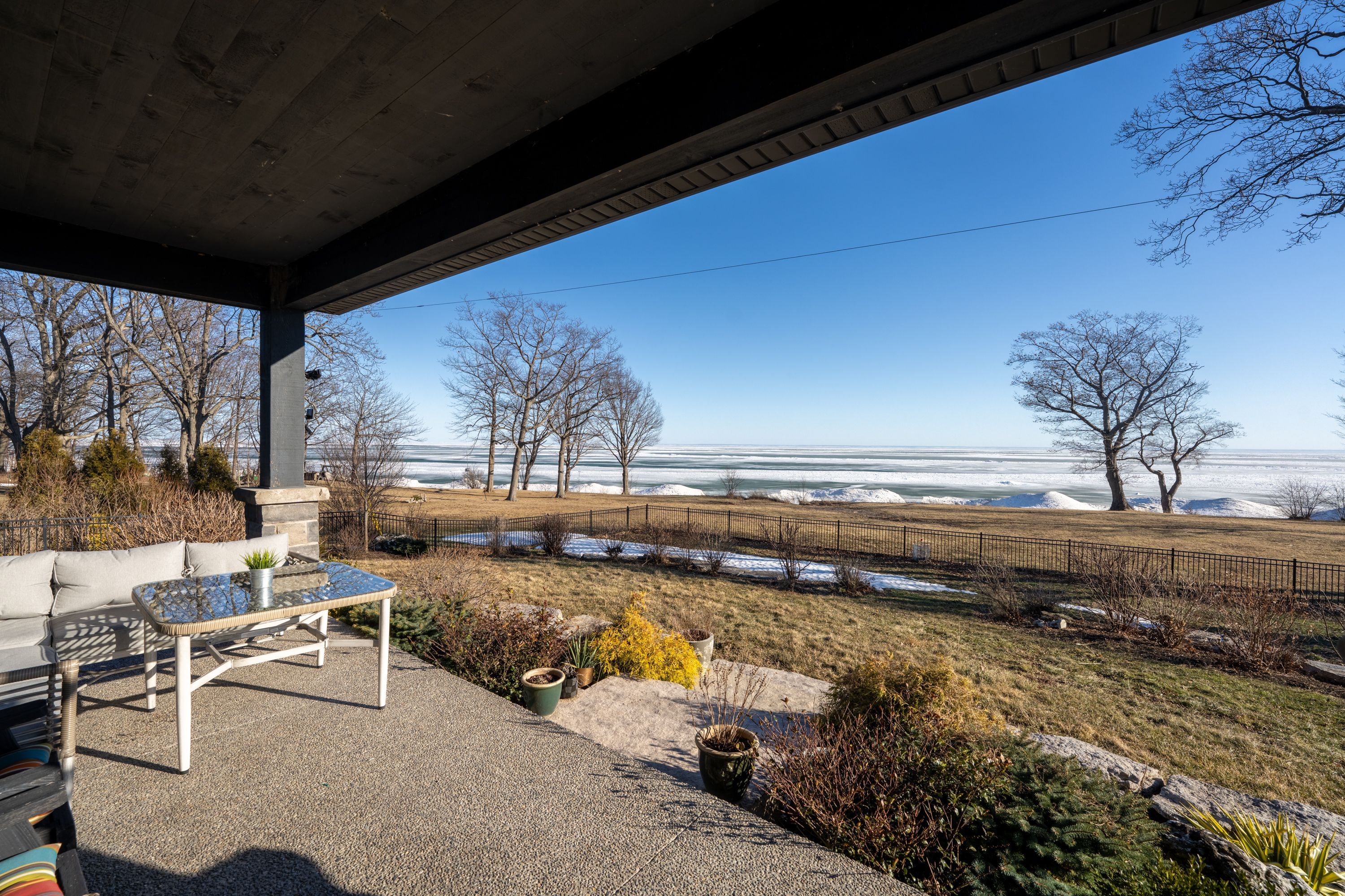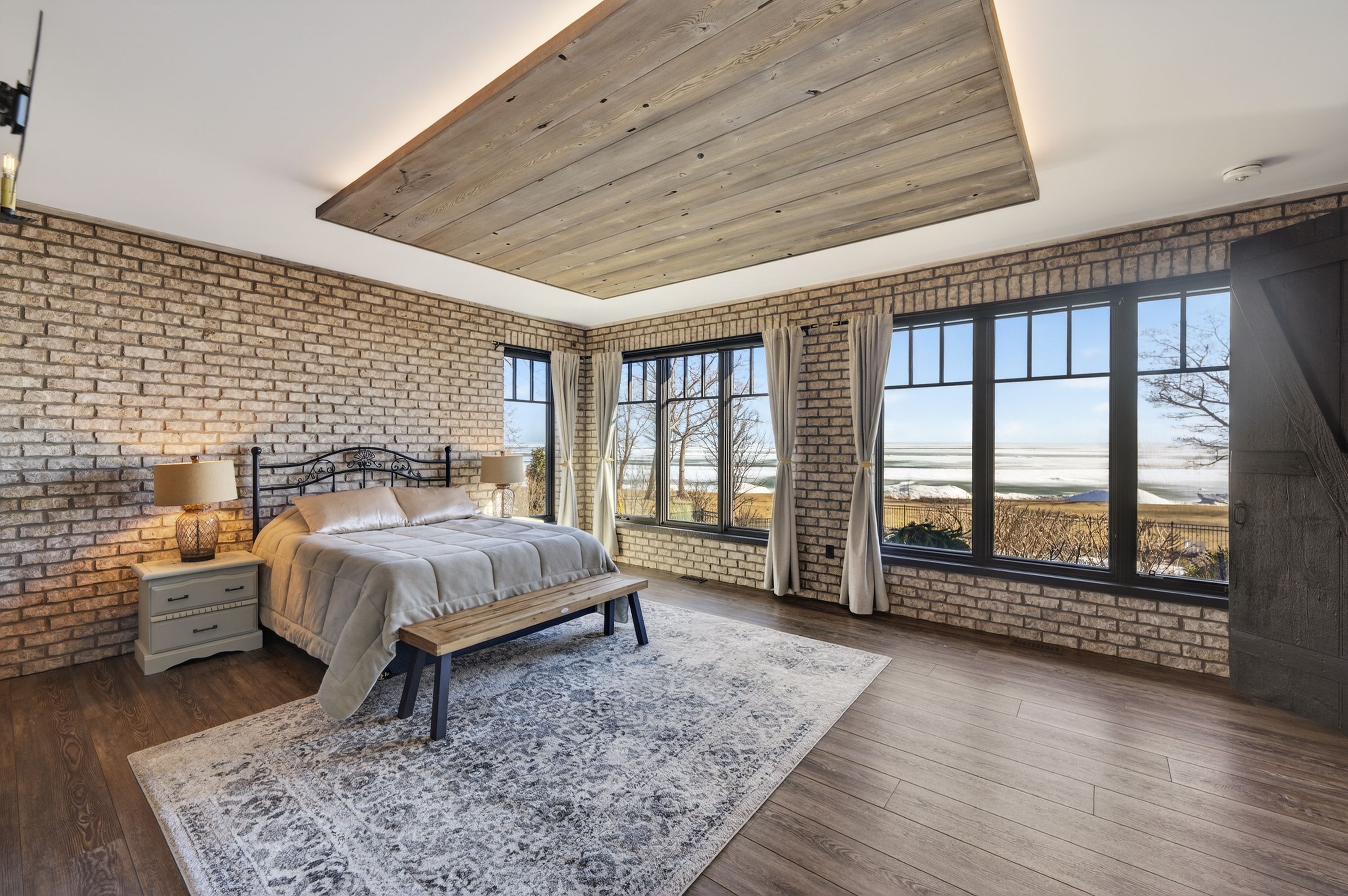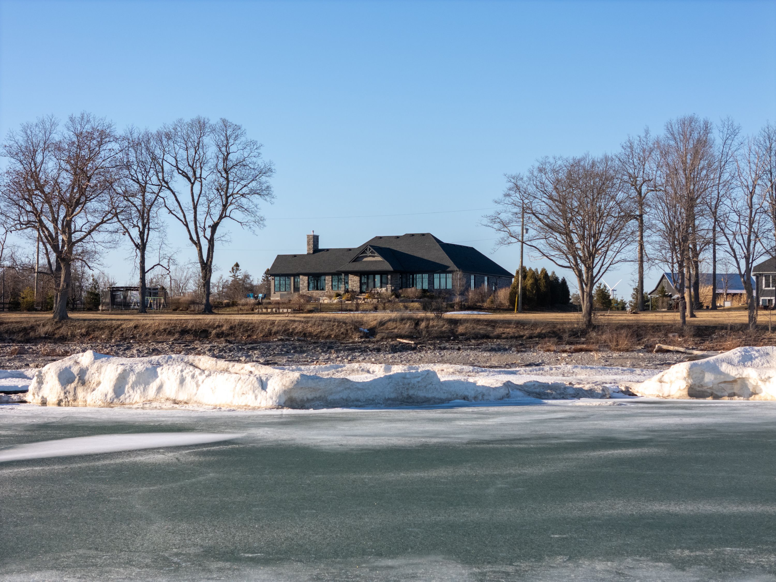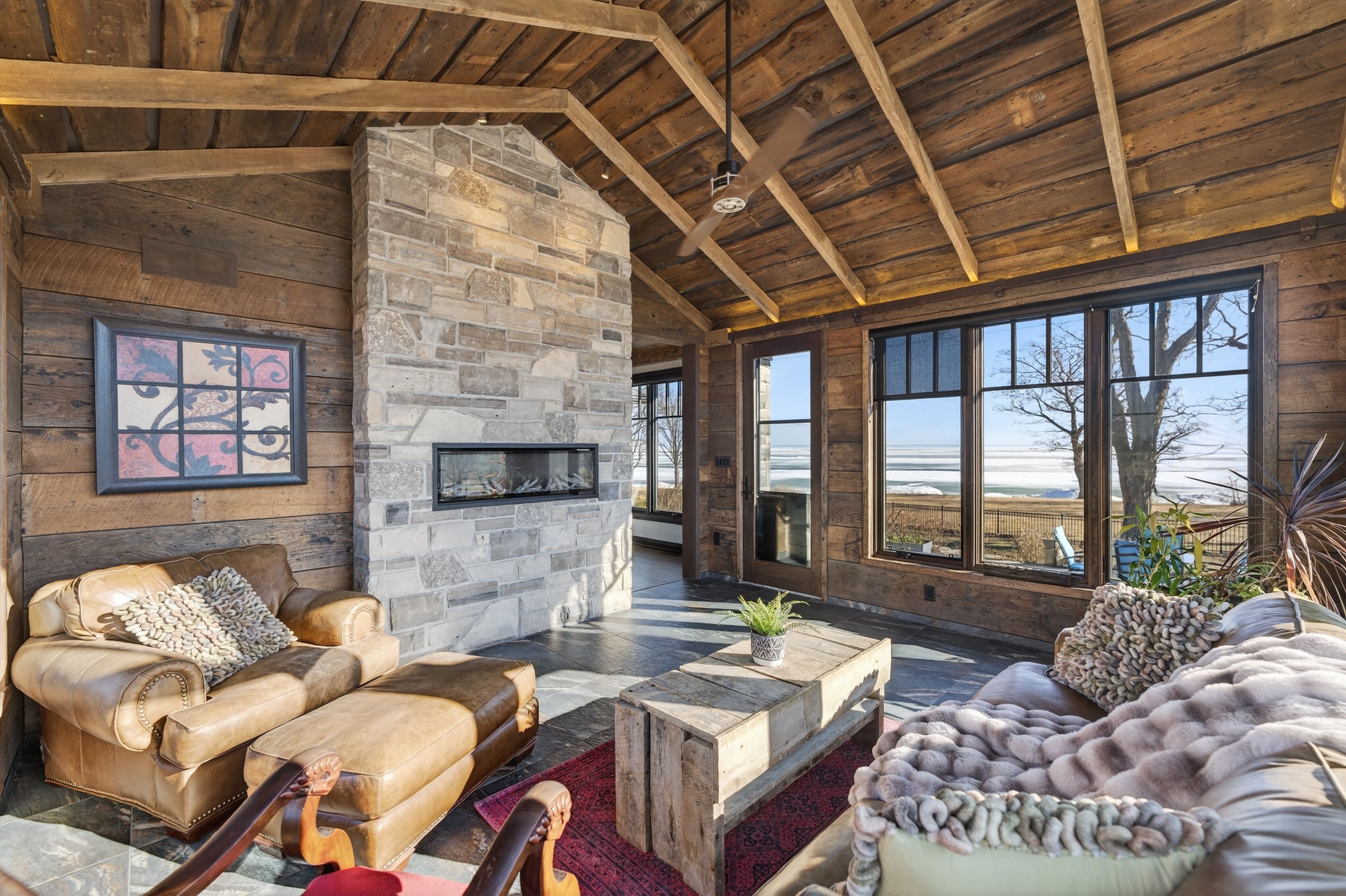 Behind a gated entrance and down a winding tree-lined driveway sits a lakefront estate along the shores of lake erie in the community of dunnville. Welcome to 515 sandy bay. Set on over 5. 5 acres with more than 270 feet of shoreline, this sprawling bungalow blends contemporary design with natural materials including stacked stone, wood accents, exposed beams and steel structural elements. The layout captures lake views from the main living areas. From the foyer, sightlines extend through the kitchen and dining area toward the water. The kitchen features black cabinetry, suede granite countertops, a large island with seating, pebble stone backsplash, wolf gas range, double built-in ovens, custom panel refrigerator and a walk-in pantry accessed through a repurposed horse stable door. The main level is divided into two wings. One side includes the bedrooms and bathrooms, while the other opens to the living room, glass sunroom & home office. Vaulted ceilings, exposed beams and stone fireplaces frame the lake views while large windows provide natural light. The primary suite features a walk-in closet and an ensuite with tin ceilings, floating wood vanity with chain detail, walk-in glass shower and black soaker tub positioned toward the lake. The fully finished lower level is accessed by a steel beam staircase with wood capping. Stone feature walls and an electric fireplace are featured throughout. Bedrooms include barn doors, wood and log feature walls, a custom lake mural and a converted wine cellar now used as a children's bedroom. Exterior features include a gated entrance, winding driveway with lighting, fruit trees, raised garden beds and a fenced yard. Massive stone walkways, a fire pit area and rock steps lead to the shoreline. A covered patio off the kitchen provides space for outdoor dining and entertaining. A detached shop offers space for storage, boats or hobbies and includes a finished one-bedroom apartment ideal for guests or extended family.