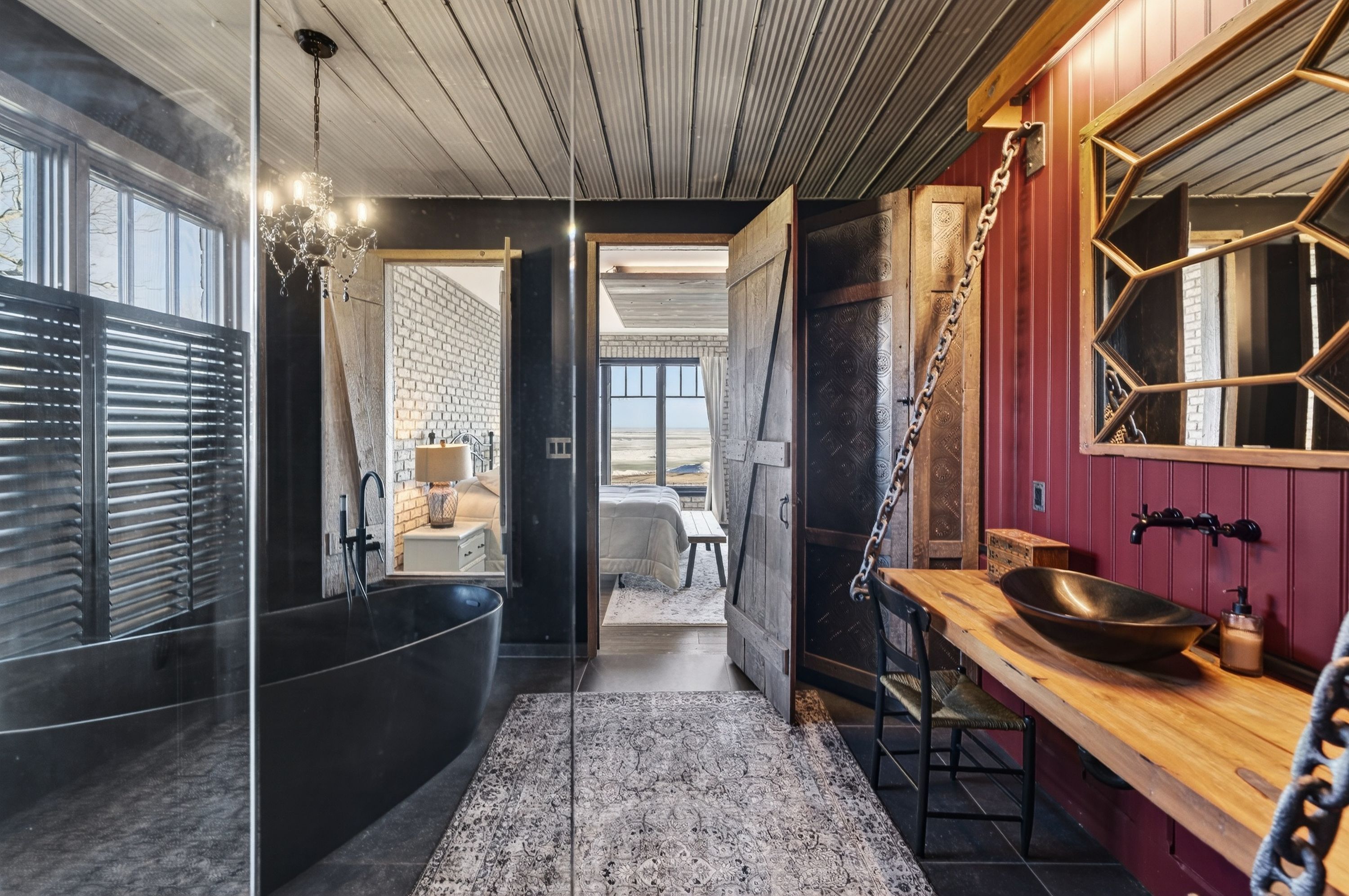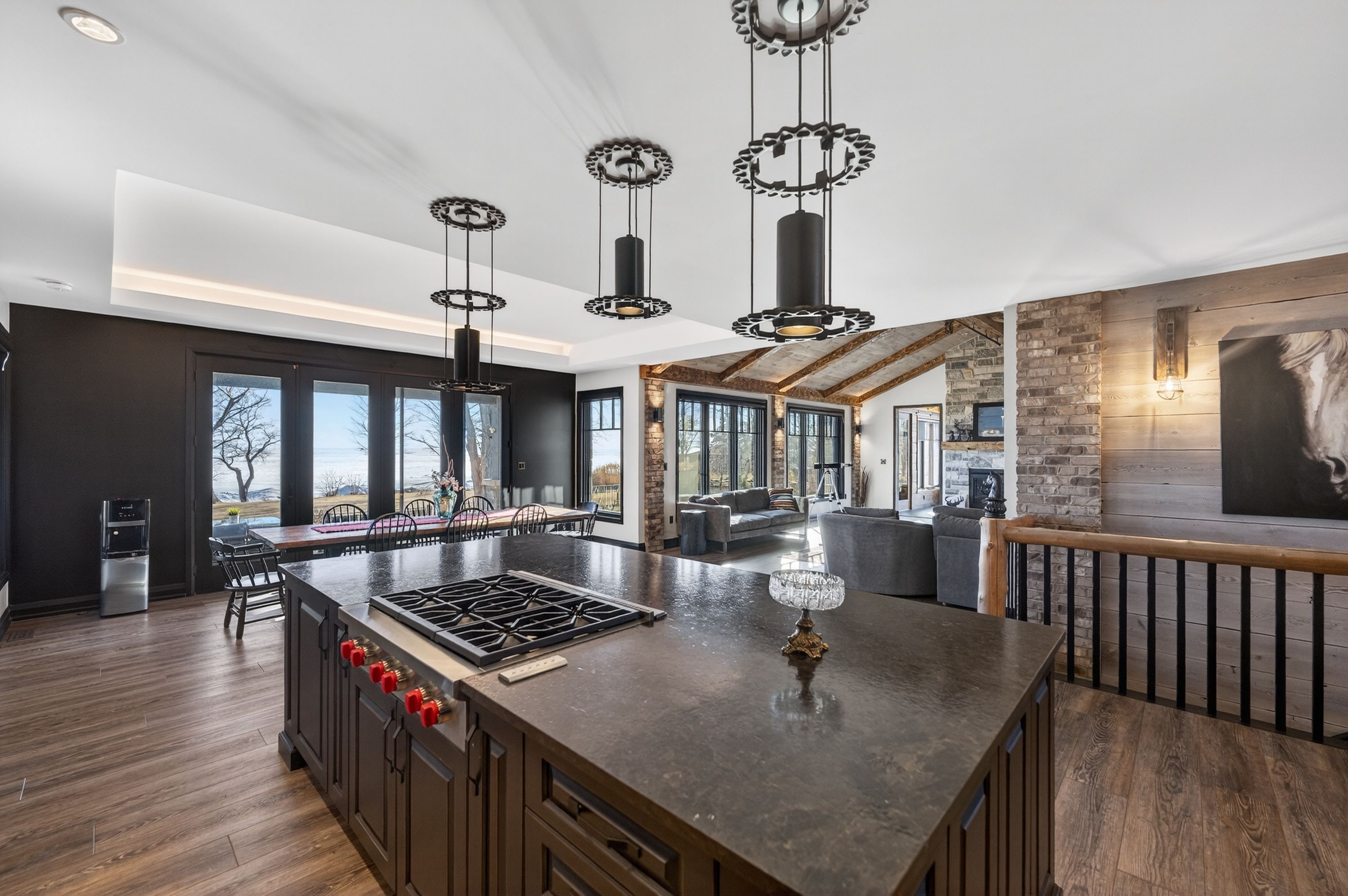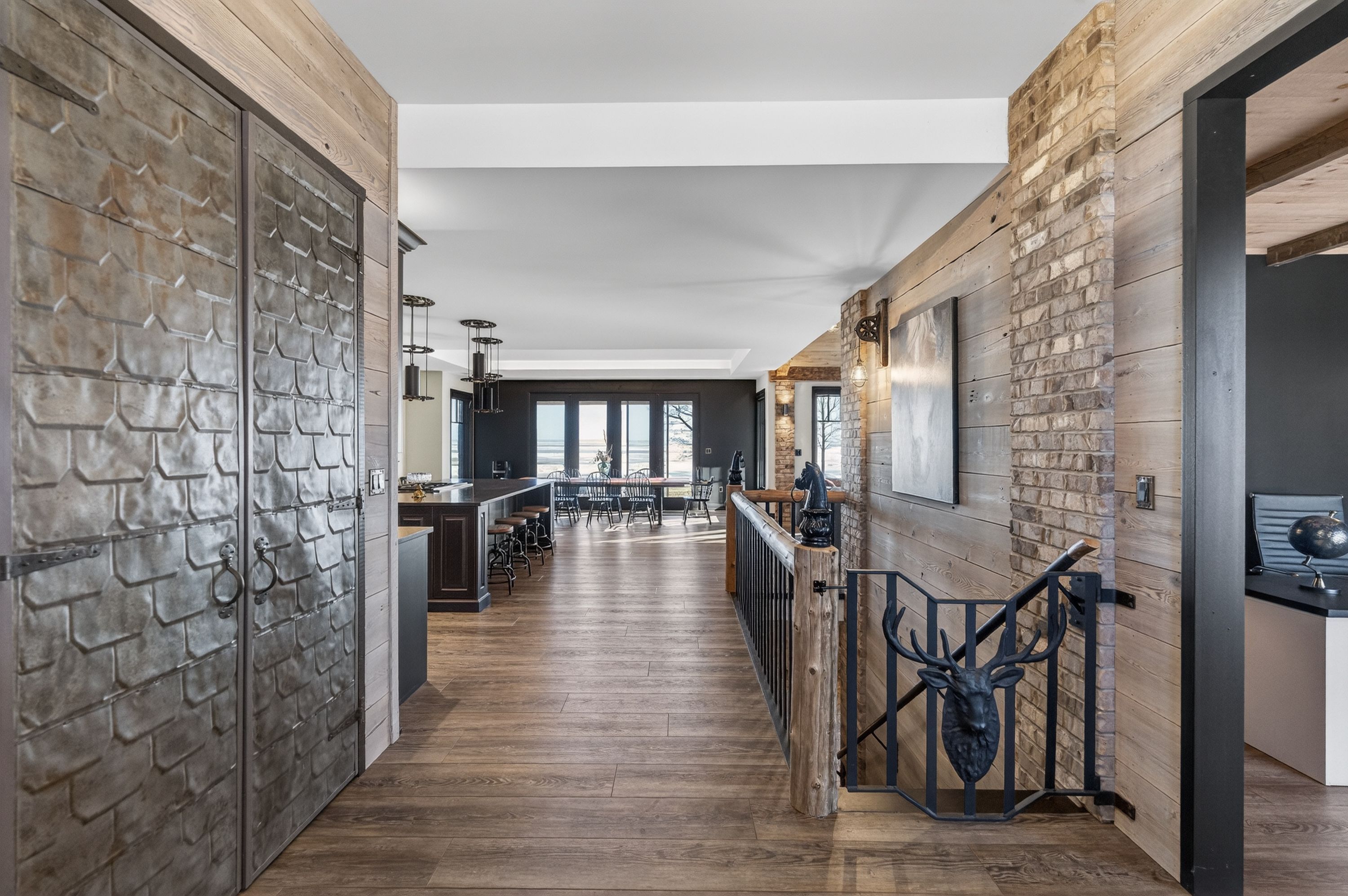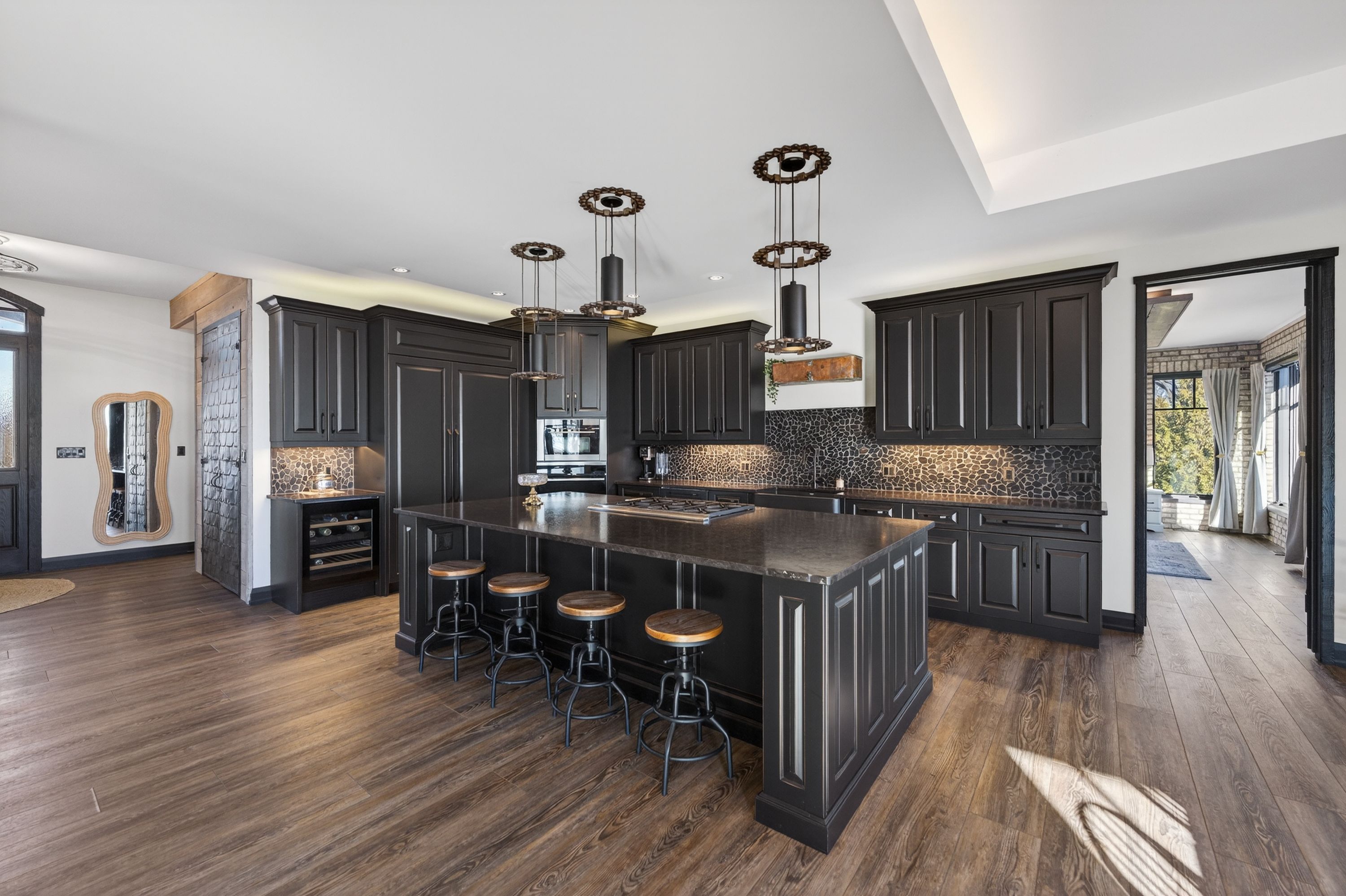 • Kitchen features high-end appliances, large island, and custom repurposed door.